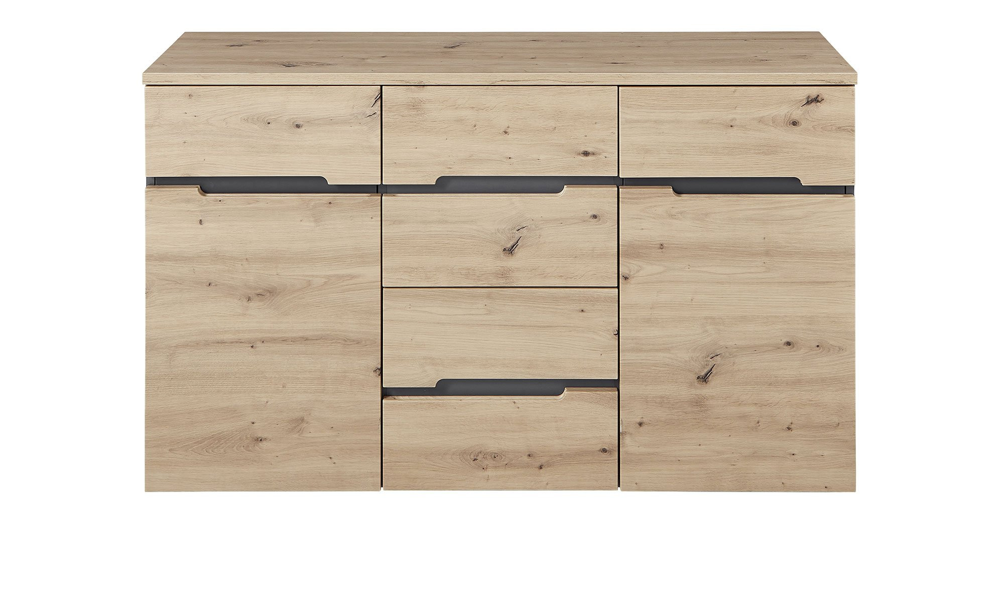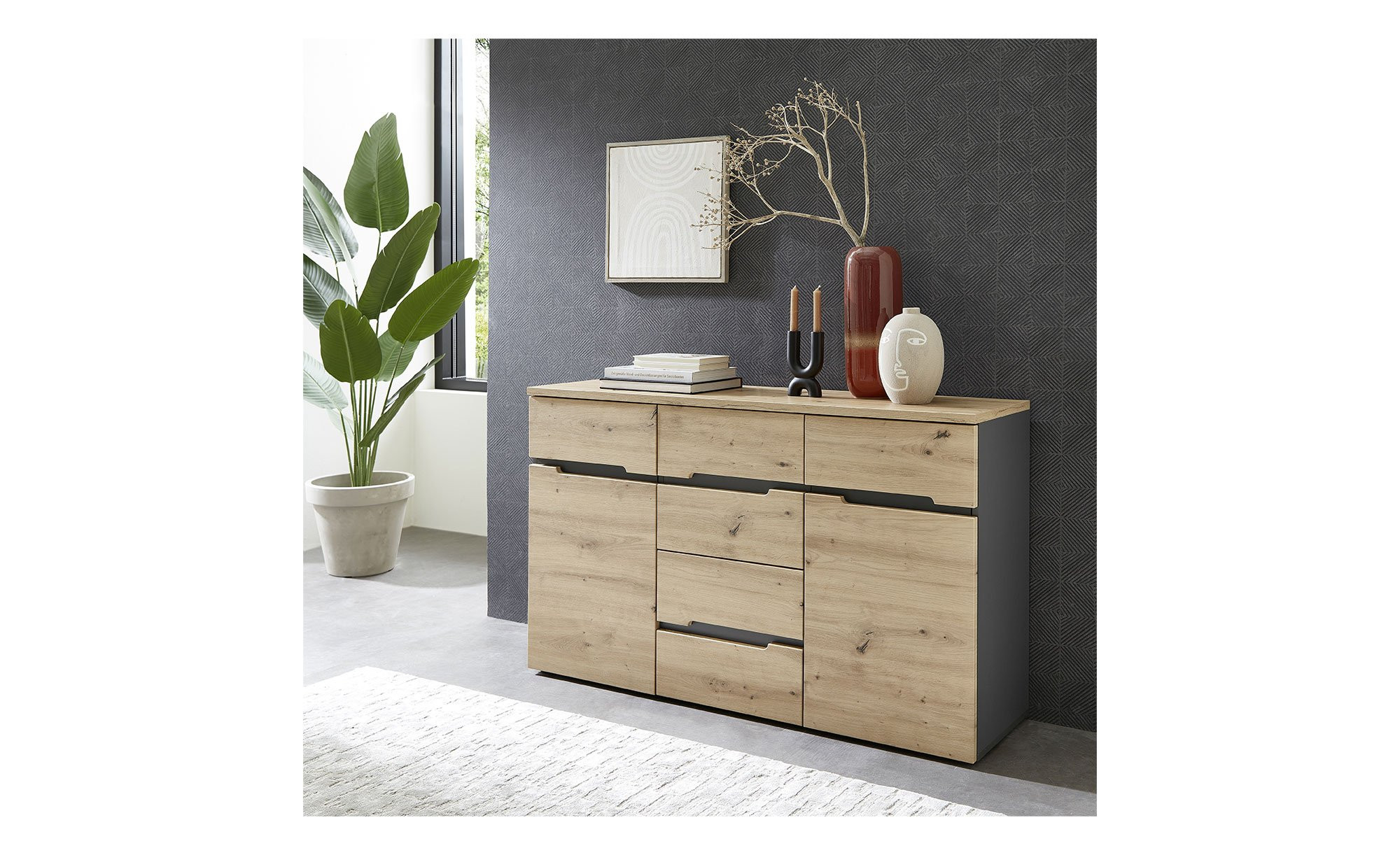Der Korpus der Kommode besteht aus Holzwerkstoff und ist in einem eleganten Graphit-Farbton gestaltet. Die MDF-Fronten und der Oberboden wurden mit einem Artisan Eiche-Dekor versehen, was dem Artikel eine natürliche Note verleiht. Griffausfräsungen an den Türen tragen zur stilvollen Optik bei.