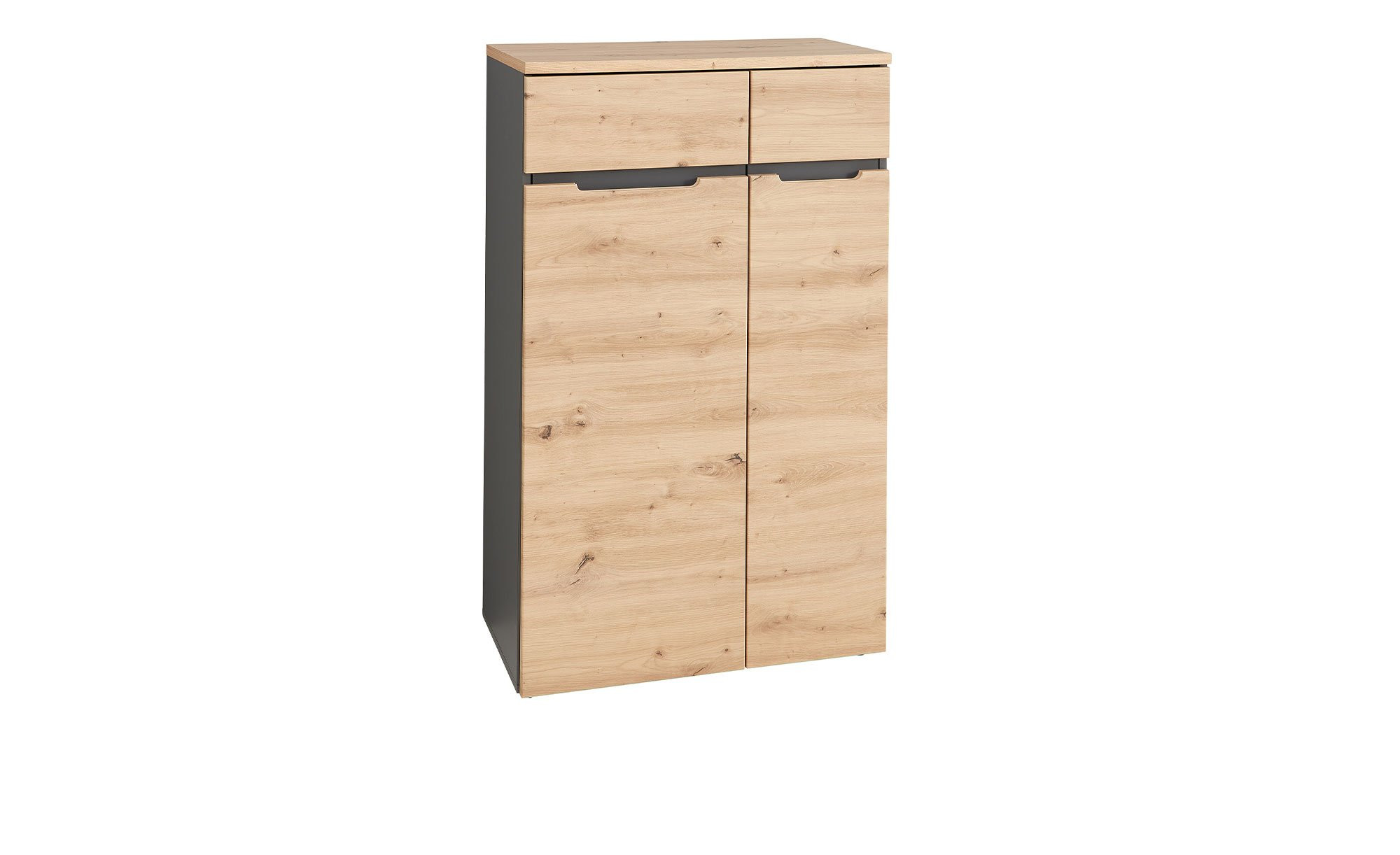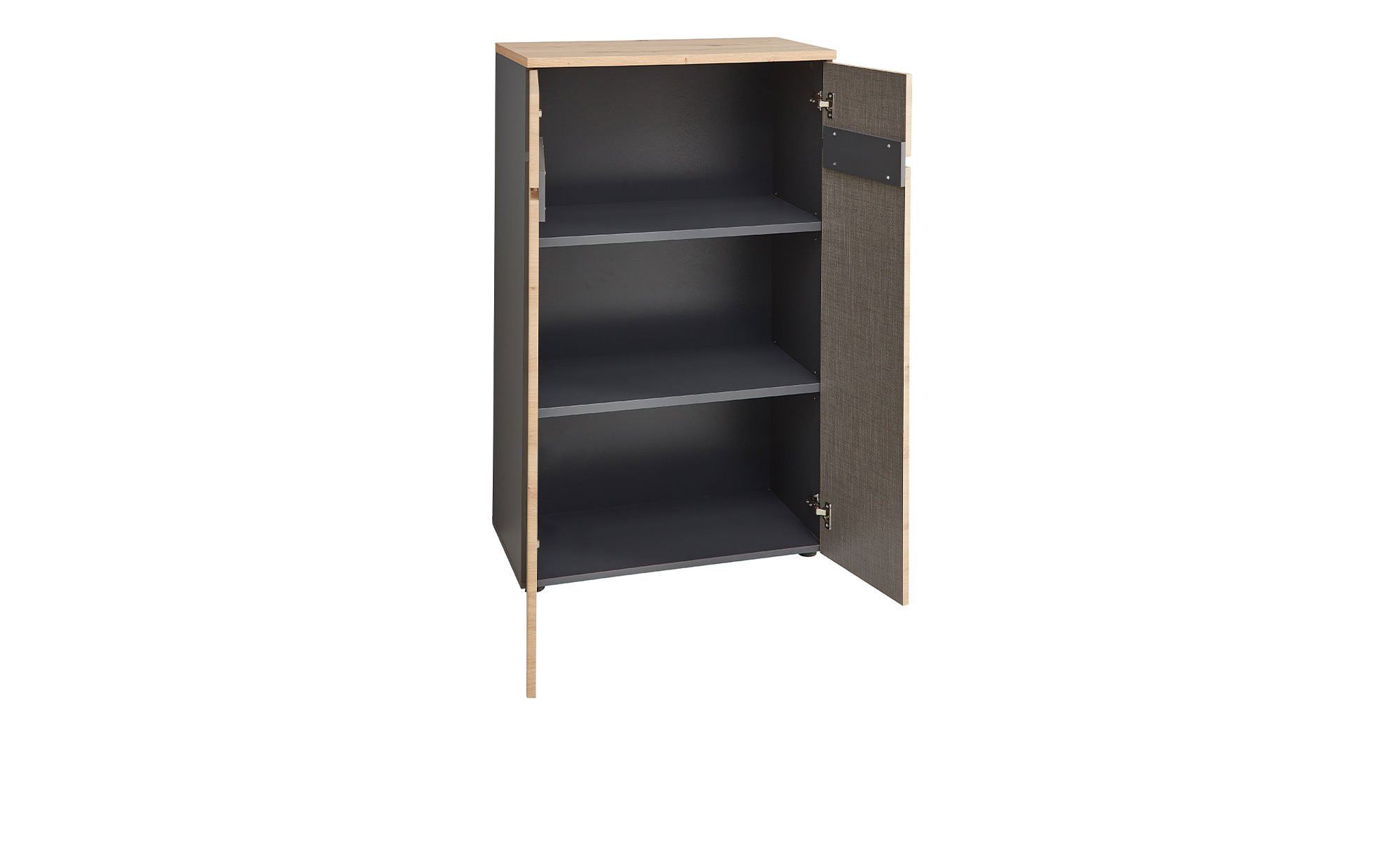 Während der aus Holzwerkstoff gefertigte Korpus, die Rückwand und das Innendekor des ca. 75 x 122 x 38 cm großen Möbels in einem wertigen Graphit-Ton begeistern, setzt die MDF-Front im Dekor Artisan Eiche einen gelungenen Kontrast. Schwarze Kunststoffgleiter wurden als Füße integriert.