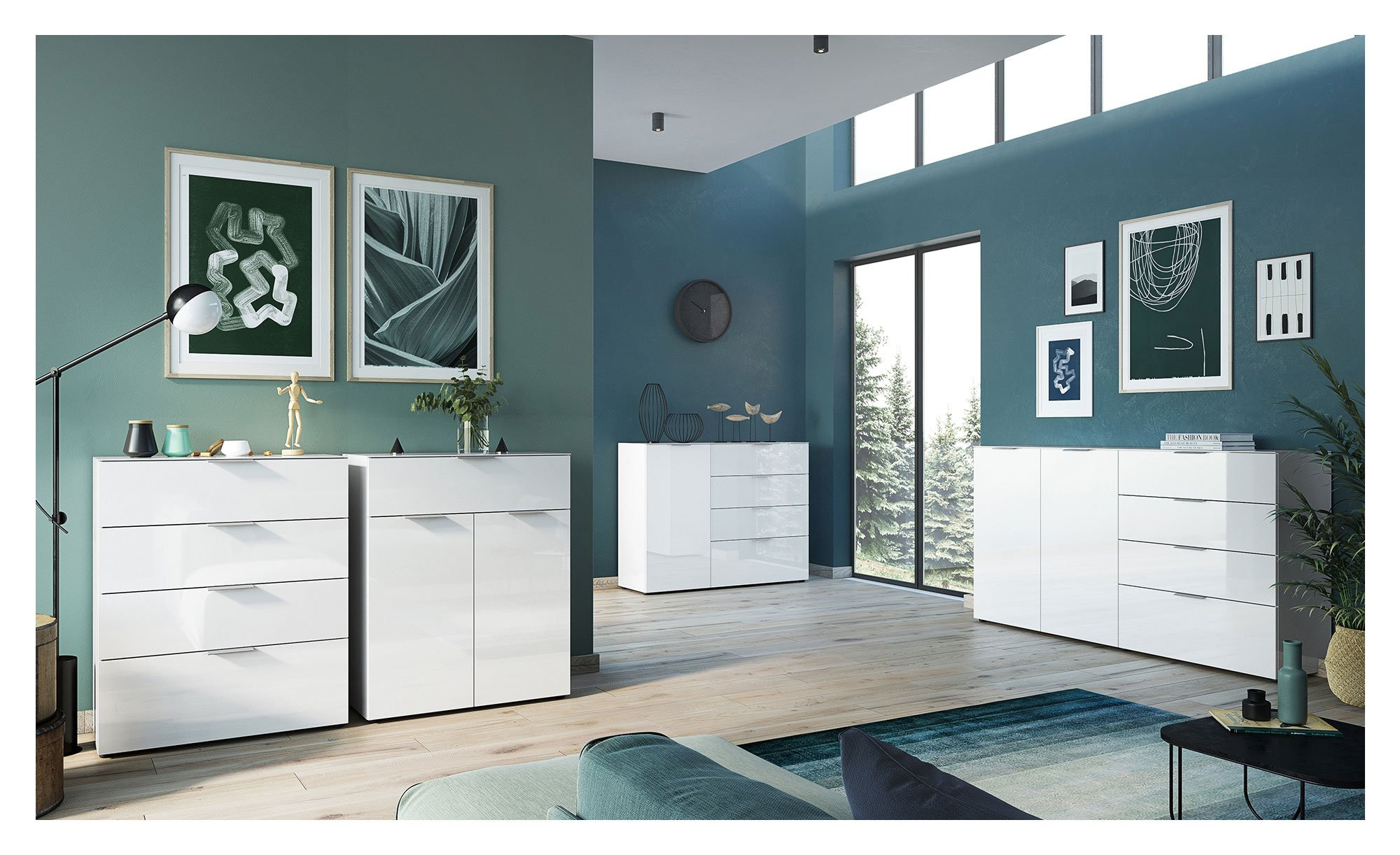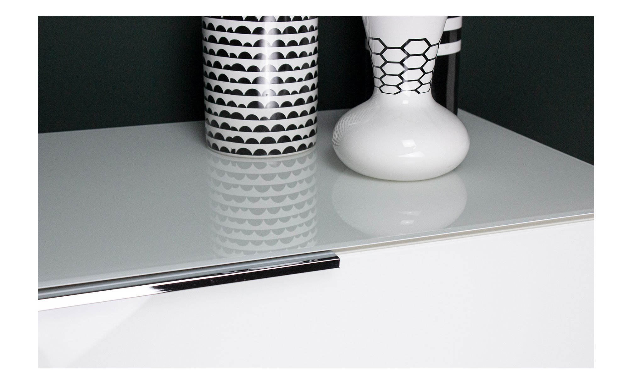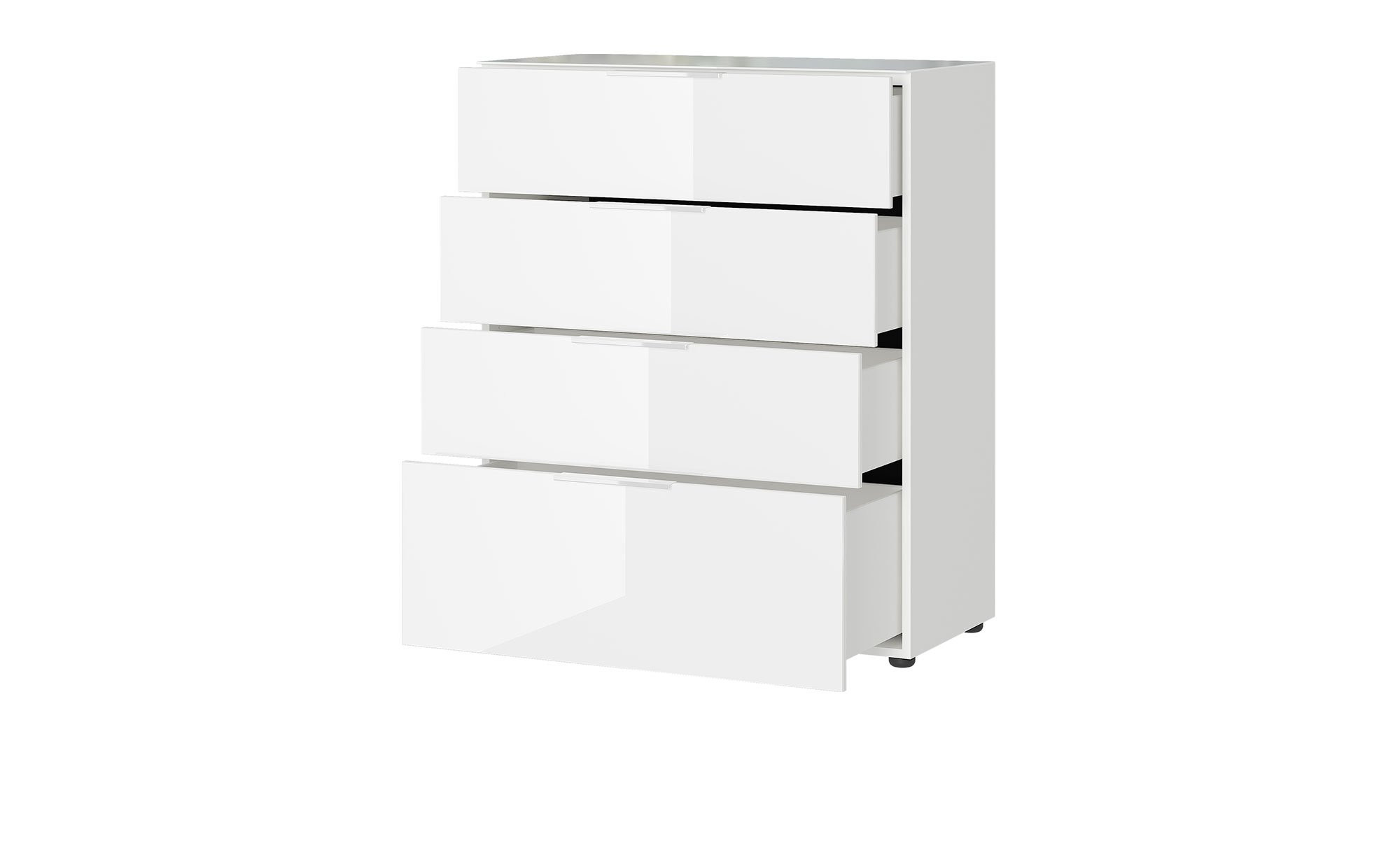 Das ansonsten ganz in Weiß gehaltene Möbelstück ist mit schwarzen Kunststofffüßen und Metallgriffen in Chrom-Optik ausgestattet. Letztere erleichtern Ihnen das Öffnen der vier angenehm geräuscharmen Soft-Close-Schubkästen.