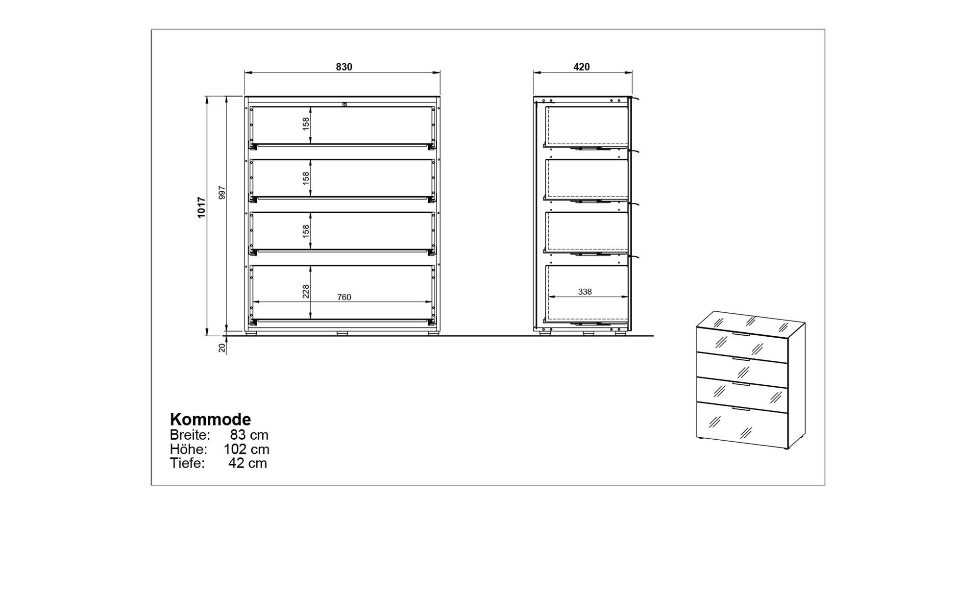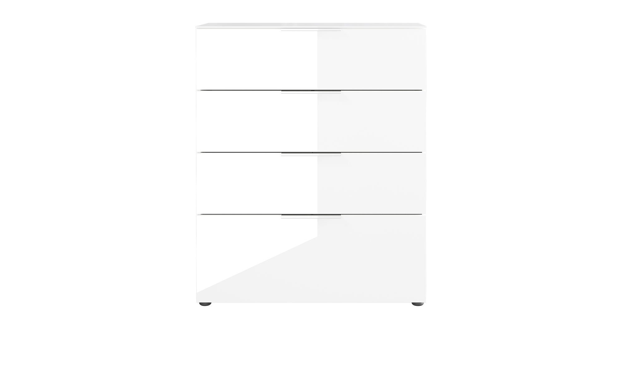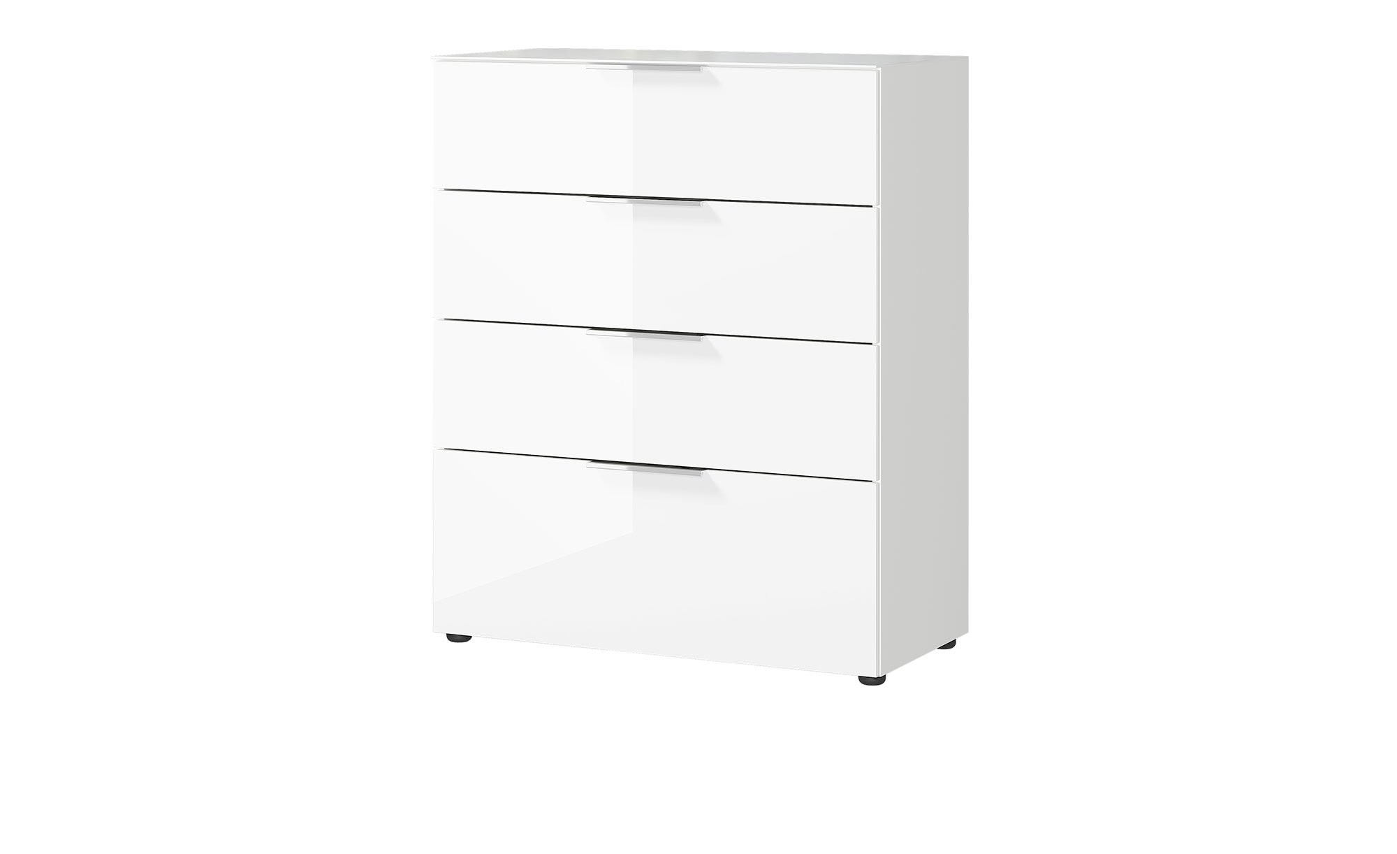 Das ansonsten ganz in Weiß gehaltene Möbelstück ist mit schwarzen Kunststofffüßen und Metallgriffen in Chrom-Optik ausgestattet. Letztere erleichtern Ihnen das Öffnen der vier angenehm geräuscharmen Soft-Close-Schubkästen.