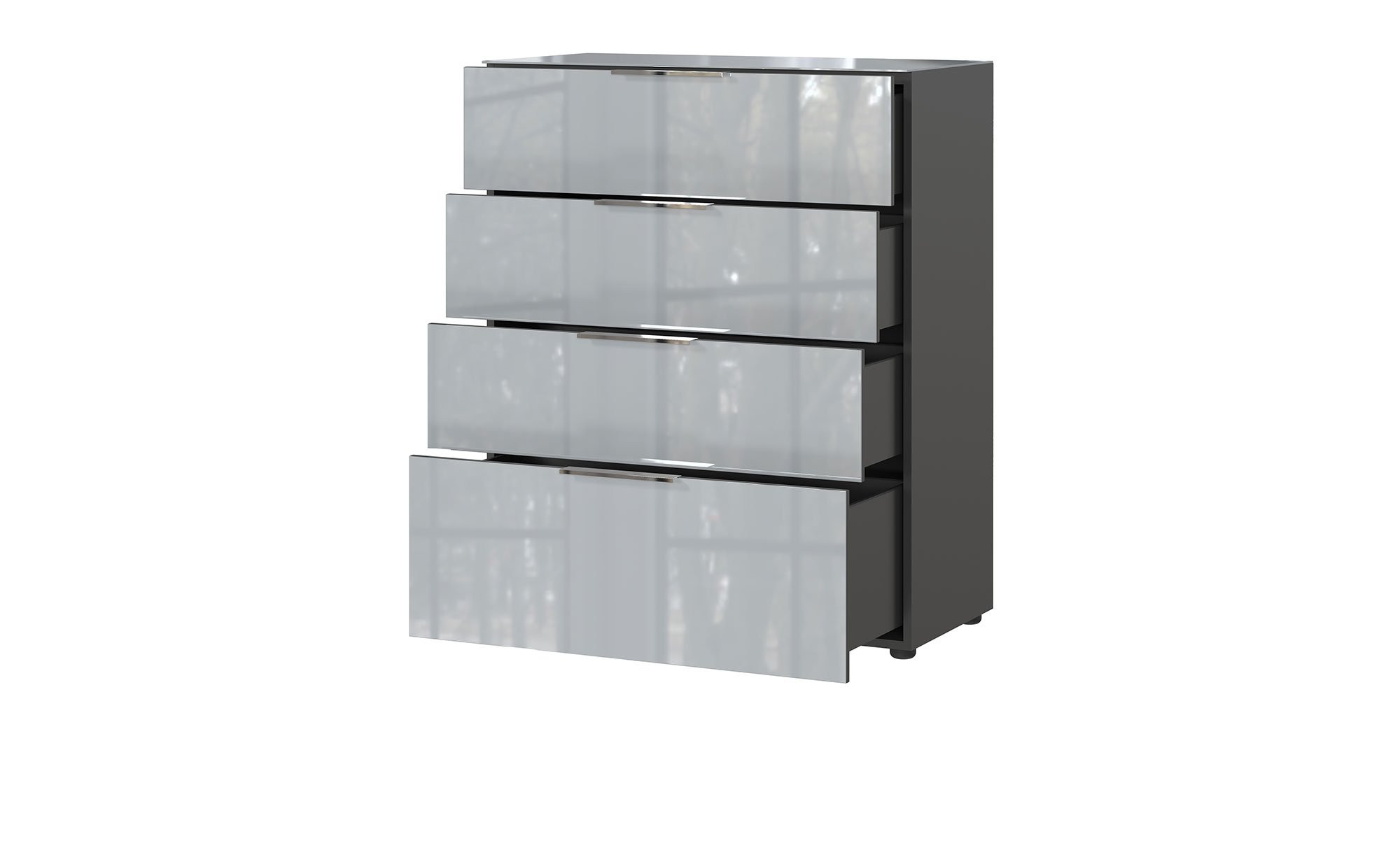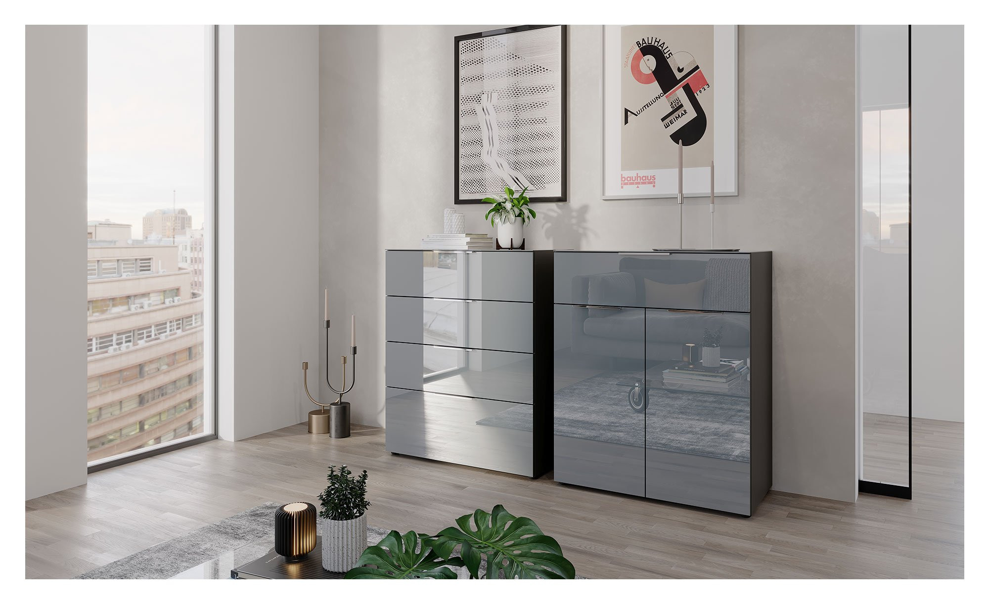 An der silbergrauen Front des ca. 83 x 102 x 42 cm großen Artikels wurde eine Auflage aus Einscheibensicherheitsglas integriert. Diese punktet mit ihrer hohen Widerstandskraft und beugt genau wie die Melaminharzbeschichtung des graphitfarbigen Korpus‘ Verschleiß vor. Hochwertige ABS-Kanten sorgen ebenfalls für eine lange Haltbarkeit des Möbels.