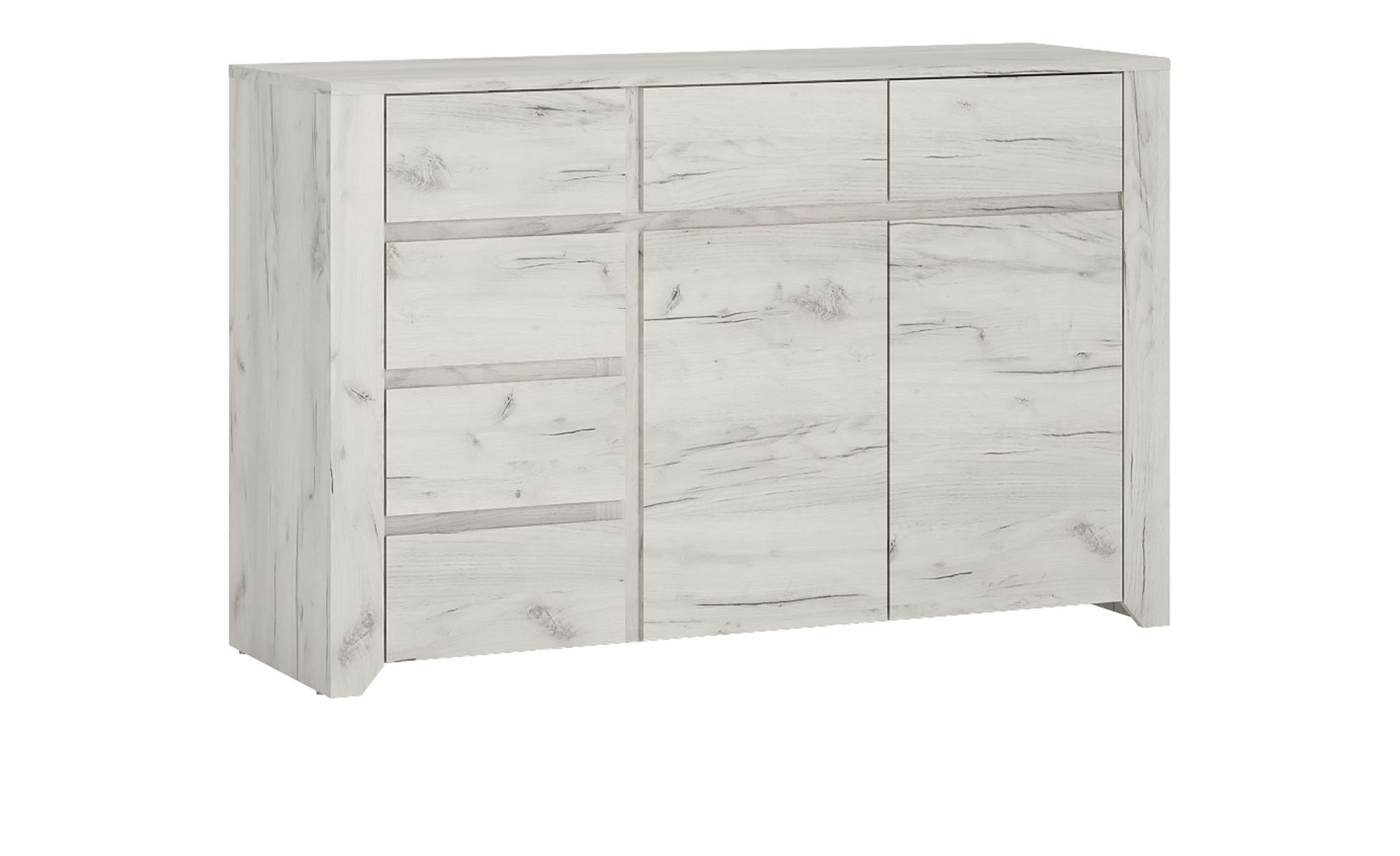 Sowohl der Korpus als auch die Fronten der ca. 119 x 77 x 40 cm großen Kommode wurden aus Holzwerkstoff gefertigt und im Dekor Weißeiche gestaltet. Eine Beschichtung mit Melaminharz macht die Oberflächen unempfindlich gegenüber Schmutz und Kratzern. Schwarze Kunststofffüße runden das Bild ab.