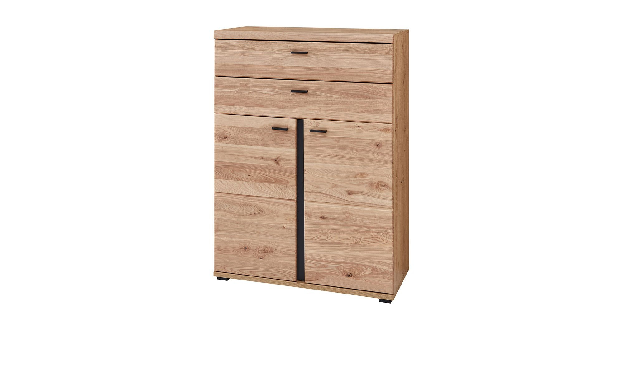 An der Front des ca. 90 x 124 x 38 cm großen Möbelstücks erwartet Sie massive Altesche samt gebürsteter Oberfläche. Der Korpus besteht hingegen aus Holzwerkstoff und begeistert mit einer natürlichen Old Artisan Eiche Nachbildung. Auch die Rückwand und das Innendekor sind in einem ansprechenden Holz-Stil designt. Als gelungener Kontrast fungiert die matt schwarze Absetzung. Auch die Kunststofffüße und Metallgriffe tragen diese Farbe.