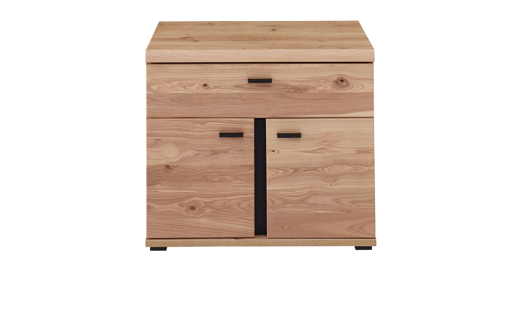 Das ca. 77 x 67 x 38 cm große Möbelstück verfügt über eine Front aus massiver Altesche mit gebürsteter Oberfläche. Auch der Holzwerkstoff-Korpus mit Old Artisan Eiche Nachbildung sowie die Rückwand und das Innendekor im Holz-Look fügen sich ideal in das natürliche Design. Neben einer matt schwarzen Absetzung erzeugen auch die ebenfalls schwarzen Metallgriffe und Kunststofffüße einen stilvollen Kontrast.