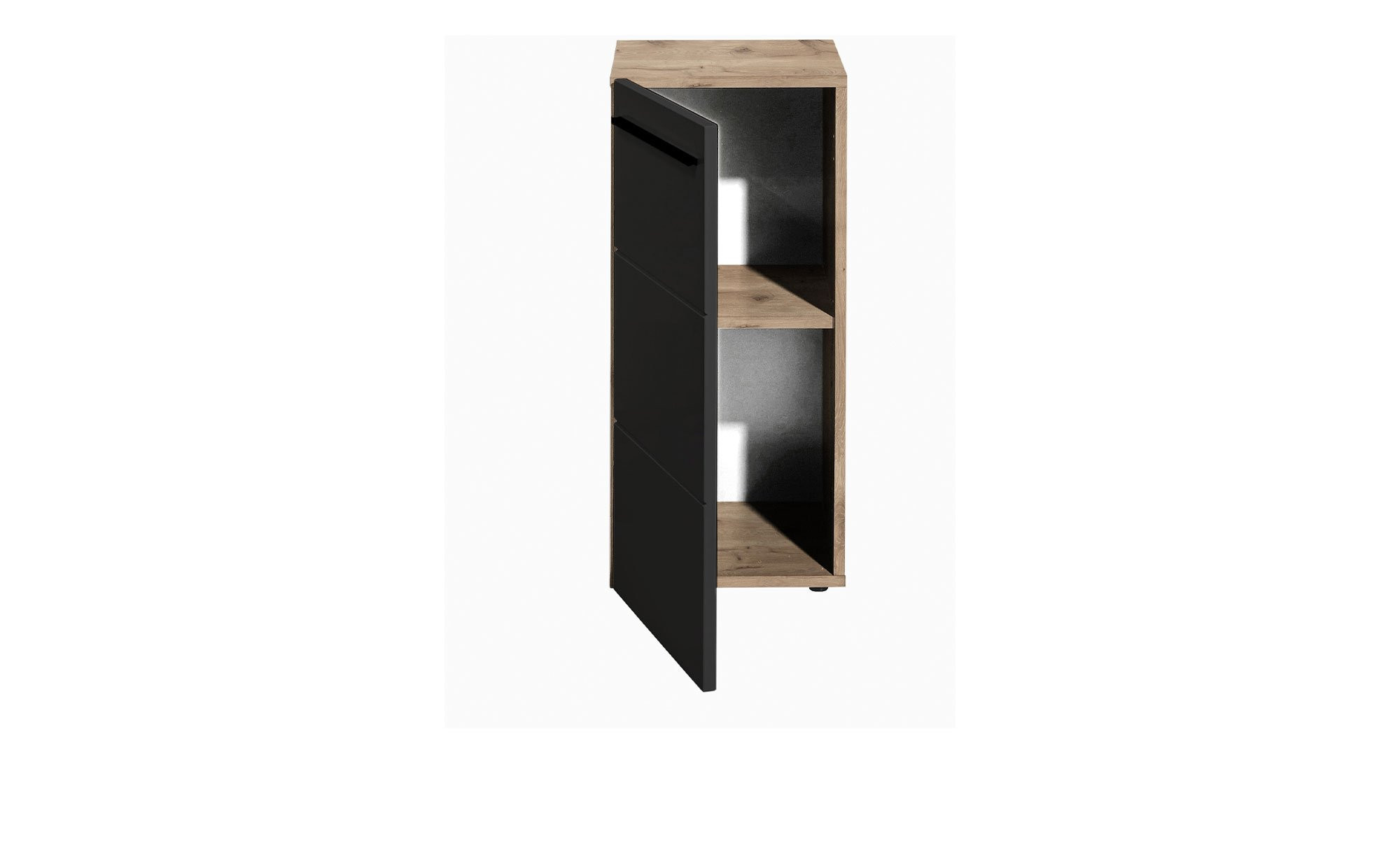 Das Möbelstück misst ca. 34 x 72 x 31 cm und ist am aus Holzwerkstoff bestehenden Korpus im Dekor Viking Oak gehalten. Eine Beschichtung aus Melaminharz schützt hier zuverlässig vor Verschleiß. Die MDF-Front ist hingegen in mattem Schwarz foliert. Auch die Kunststoffgriffe und -füße tragen diese Farbe.