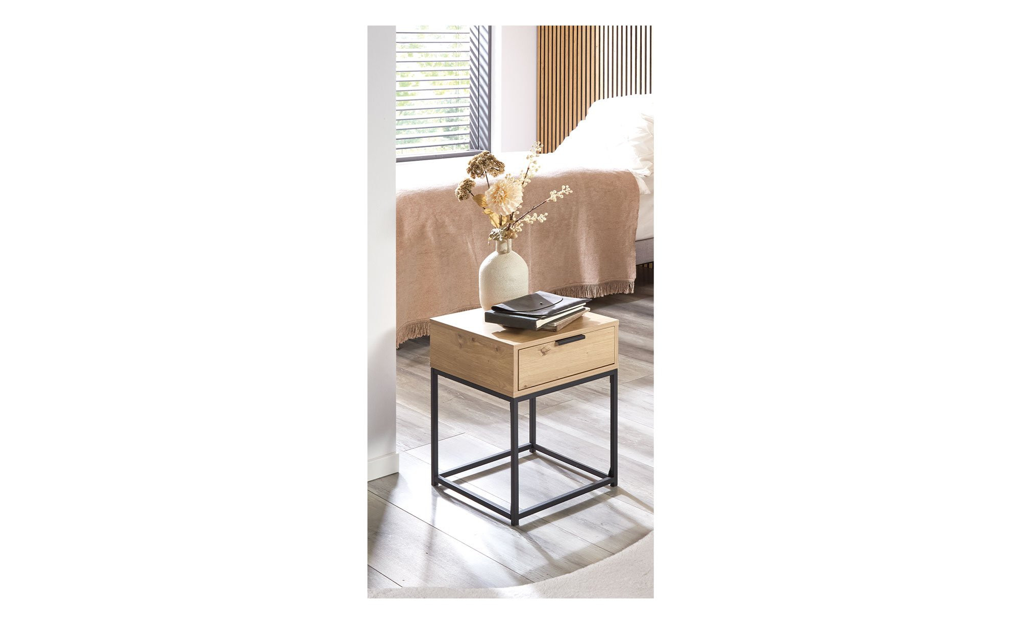 Der ca. 40 x 50 x 40 cm große Artikel besteht aus Holzwerkstoff in einem hellen Eiche-Dekor mit zusätzlichen Farbakzenten. Als filigranes Gestell fungiert schwarzes Stahlrohr.
