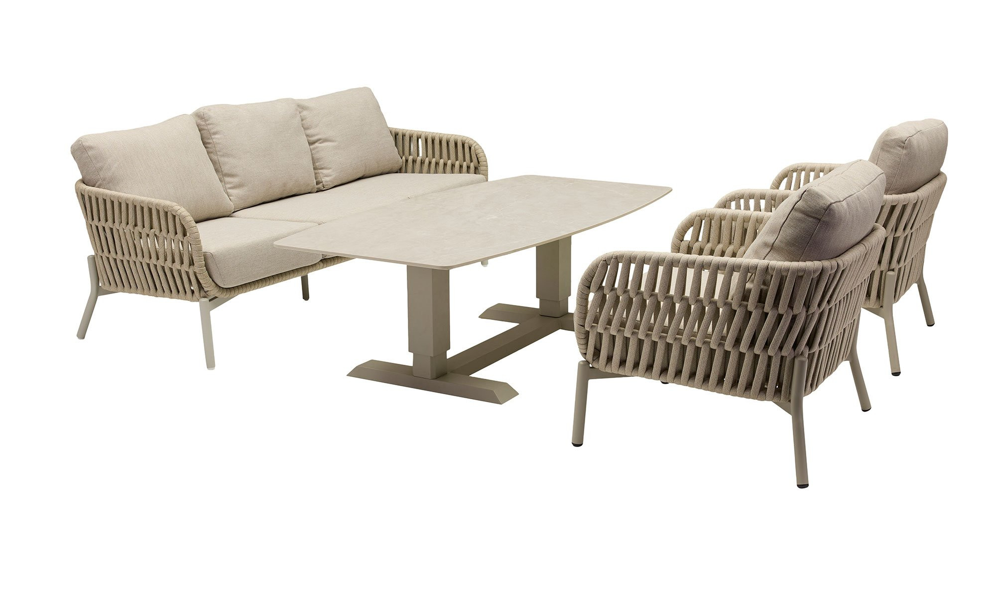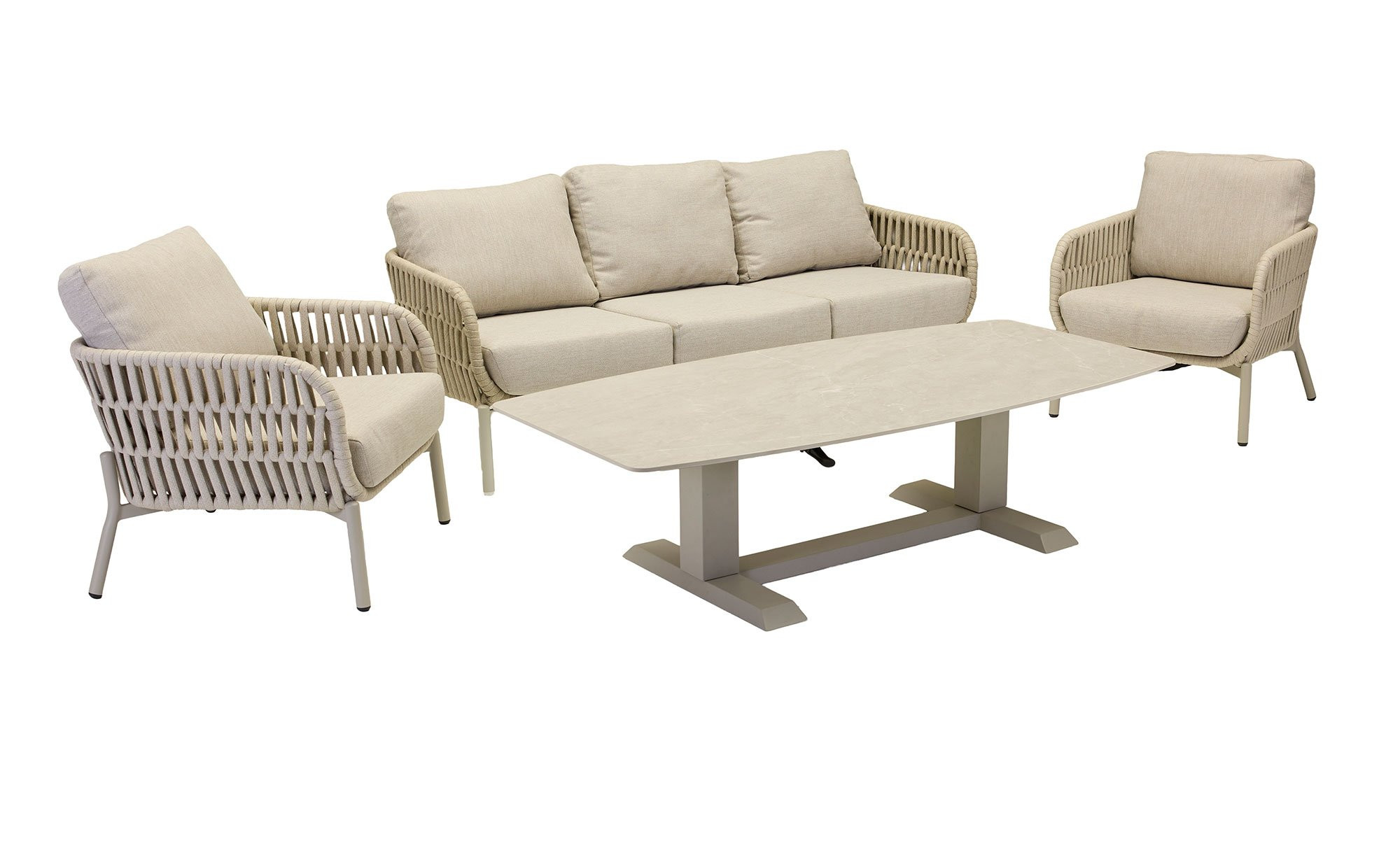 Das ca. 82 x 67 x 82 cm große Gartenmöbelstück steht auf einem stabilen, vierfüßigen Aluminiumgestell. Dieses ist in einem ansprechenden Taupe-Ton gehalten. Für den extra tiefen und bequemen Sitz sorgt ein Geflecht aus leicht elastischem Seil in einem natürlich abgestimmten Farbton. Zusätzlich gehört eine passende Auflage mit beigem Olefin-Bezug zum Lieferumfang.