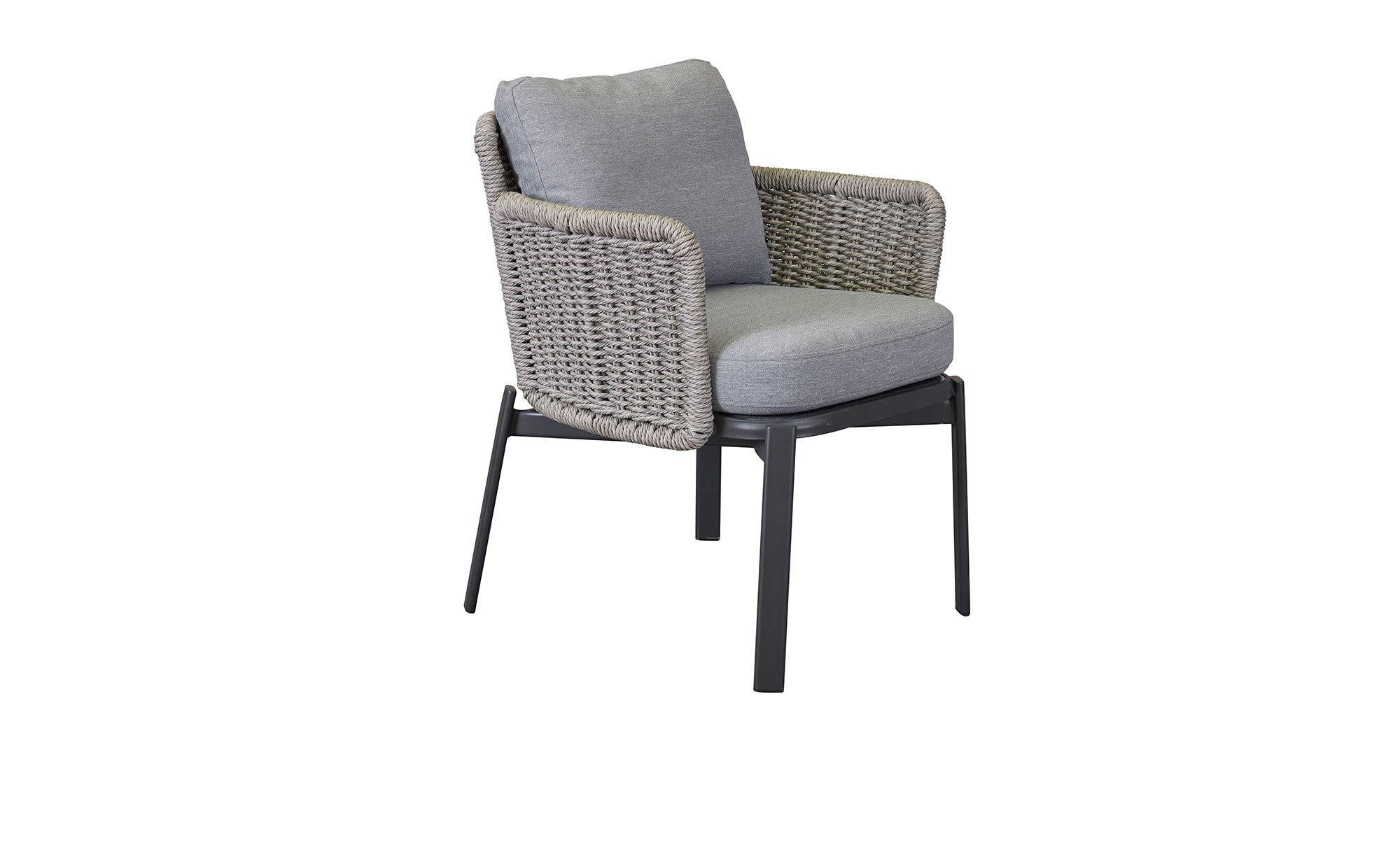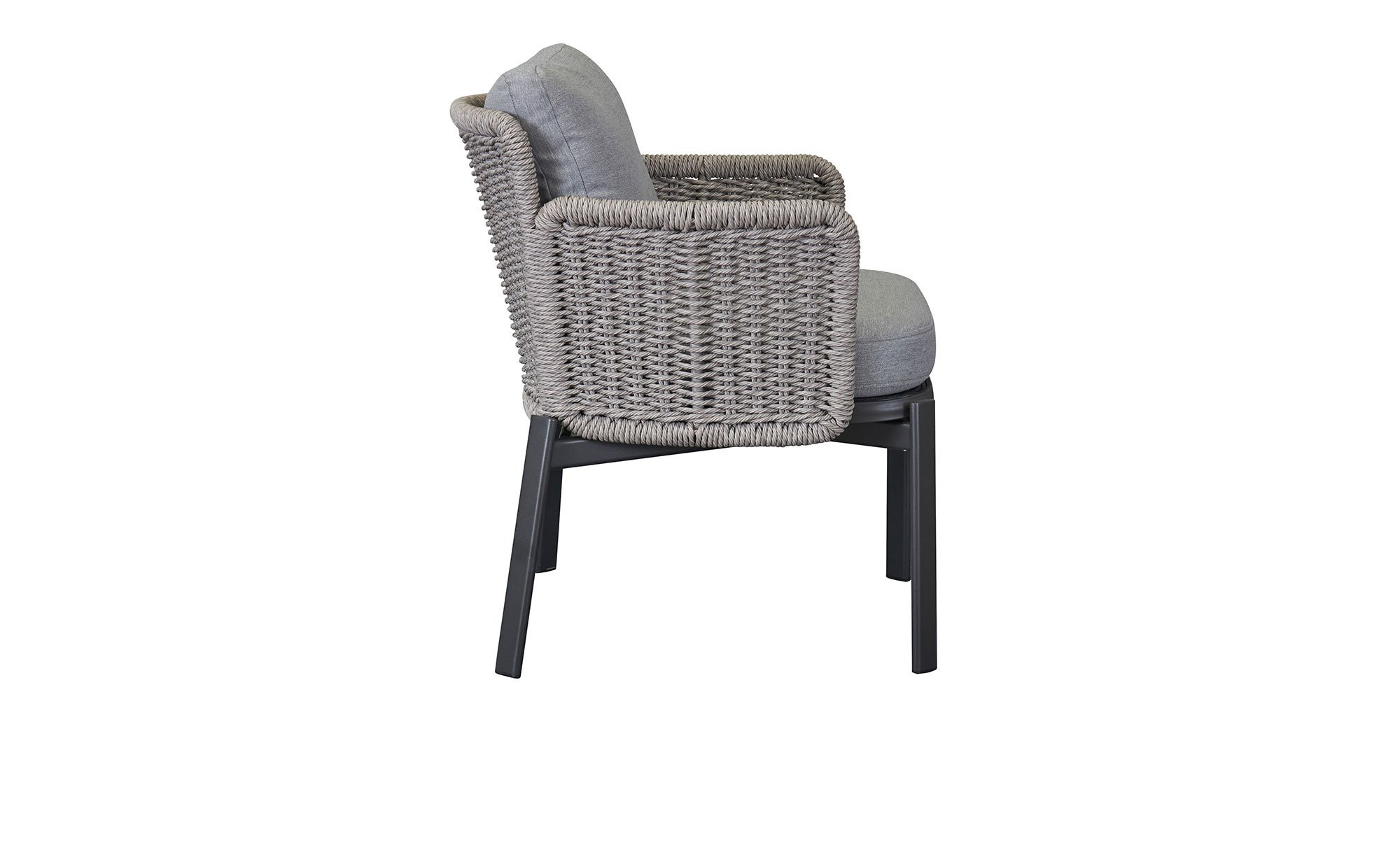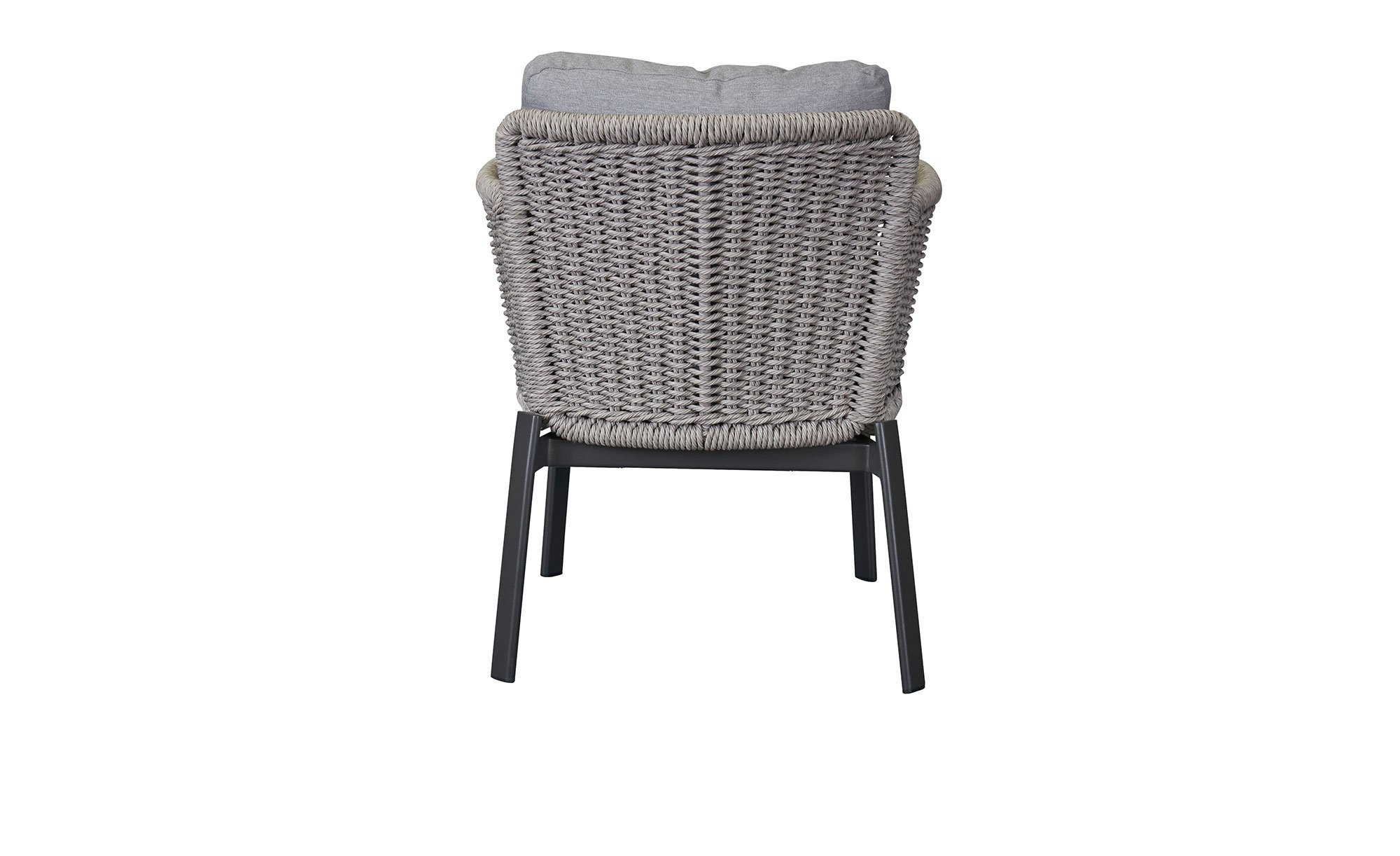Der LC Garden Gartenstuhl Catalina verfügt über ein stabiles Aluminiumgestell mit vier Füßen. Es ist in einem edlen Anthrazit gehalten und harmoniert ideal mit der grauen Umrandung aus Seil. Auch die Auflagen aus hellgrauem Olefin fügen sich stimmig ins Gesamtbild.