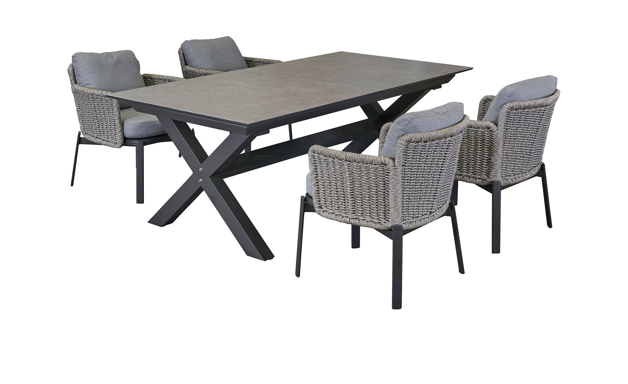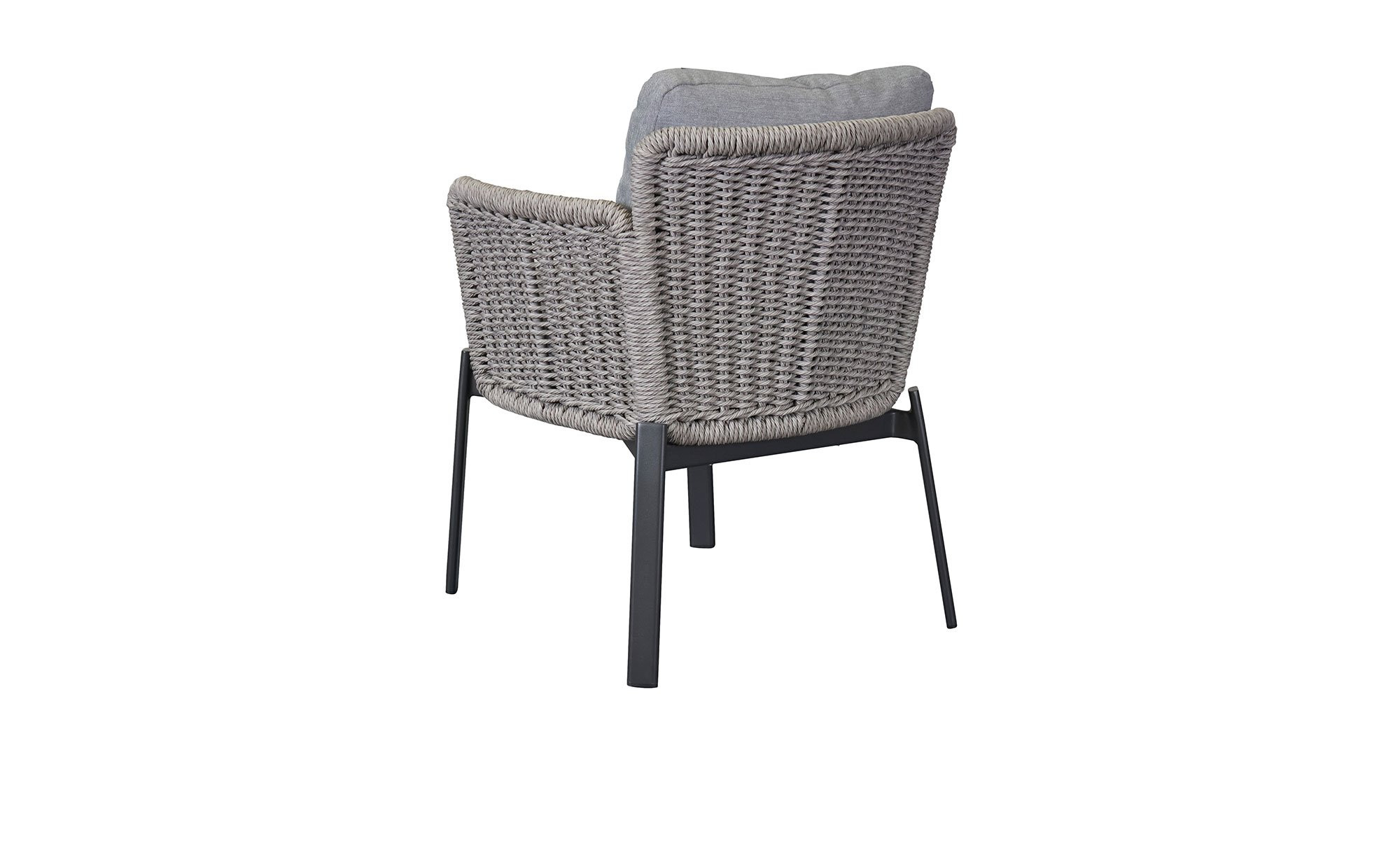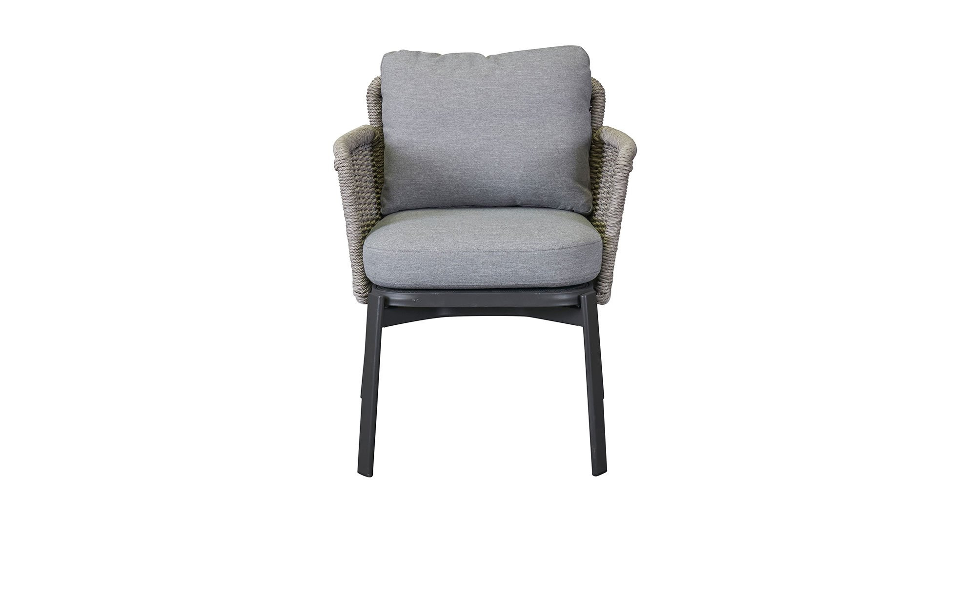 Der LC Garden Gartenstuhl Catalina verfügt über ein stabiles Aluminiumgestell mit vier Füßen. Es ist in einem edlen Anthrazit gehalten und harmoniert ideal mit der grauen Umrandung aus Seil. Auch die Auflagen aus hellgrauem Olefin fügen sich stimmig ins Gesamtbild.