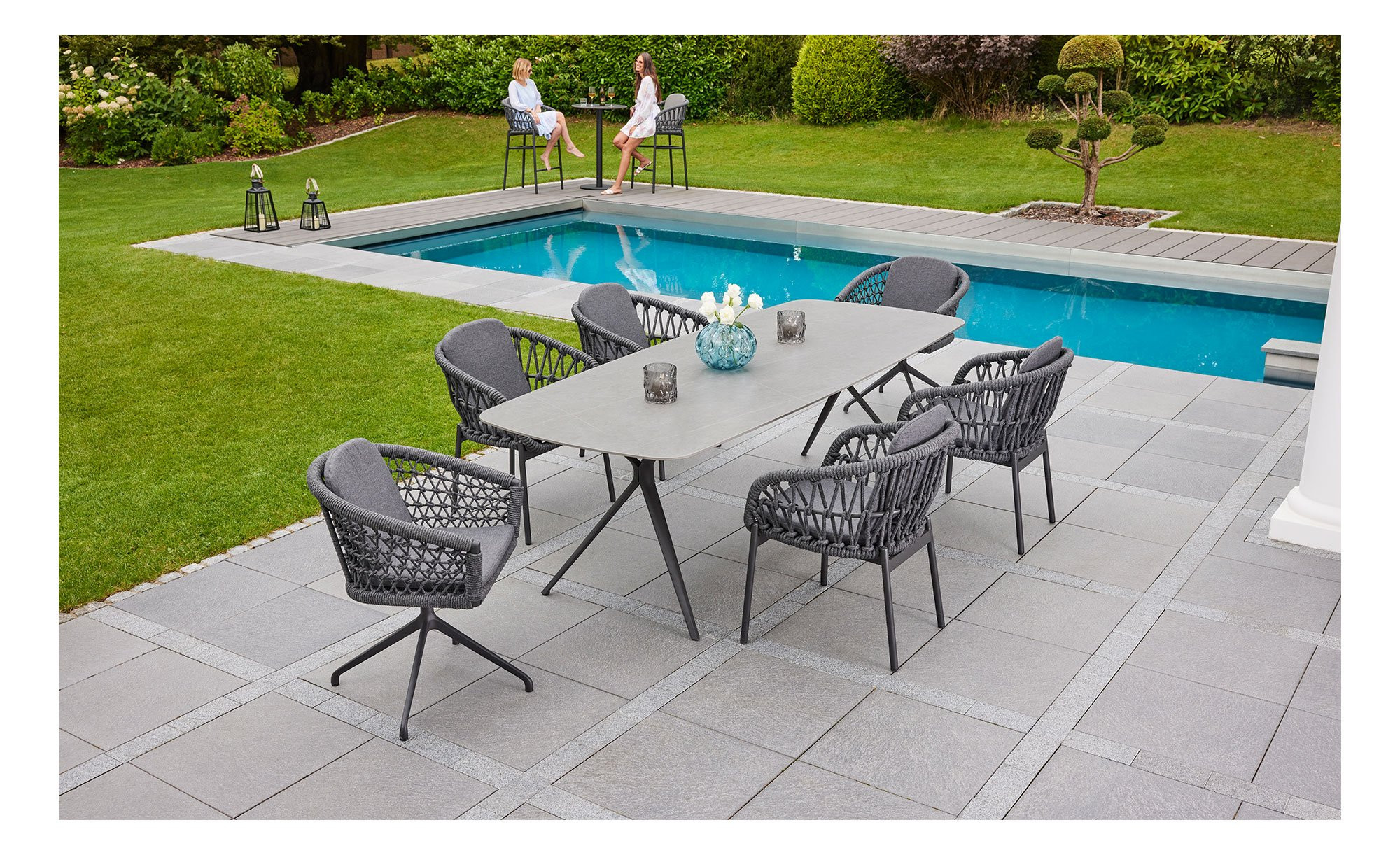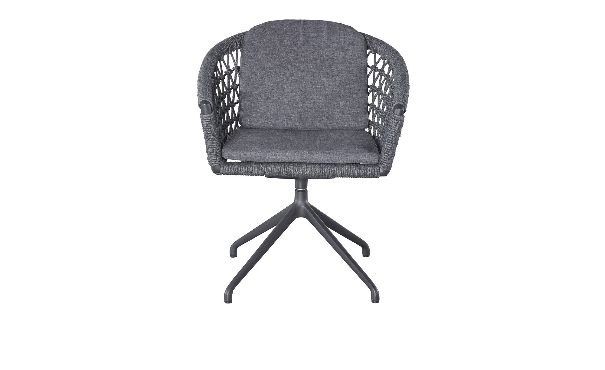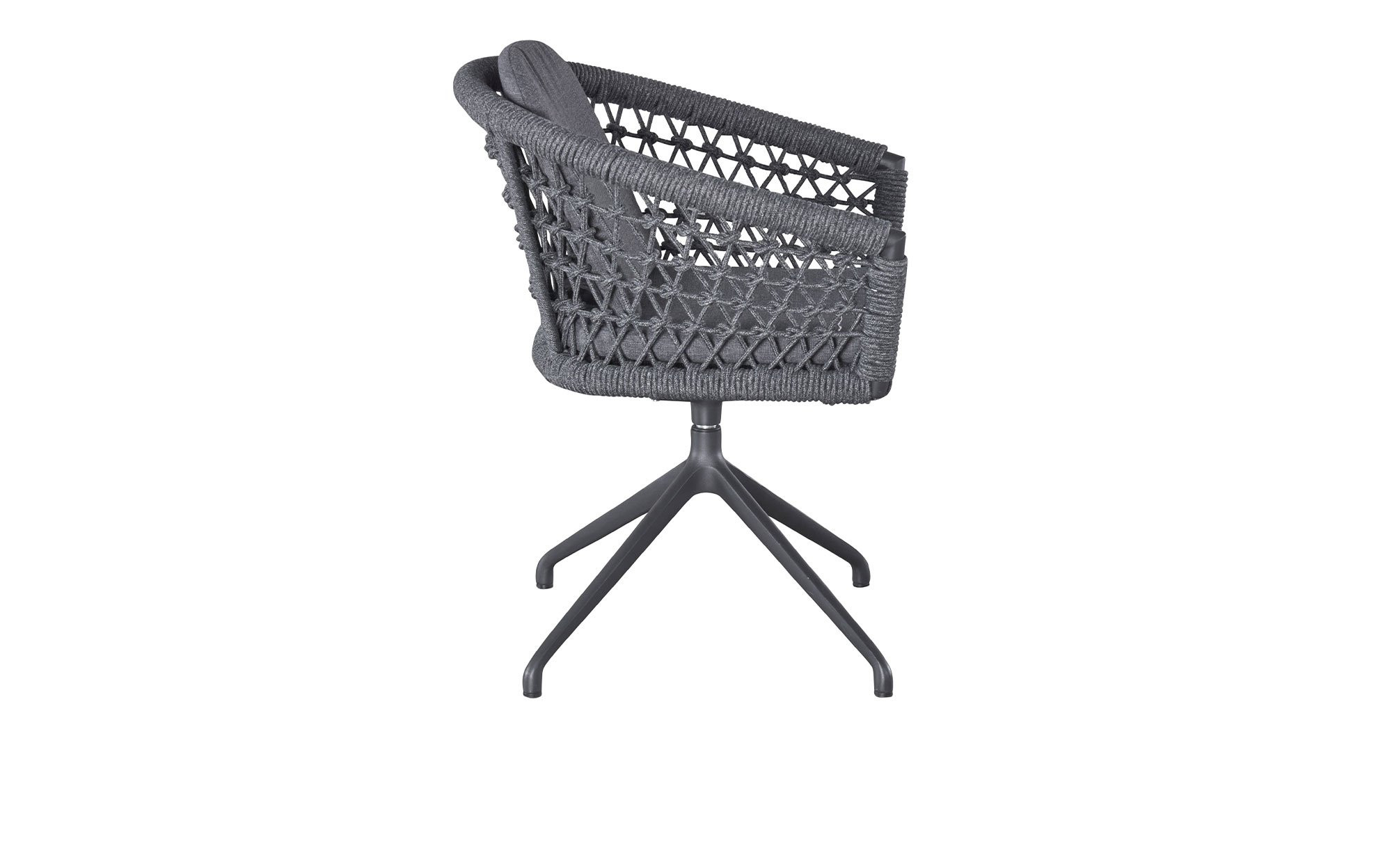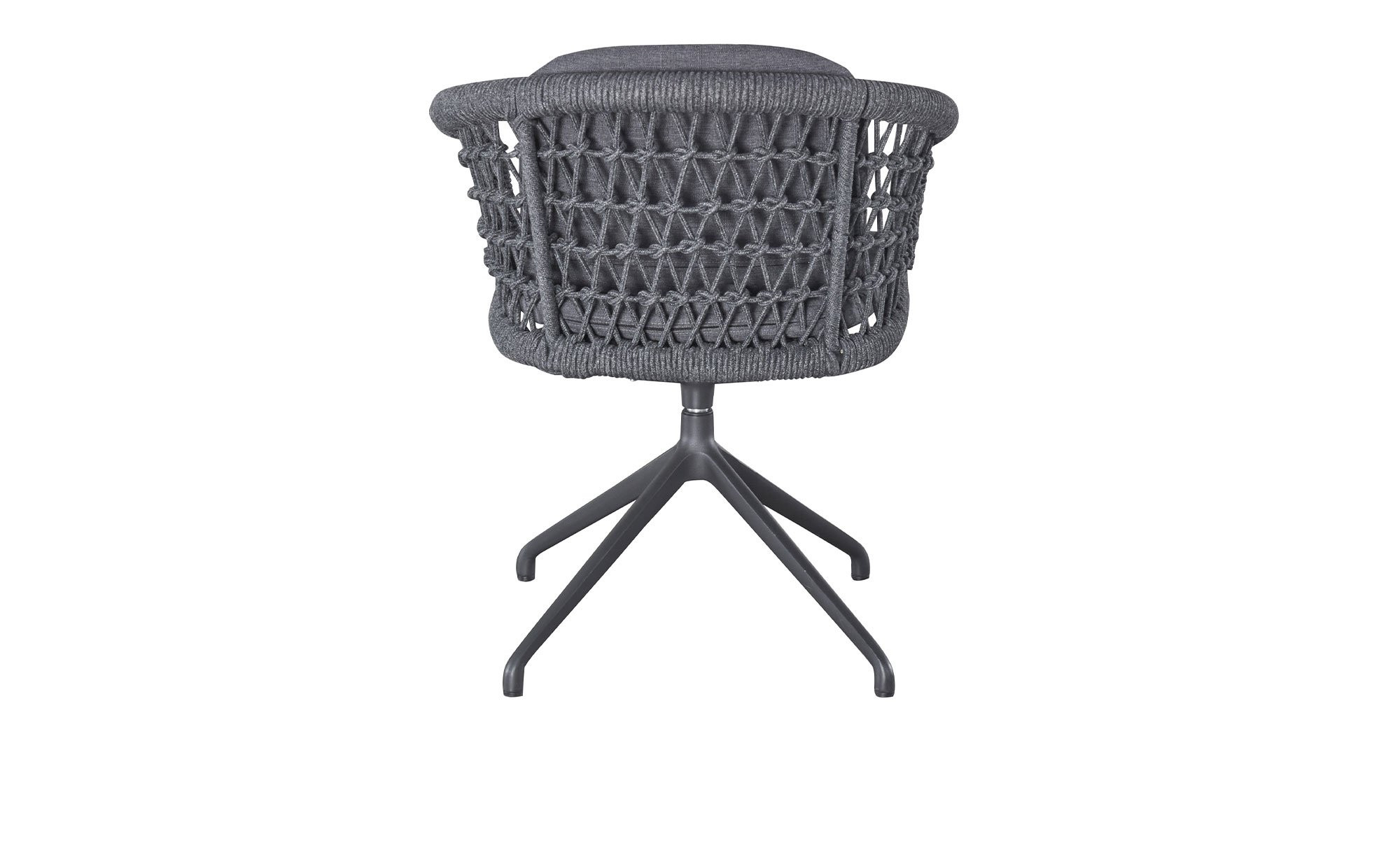 Weiter oben erwartet Sie die großzügig geformte Sitzschale mit einer Bespannung aus dunkelgrauem Rope. Sie ist um 360° drehbar, sodass Sie stets Ihre bevorzugte Position einnehmen können. Passend zum ca. 64 x 78 x 53 cm großen LC Garden Stuhl werden auch wetterfeste und UV-beständige Sitz- und Rückenkissen geliefert. Ihr Bezug aus Olefin-Stoff ist ebenfalls dunkelgrau.