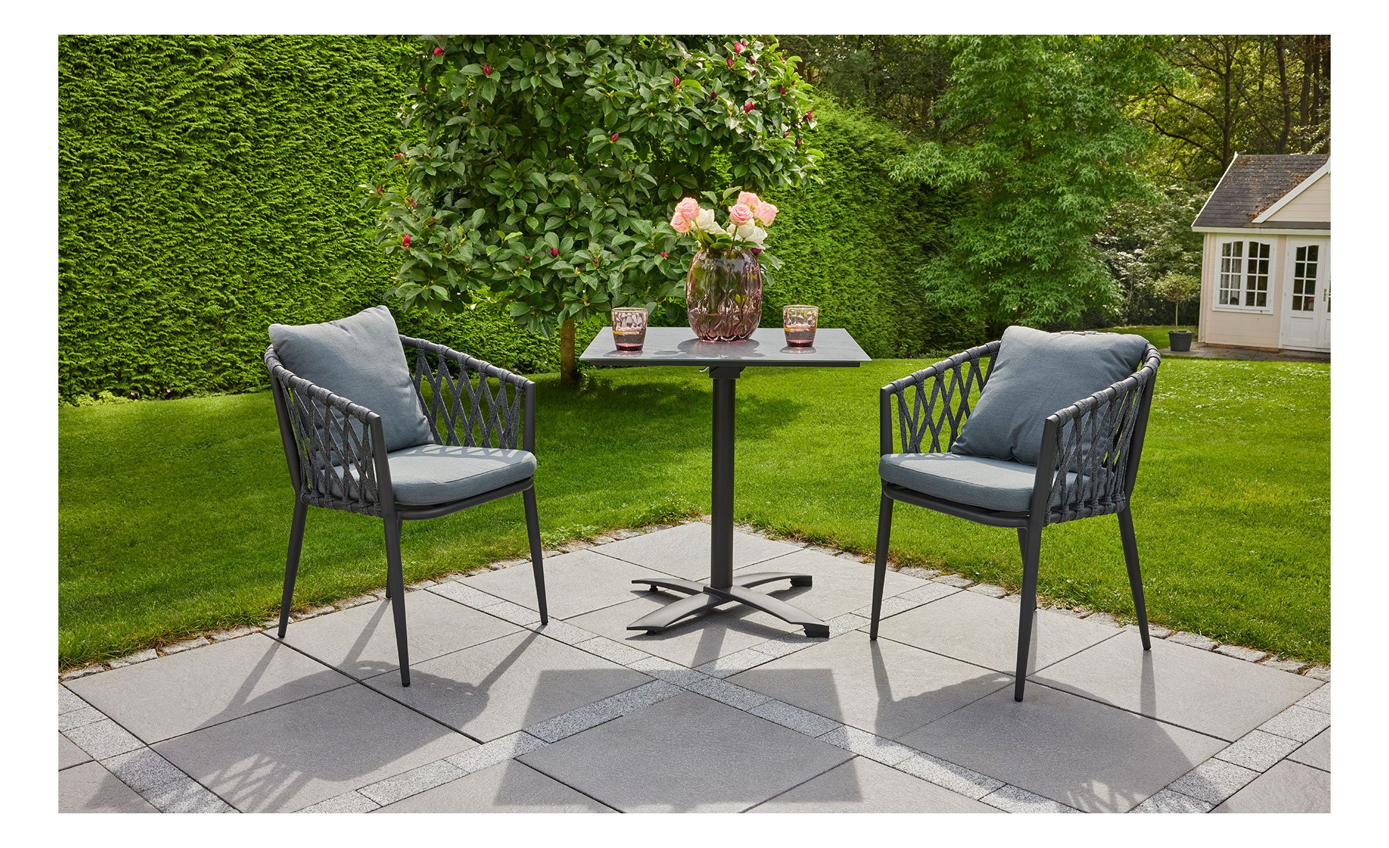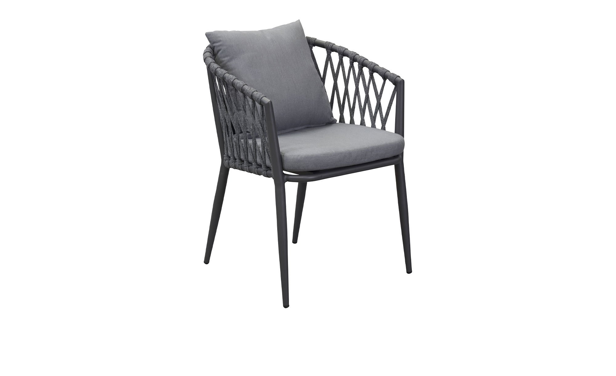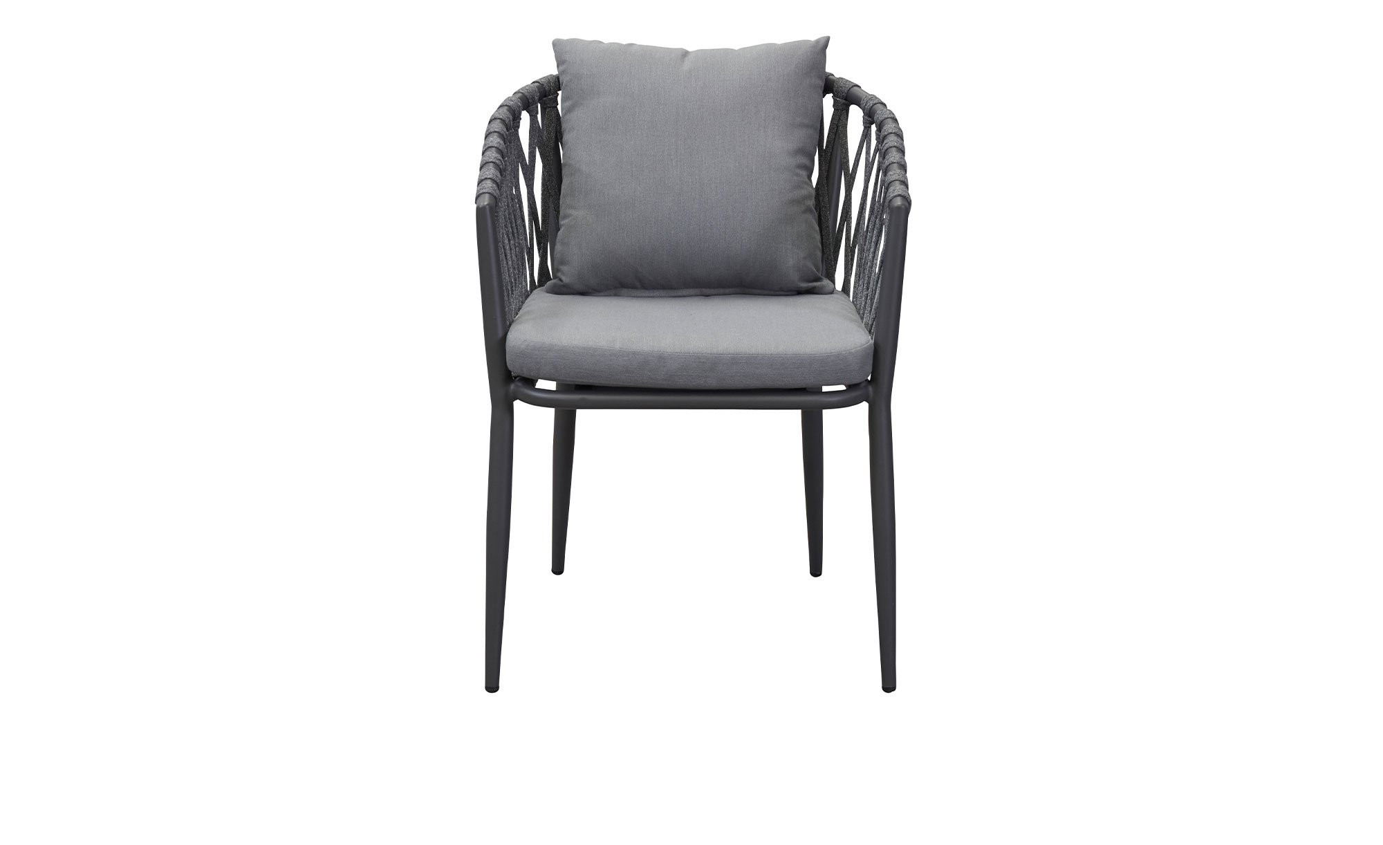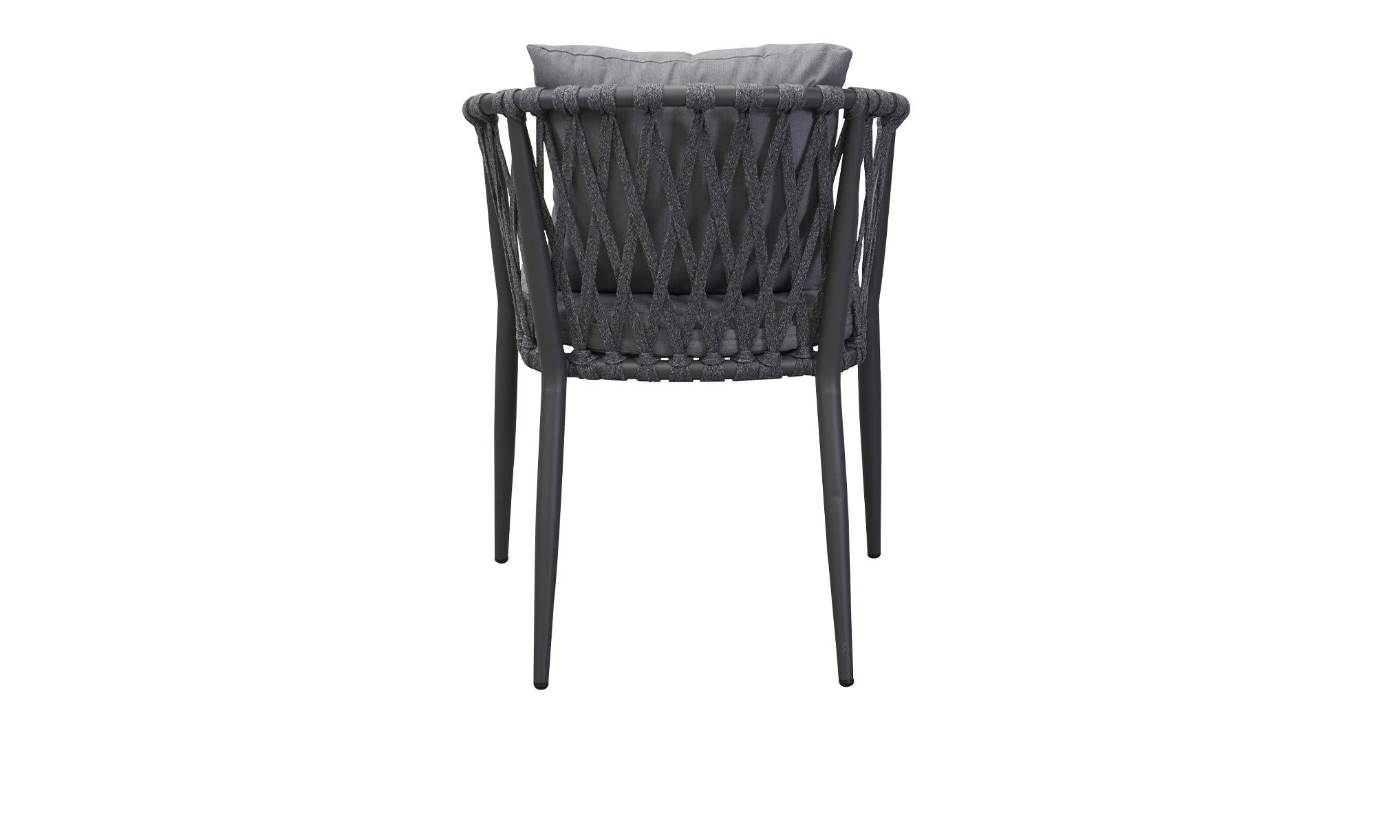 Um den Sitz mit mittelhoher Rückenlehne spannt sich ein strapazierfähiges, handgeflochtenes Rope-Geflecht. Es ist ebenfalls in Anthrazit gehalten. Vervollständigt wird das Angebot durch die mitgelieferte Auflage aus Schaumstoff. Dank ihres grauen Stoffbezugs aus 100 % Polyester passt diese ideal ins Bild.