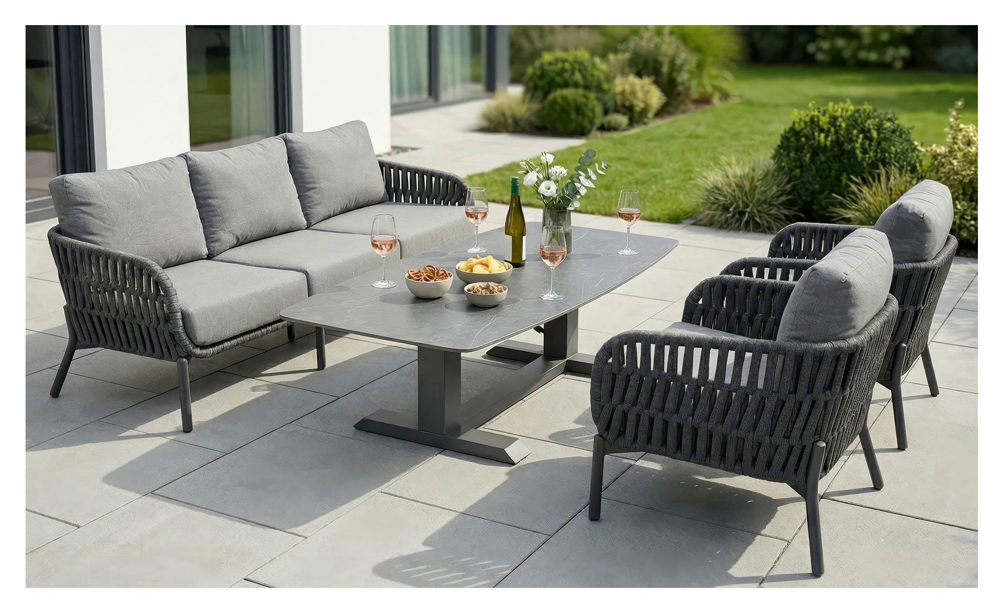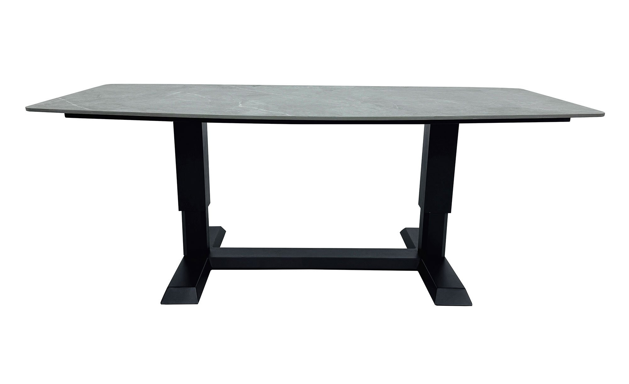 Ein stabiles Aluminiumgestell im Farbton Anthrazit trägt beim Gartentisch Barcelona von LC Garden eine ovale bzw. in Bootsform gestaltete Platte. Sie besteht aus Sinterstein mit Naturfinish und leicht schimmernder Beton-Optik.
