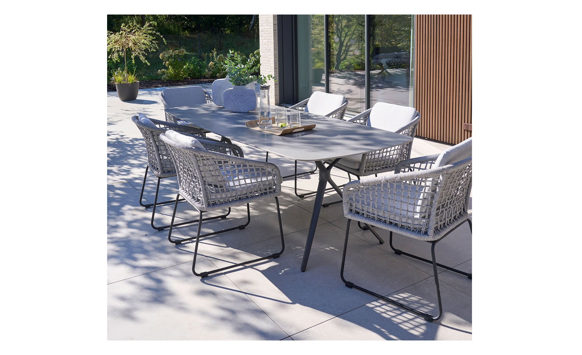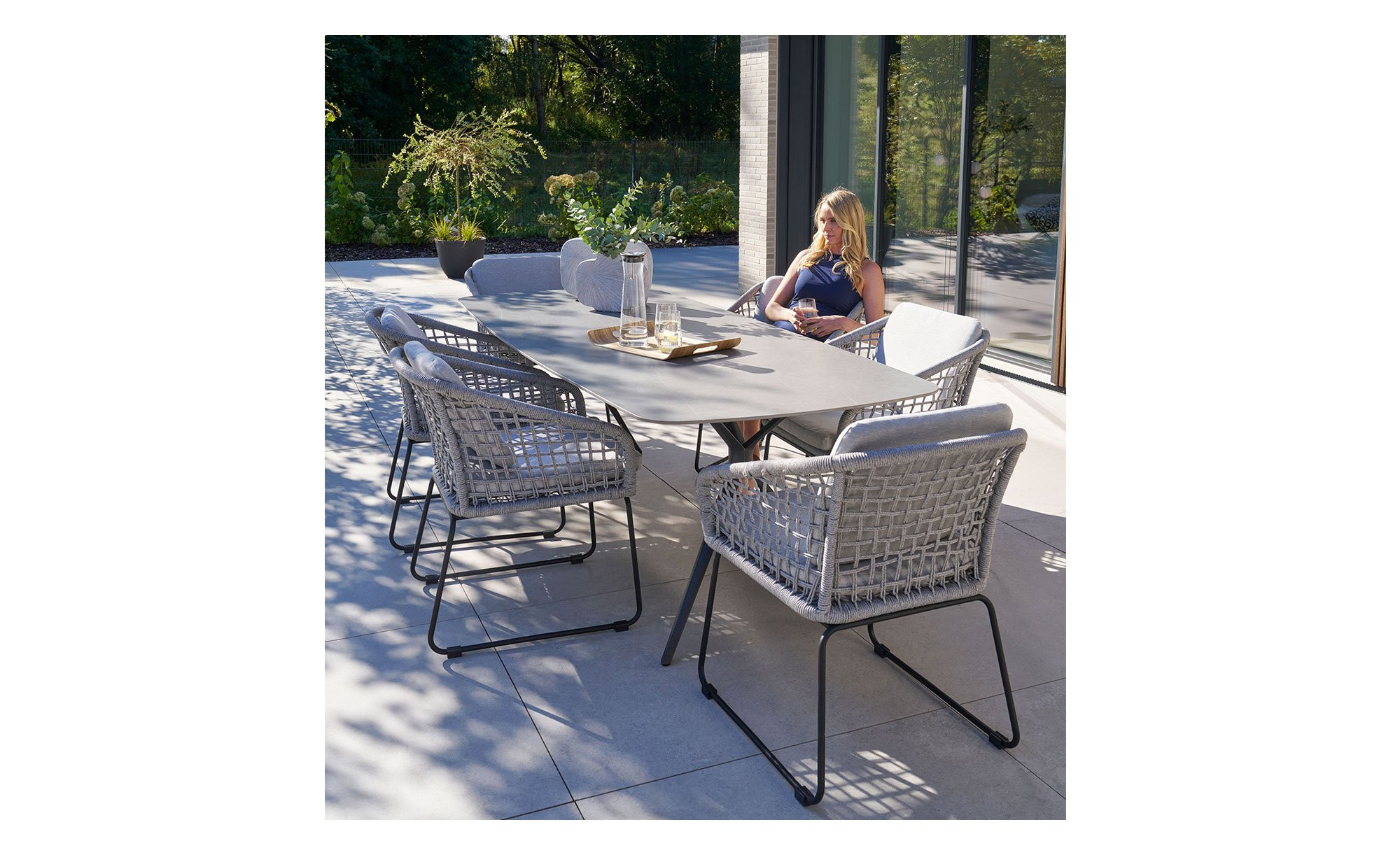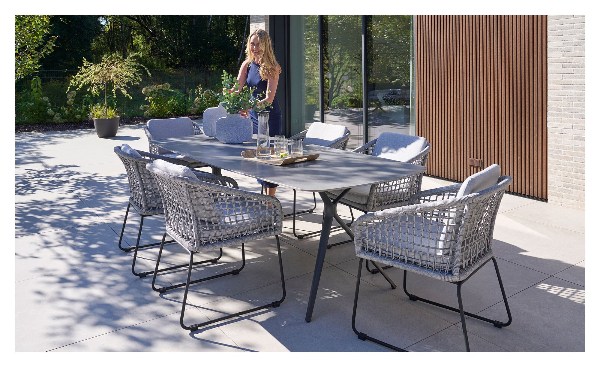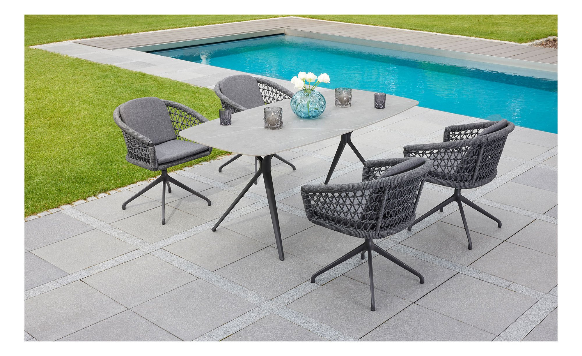 Der Gartentisch Cliff von LC Garden ist mit einer robusten Tischplatte aus sintered stone in Grau ausgestattet. Ein leichtes Stativgestell aus pulverbeschichtetem Aluminium in Anthrazit ergänzt das Design und fügt sich harmonisch in das Gesamtbild ein.