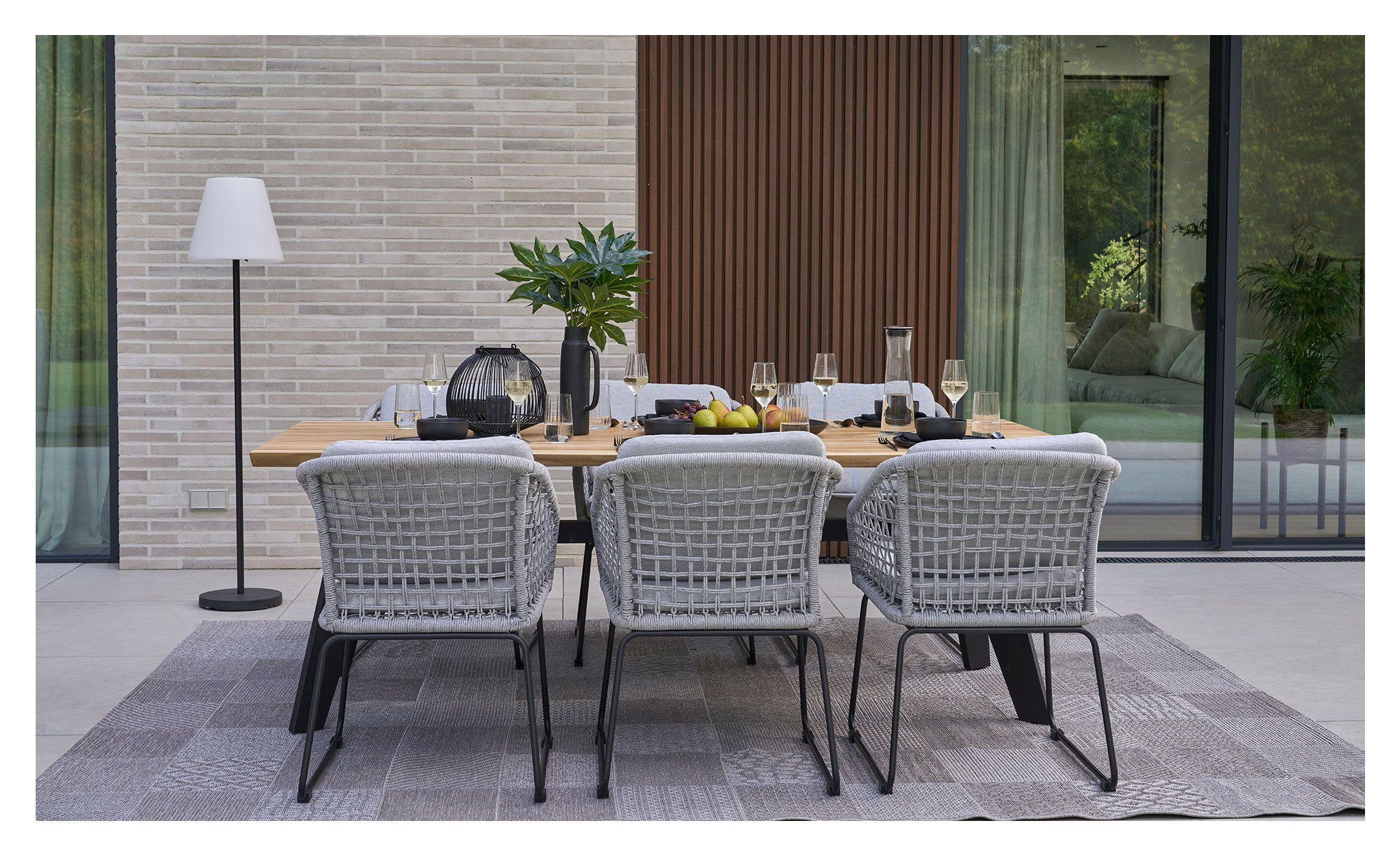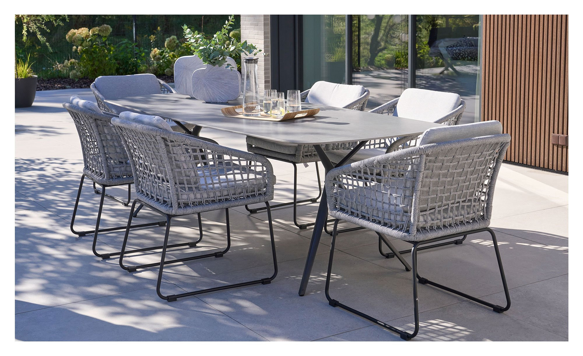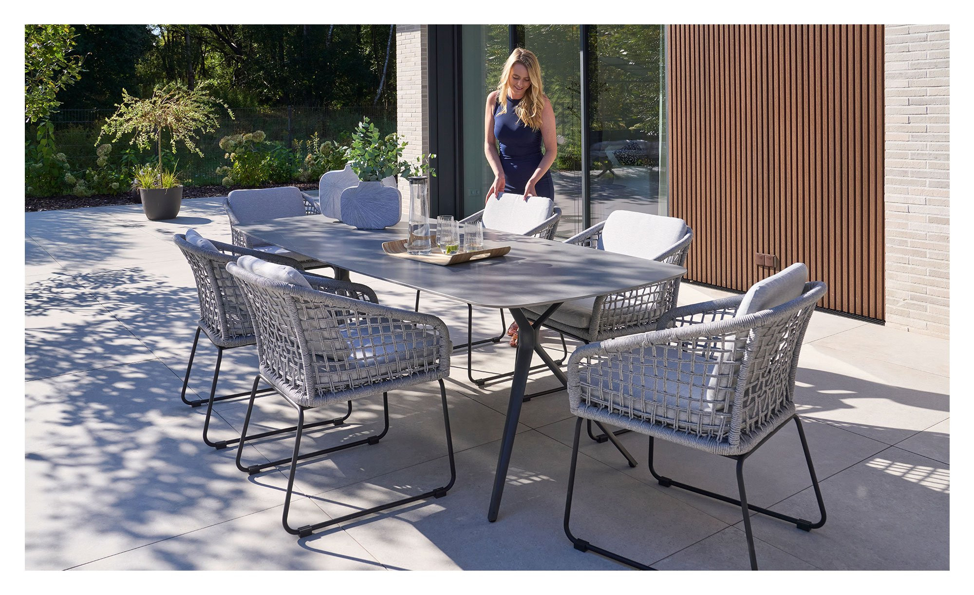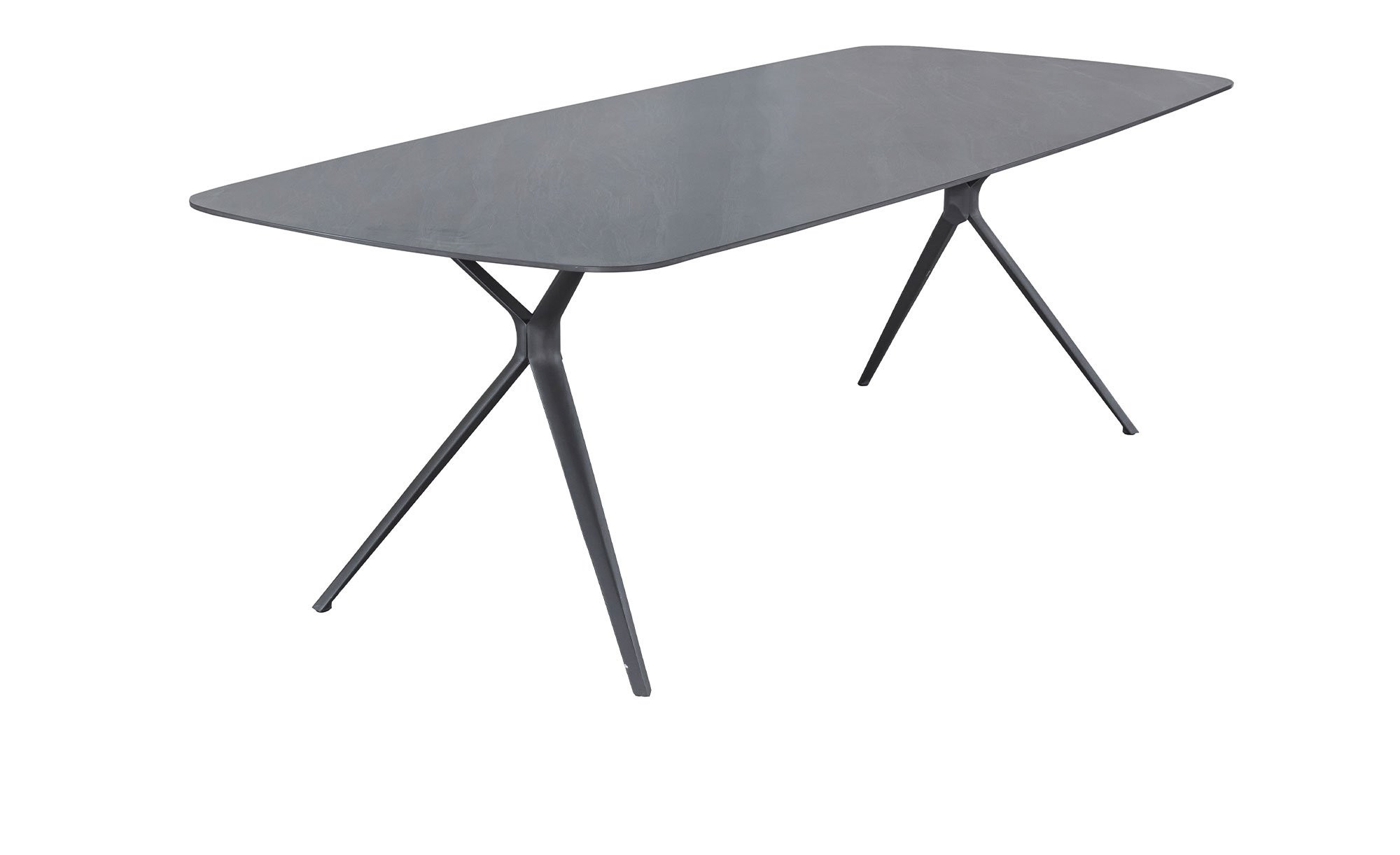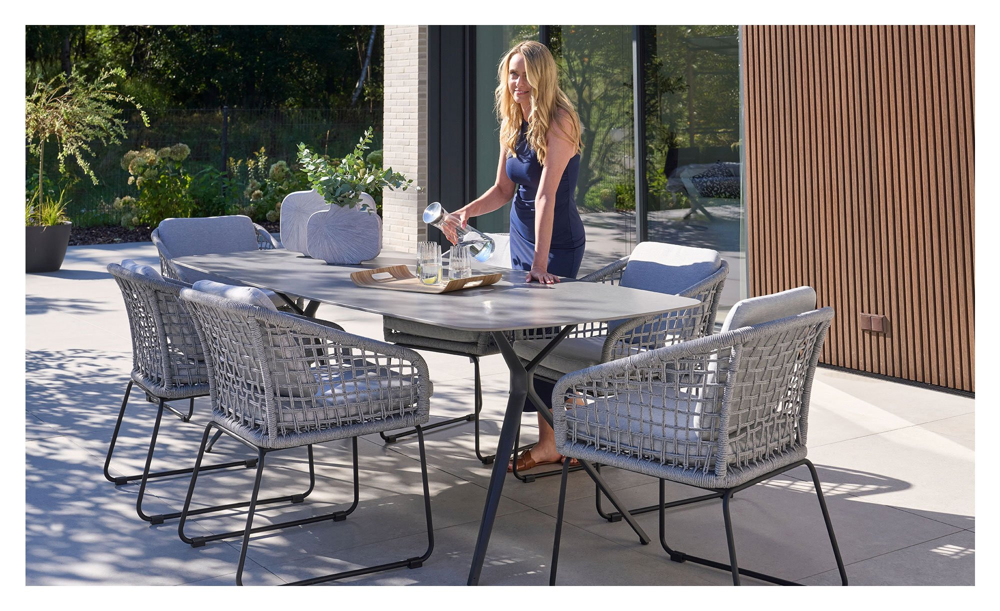 Der Gartentisch Cliff von LC Garden ist mit einer robusten Tischplatte aus sintered stone in Grau ausgestattet. Ein leichtes Stativgestell aus pulverbeschichtetem Aluminium in Anthrazit ergänzt das Design und fügt sich harmonisch in das Gesamtbild ein.