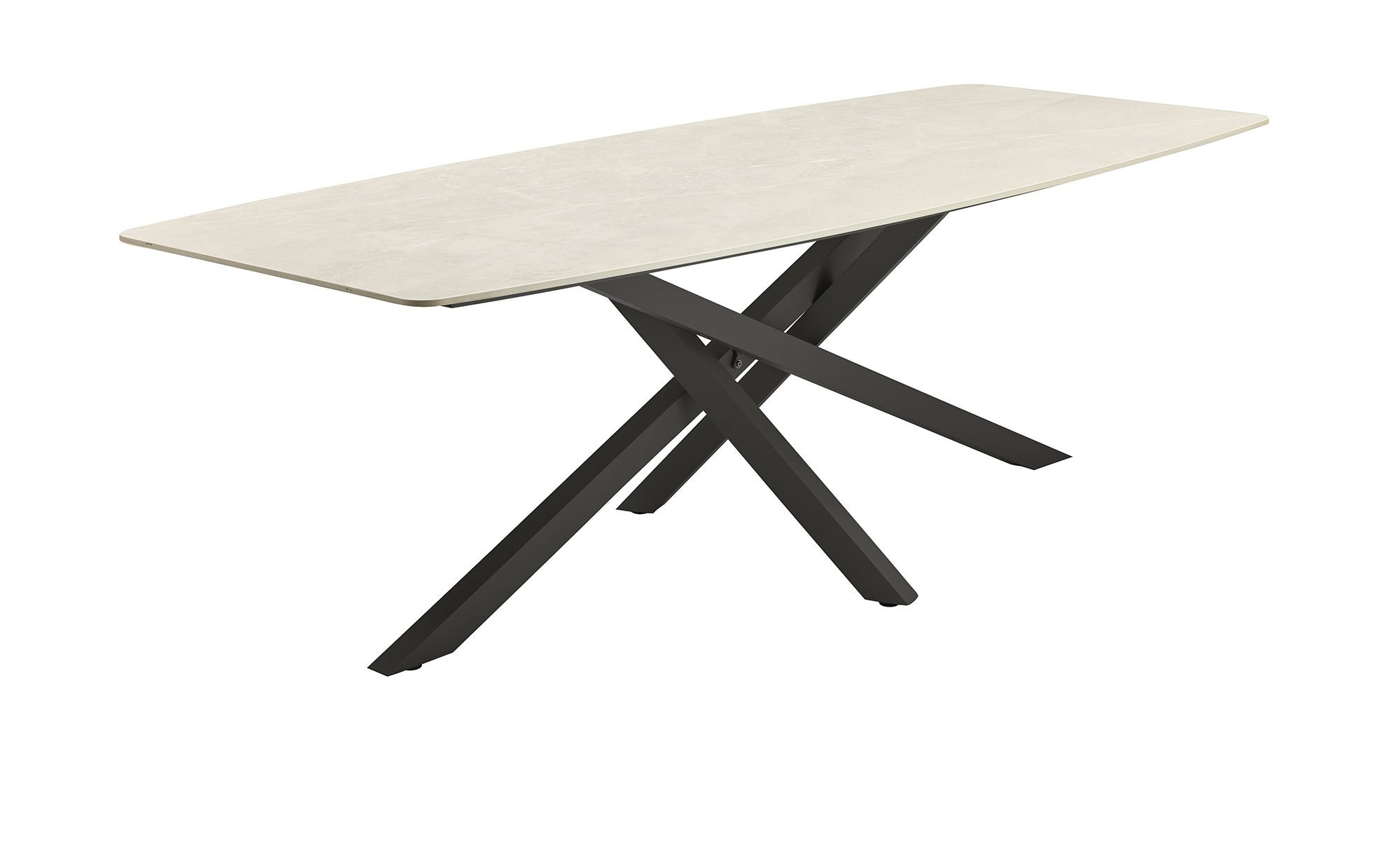 Während die rechteckige Platte des ca. 200 x 75 x 100 cm großen Tischs aus beigem Sinterstein besteht, wurde sein stabiles Spider-Gestell aus Aluminium in Anthrazit gefertigt.