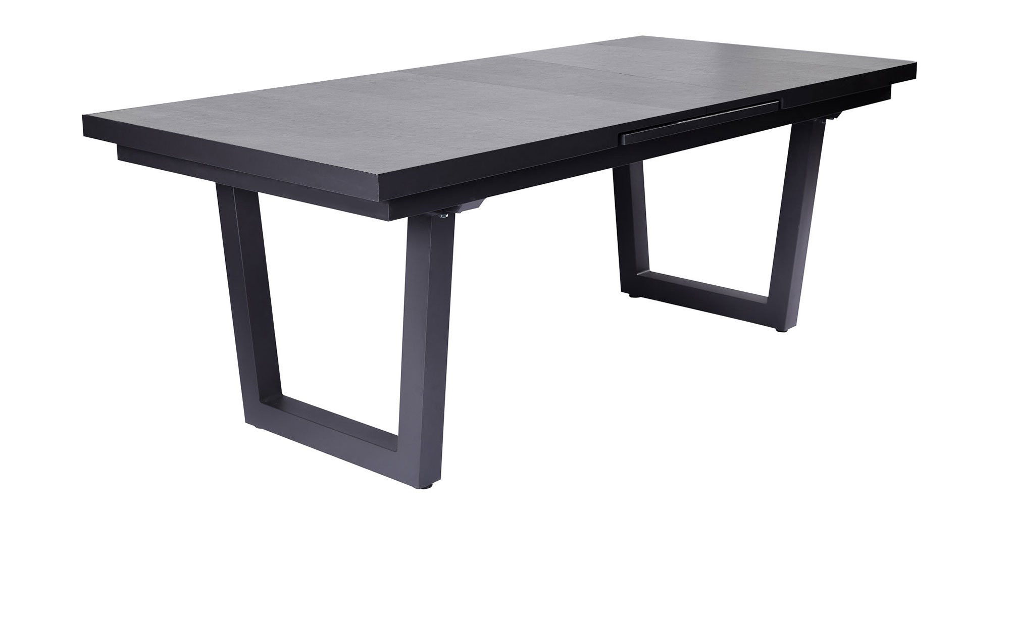 Das V-Gestell des Gartentischs Keramo von LC Garden besteht aus Aluminium und ist in einem edlen Anthrazit gefärbt. Zuverlässig trägt es die rechteckige Platte aus Sinterstein/Sintered Stone, die sich mit ihrem Grau ideal ins Bild fügt.
