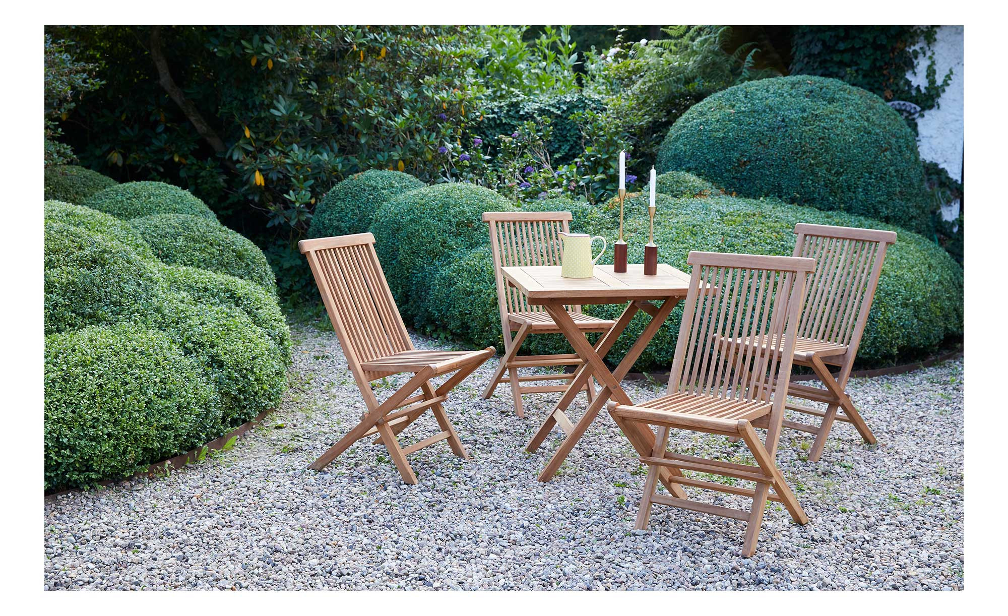 Sowohl das X-Gestell als auch die Platte des ca. 70 x 75 x 70 cm großen Gartentischs Riva von LC Garden bestehen aus hochwertigem Teakholz. Dieses stammt aus nachhaltiger indonesischer Forstwirtschaft, Sie dürfen sich also guten Gewissens daran erfreuen. Bereits bei einfacher Pflege verspricht das Holz eine große Robustheit und Langlebigkeit.