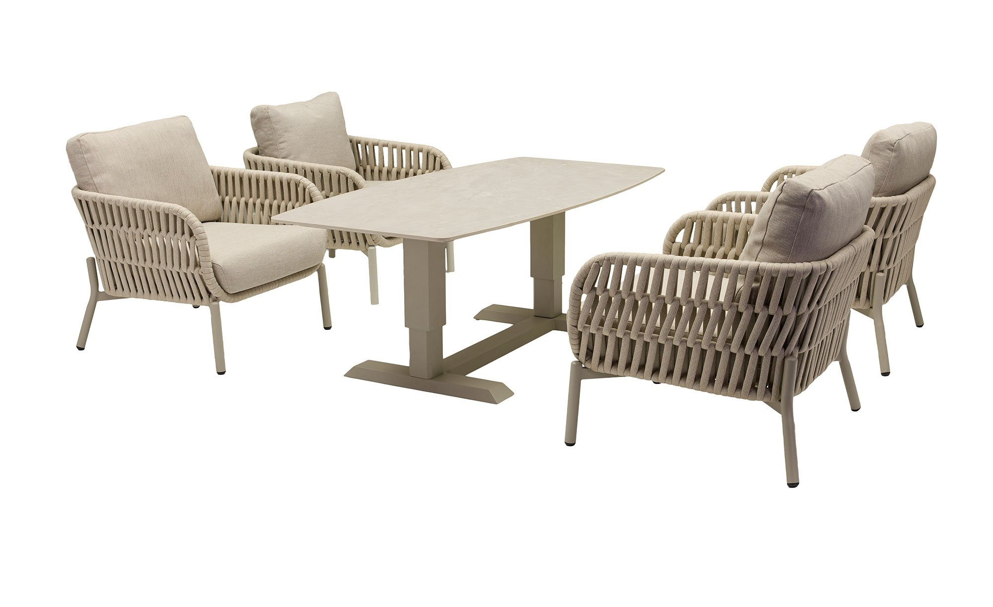 Getragen wird der Artikel von einem stabilen Aluminiumgestell in modernem Taupe. Darauf befindet sich eine ovale Tischplatte in eleganter Bootsform, die aus Sinterstein mit Naturfinish gefertigt ist. Ihre dezente, leicht schimmernde Optik verleiht dem Gartenmöbelstück ein zeitgemäßes und zugleich edles Erscheinungsbild.