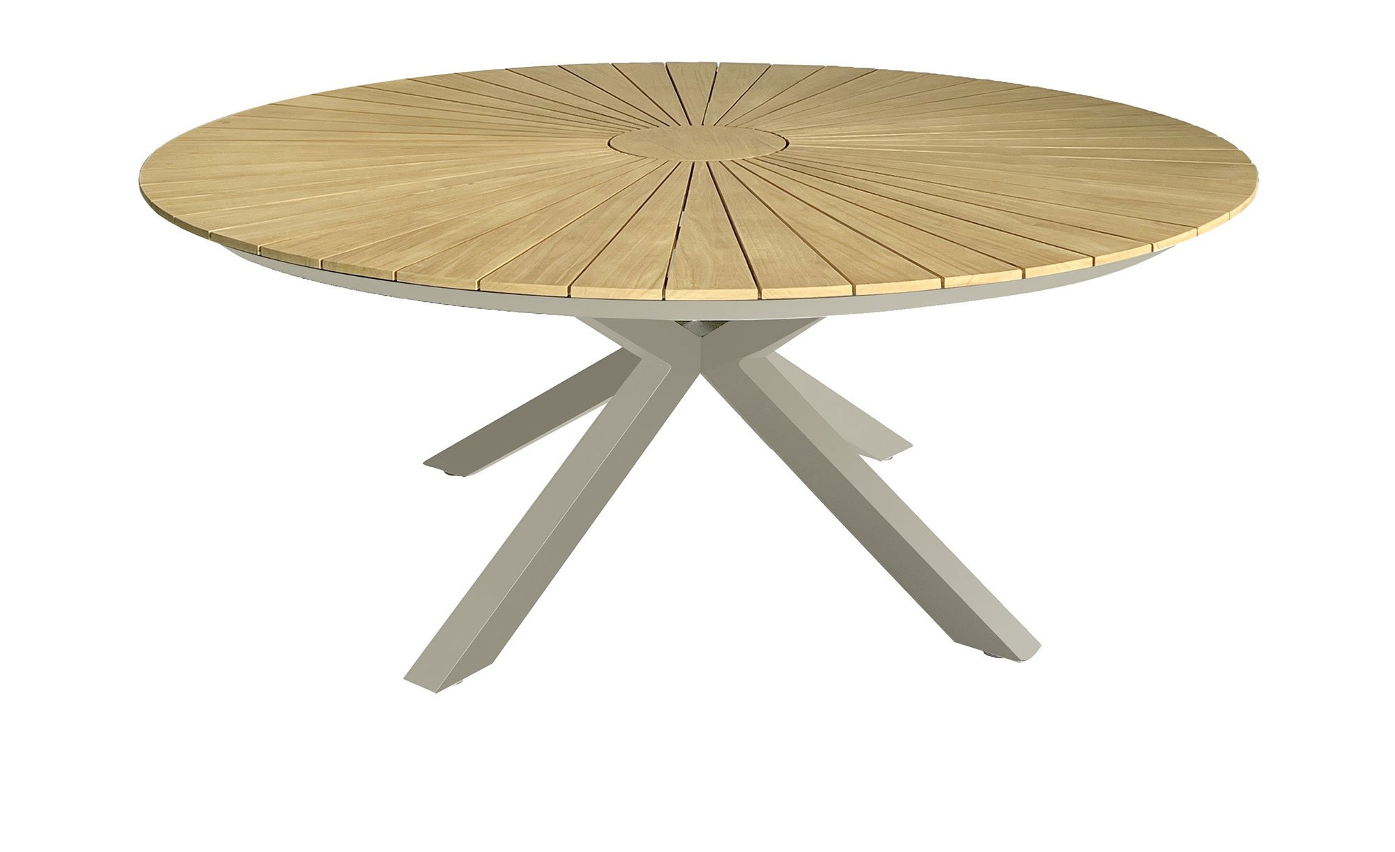 Die runde Platte des Gartentischs von LC Garden besteht aus holzfarbigem Teakholz und hat einen Durchmesser von ca. 120 cm. Getragen wird sie von einem Sternfuß-Gestell aus Aluminium im Farbton Taupe. Insgesamt misst der Artikel ca. 120 x 75 x 120 cm. Da er für die Nutzung draußen konzipiert wurde, ist er natürlich UV- und wetterbeständig. Achten Sie bei der Lagerung bitte dennoch darauf, dass sich kein Wasser auf der Tischplatte bildet. Am besten ist dafür ein geschützter und trockener Ort geeignet. Auch eine wasserabweisende Hülle kann helfen, hier muss allerdings die Luftzirkulation gewährleistet sein.
