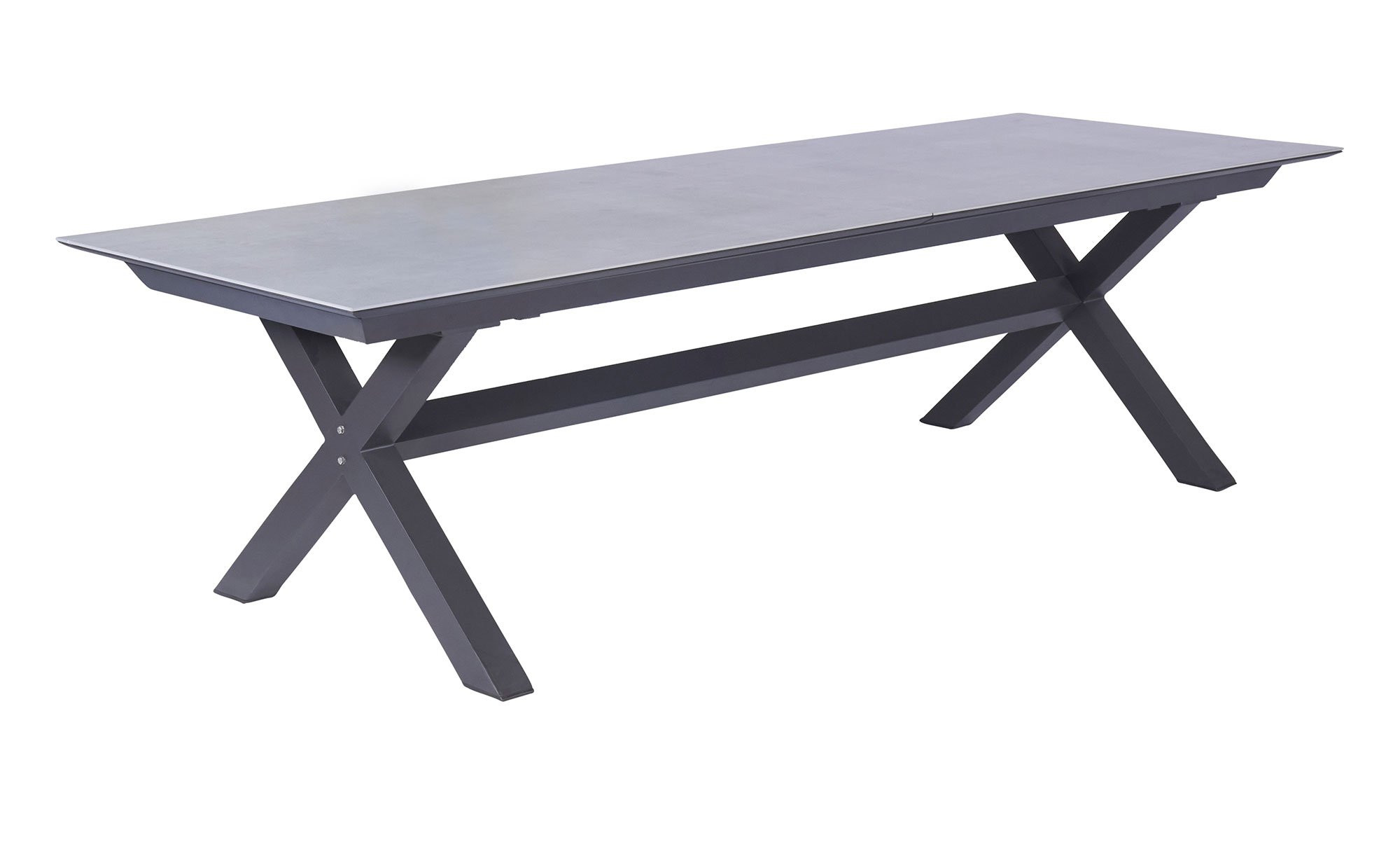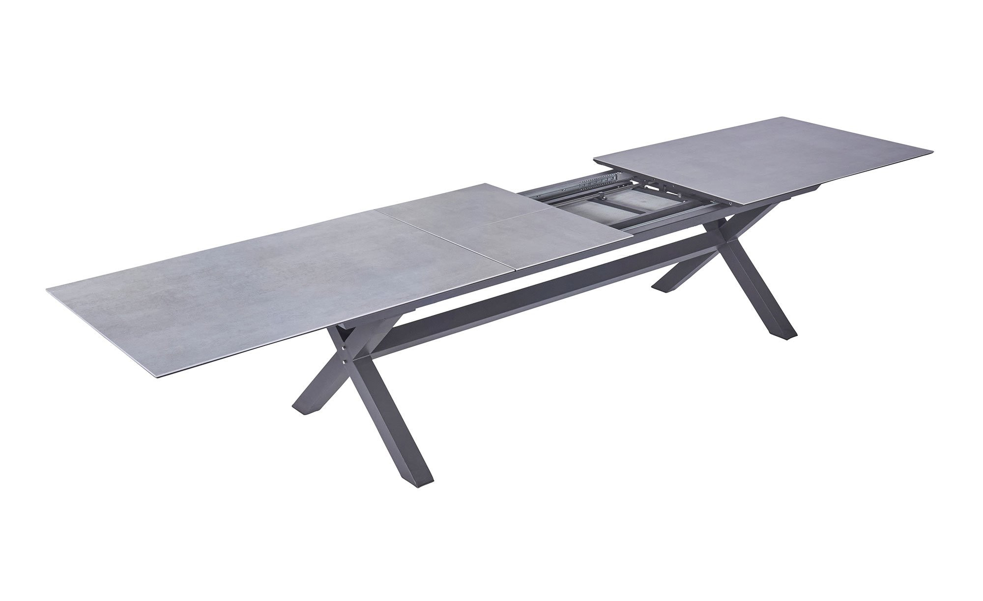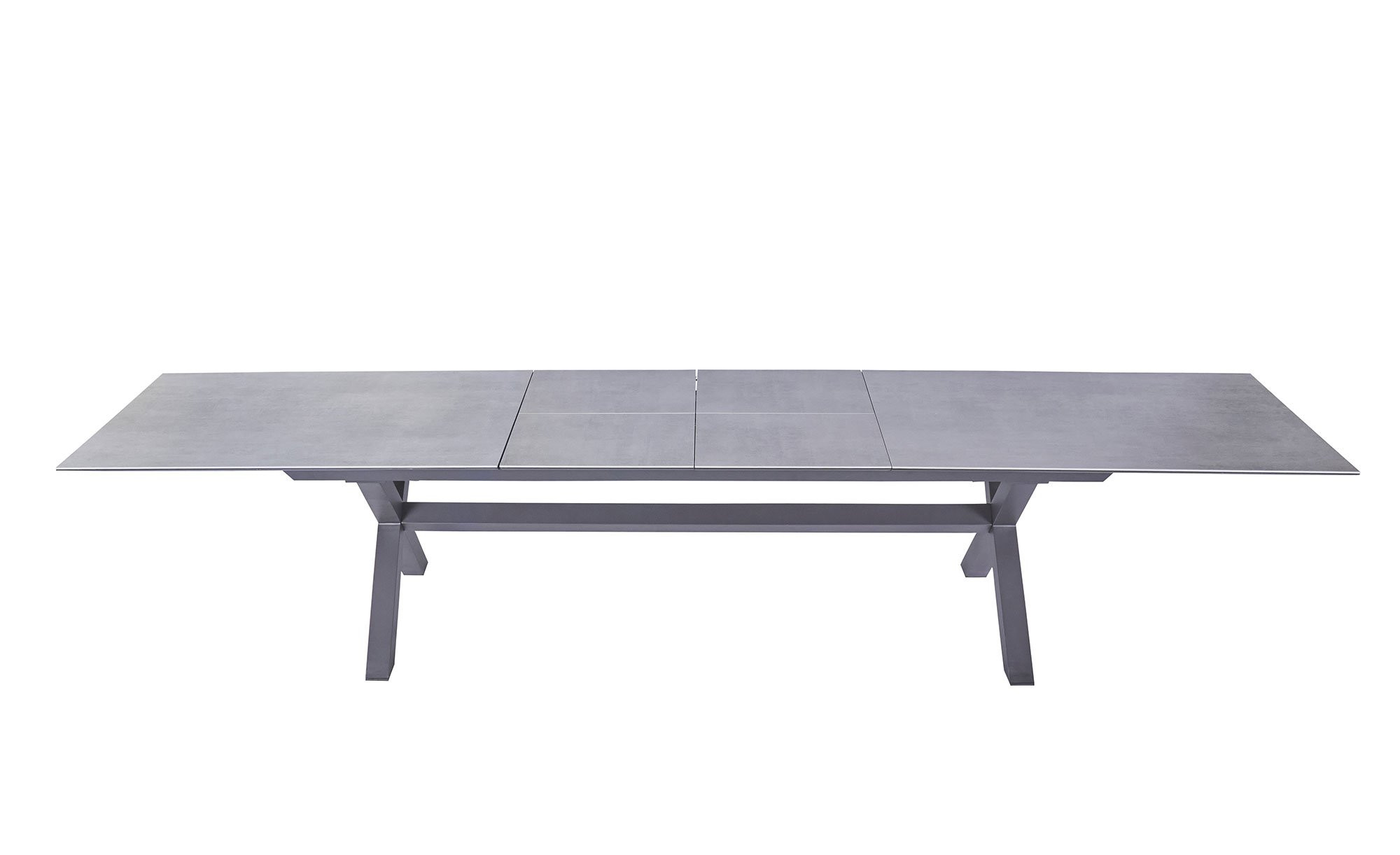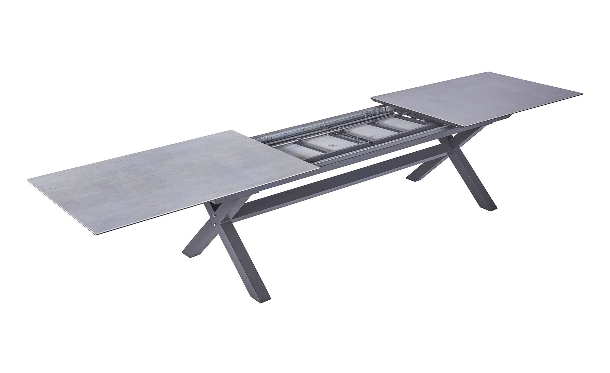 Ausgesprochen stilvoll ist ebenso die kratzfeste Glas-Keramik Tischplatte des LC Garden Artikels. Sie begeistert durch eine authentische Beton-Optik. Mit Hilfe des Butterfly-Auszugs können Sie die Platte auf eine Länge von ca. 400 cm erweitern.