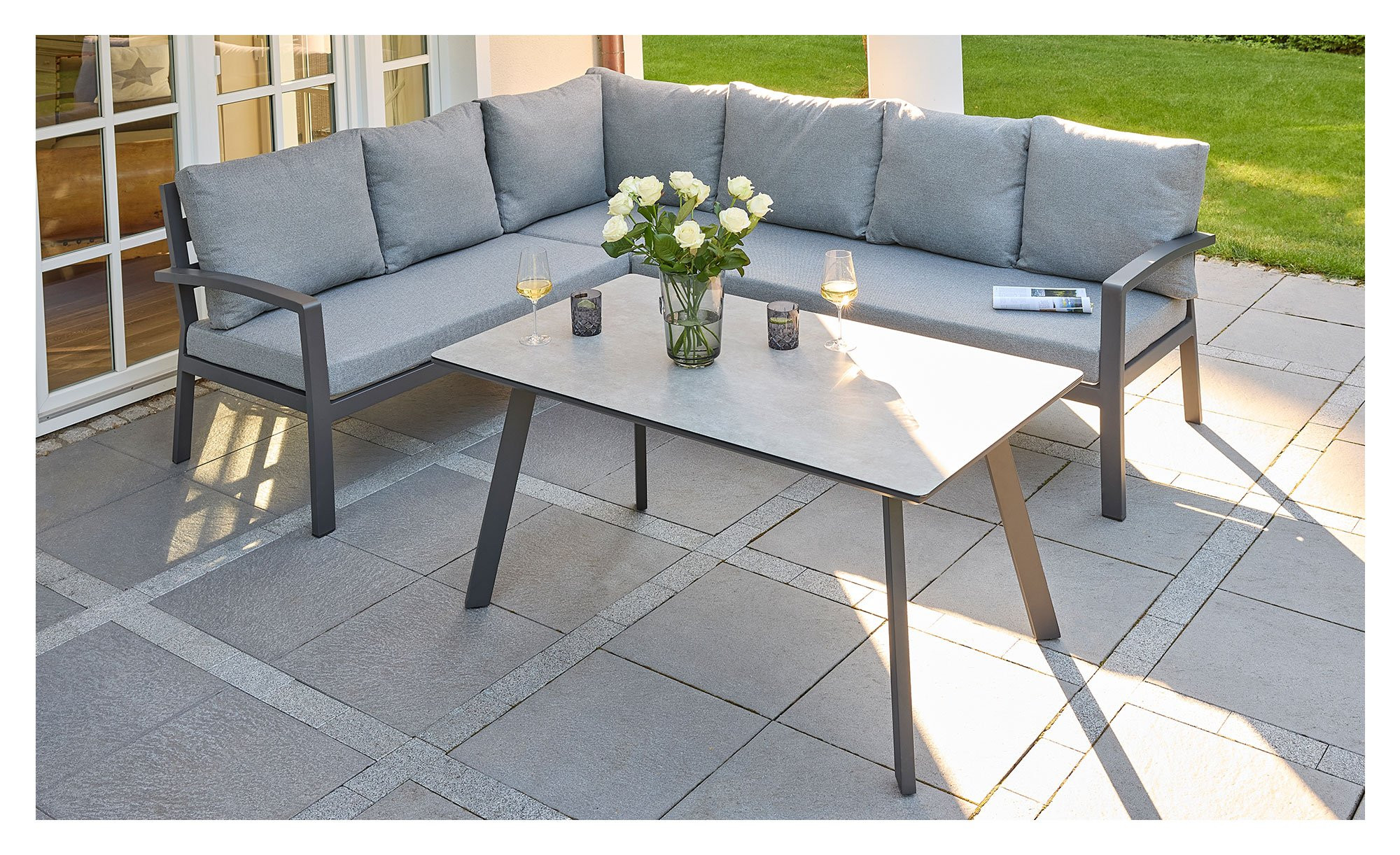Die UV- und wetterbeständigen Gartenmöbel von LC Garden verfügen über vierfüßige Gestelle aus stabilem Aluminium. Sie sind in einem ansprechenden Anthrazit gehalten und passen damit hervorragend zu den weiteren Bestandteilen – wie beispielsweise der Tischplatte aus Glas mit Keramikbeschichtung in Beton-Optik!