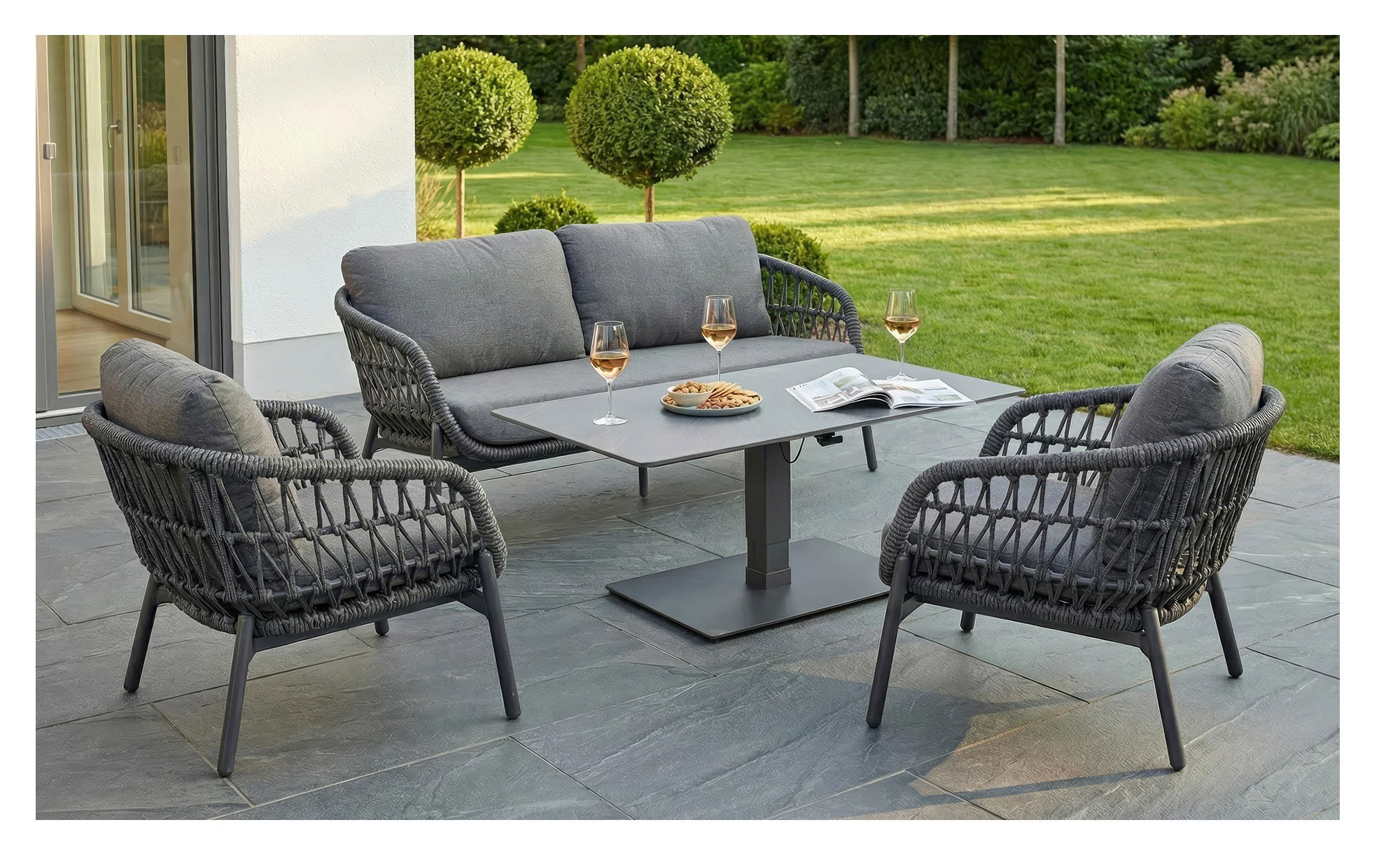 Sowohl bei der Bank als auch bei den beiden Sesseln dürfen Sie sich auf ein Rope-Geflecht in Dunkelgrau freuen. Dieses ist nicht nur ausgesprochen modern, sondern gewährleistet auch ein angenehmes Sitzgefühl.