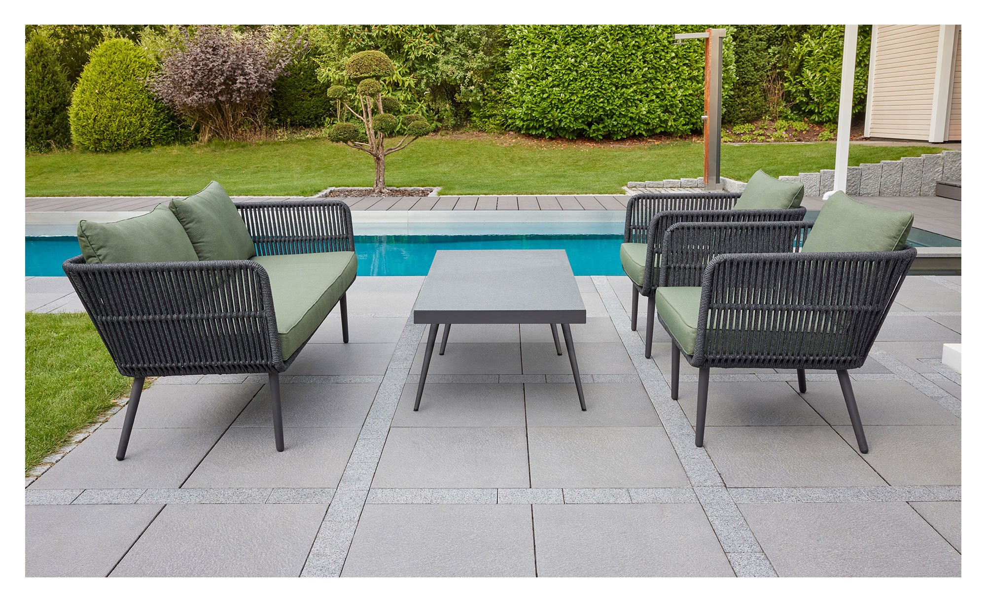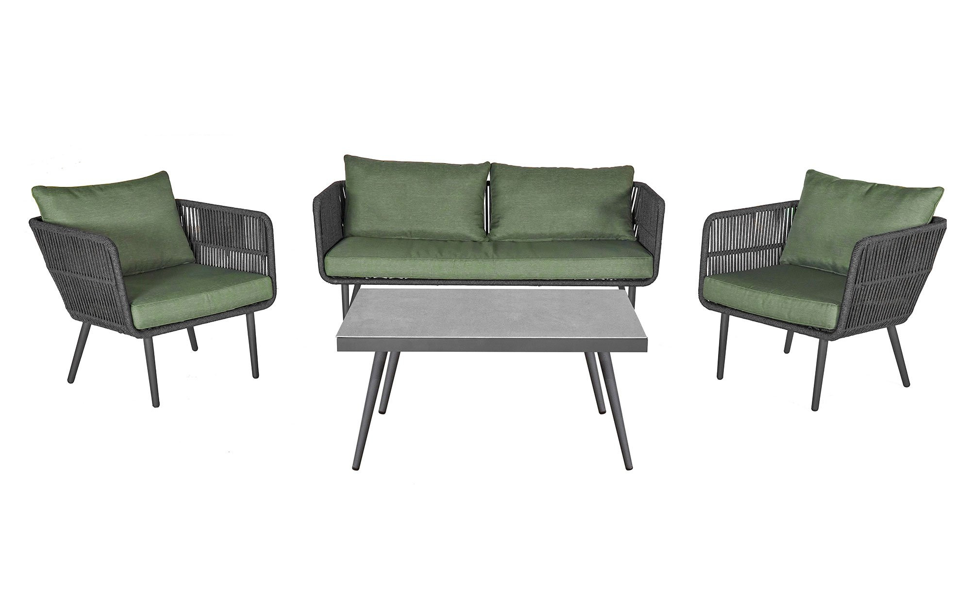 Für den stabilen Stand der Sitzgelegenheiten und des Tischs sorgen Stativgestelle in einem an-sprechenden Anthrazit. Bezogen sind die Artikel von LC Garden mit einem Polyester-Stoff in modi-schem Moosgrün. Die Tischplatte setzt mit ihrem Grau einen edlen Akzent. Bitte beachten Sie die maximale Belastbarkeit des Sofas, die bei ca. 220 kg liegt. Den Tisch kön-nen Sie mit max. 40 kg belasten.