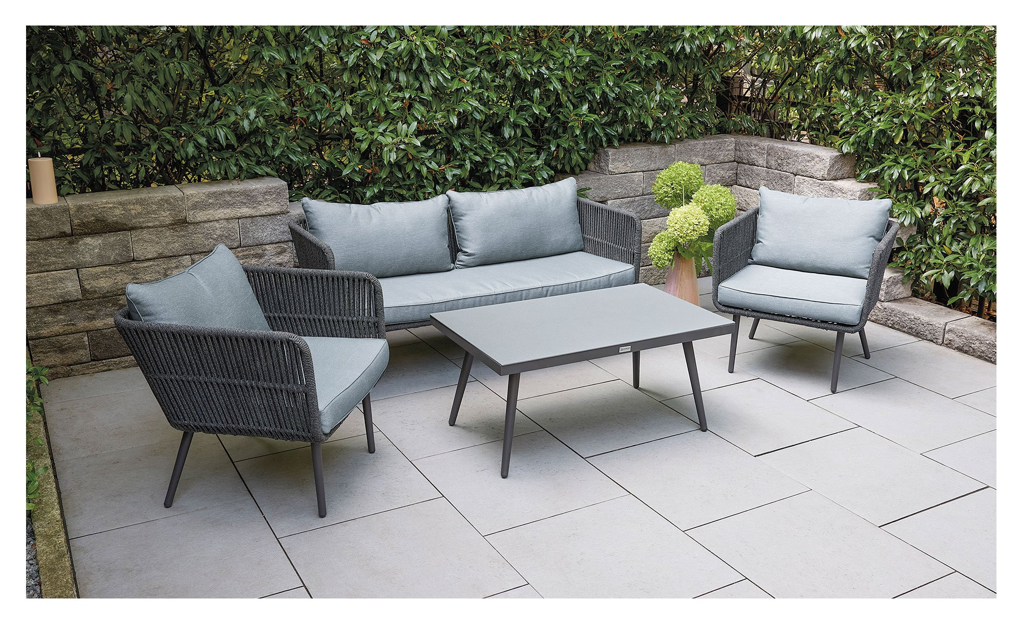 Machen Sie Ihren Garten, die Terrasse oder den Balkon zu Ihrem persönlichen Wohlfühlbereich – das Lounge-Set Saigon von LC Garden kombiniert dafür modernes Design mit einladendem Kom-fort! Das Set umfasst zwei Sessel (je ca. 73 x 72 x 70 cm), ein Sofa (ca. 159 x 72 x 70 cm) und einen Tisch (ca. 105 x 62 x 47 cm). Gemeinsam sorgen die Möbel für eine entspannte Atmosphäre und laden zum Verweilen im Freien ein. Sie sind UV- und wetterbeständig, sodass Sie sich mit bis zu vier Personen lange an ihrer Qualität erfreuen können.