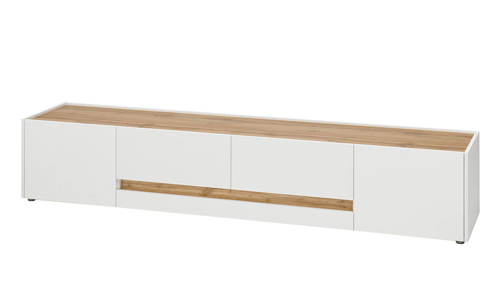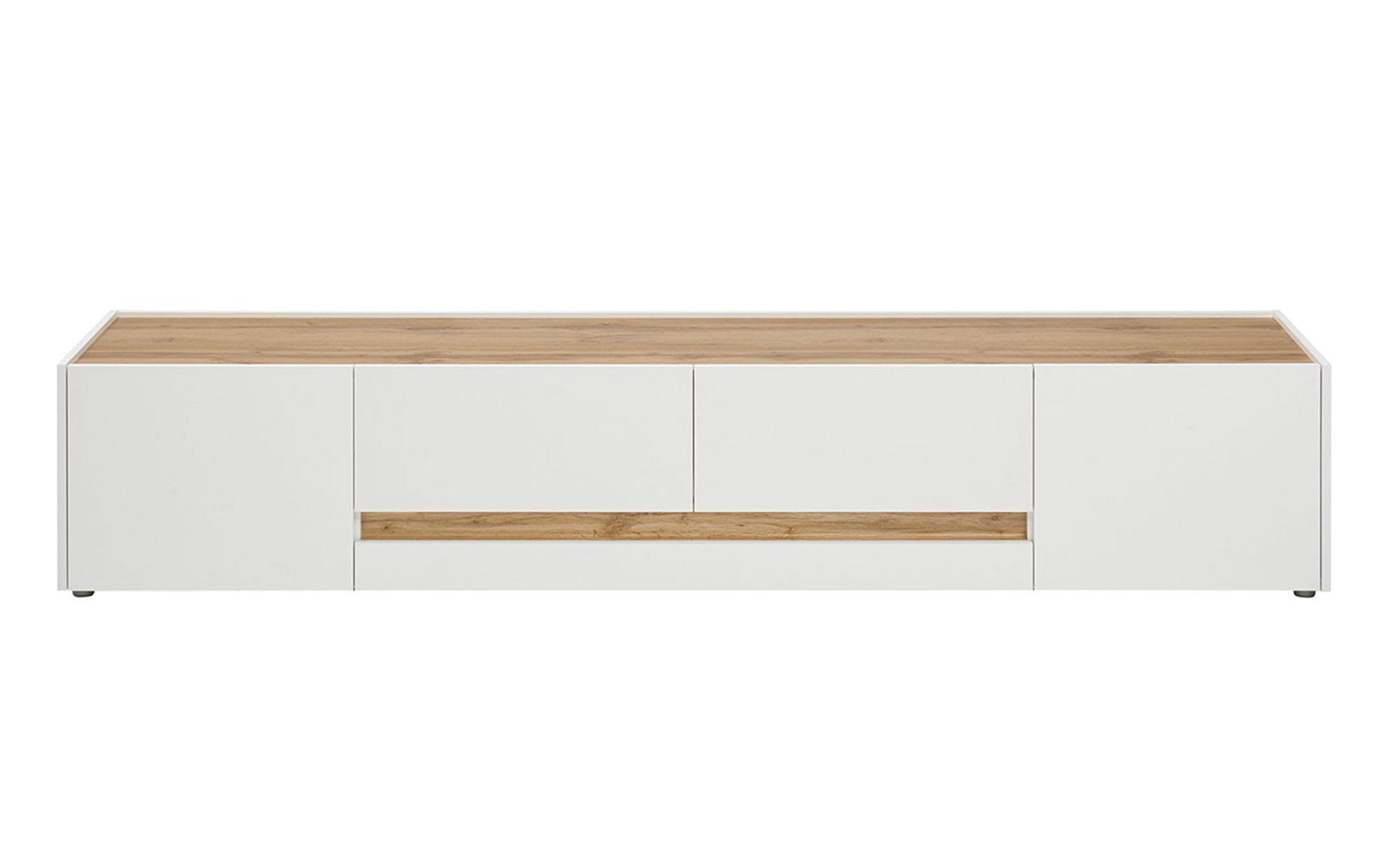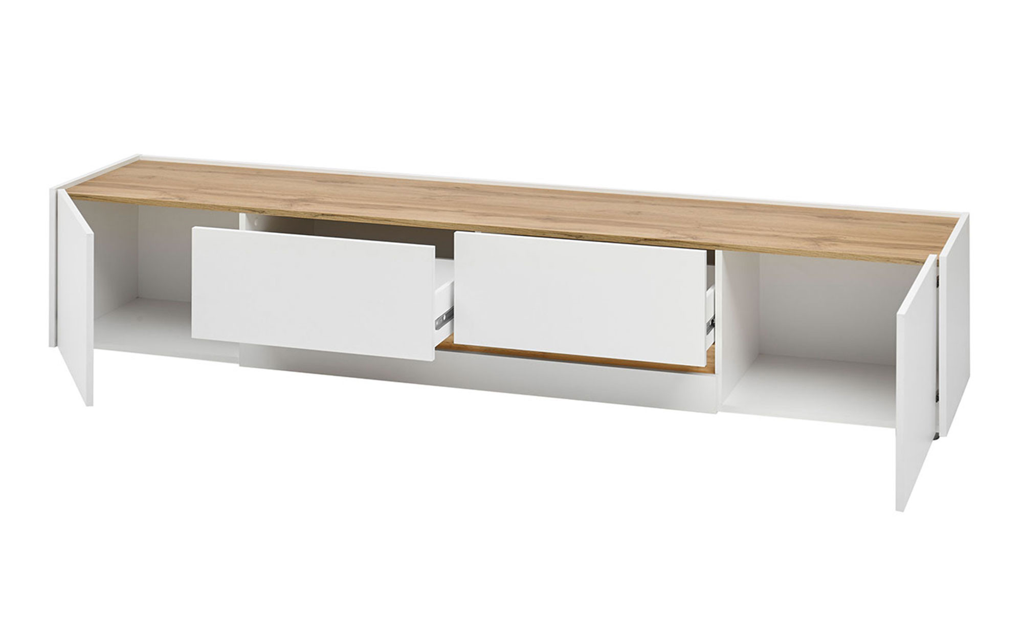 Das ca. 220 x 40 x 45 cm große Lowboard Cintia überzeugt durch seine hellen Farben und ein großes Platzangebot.
