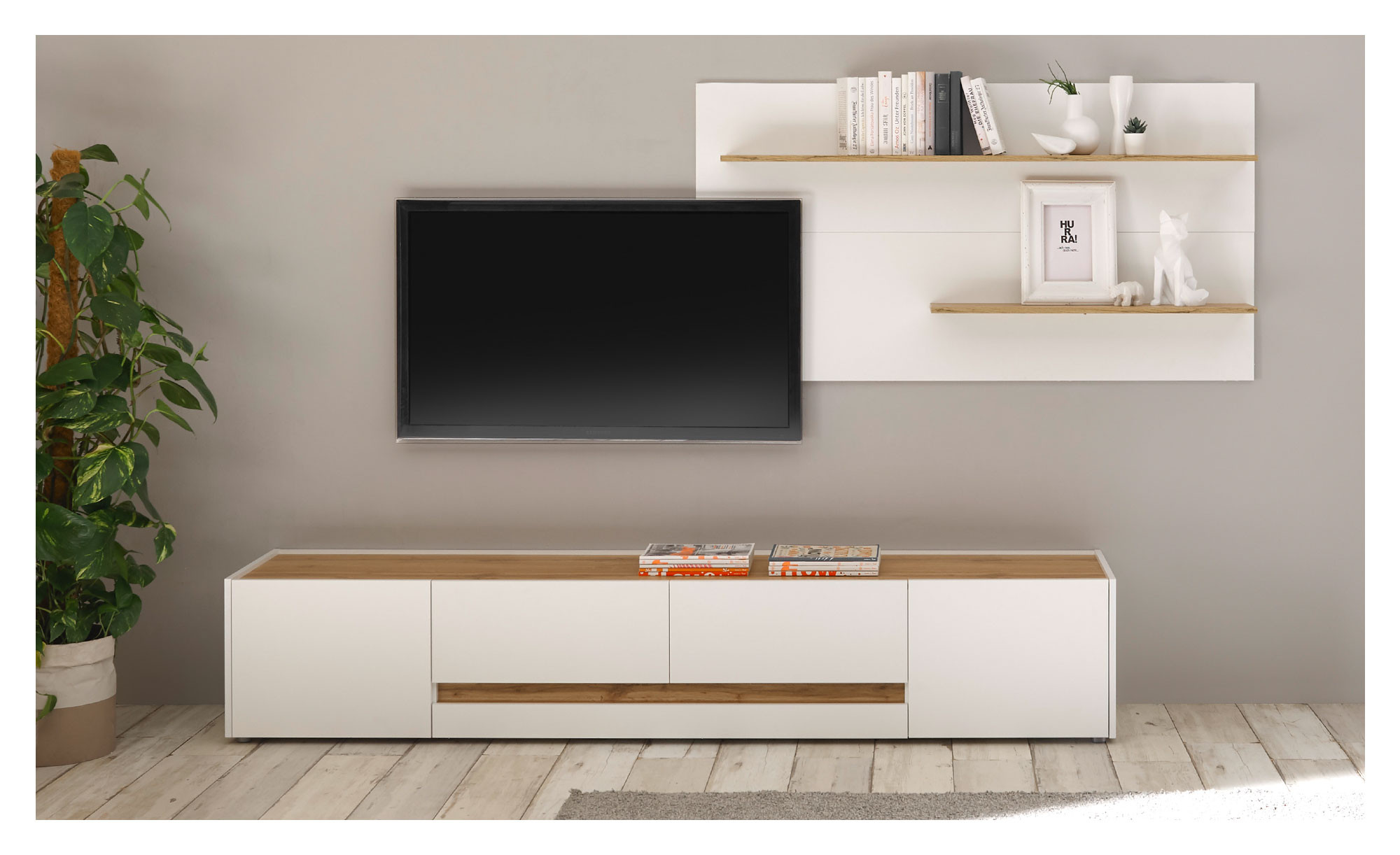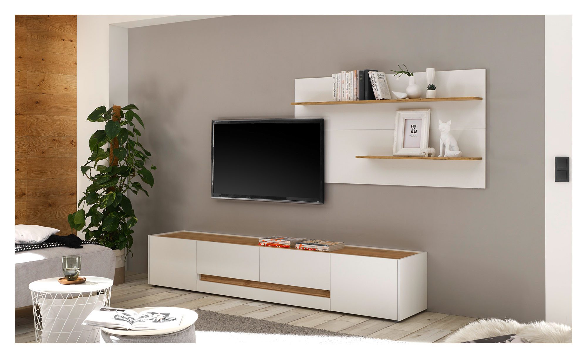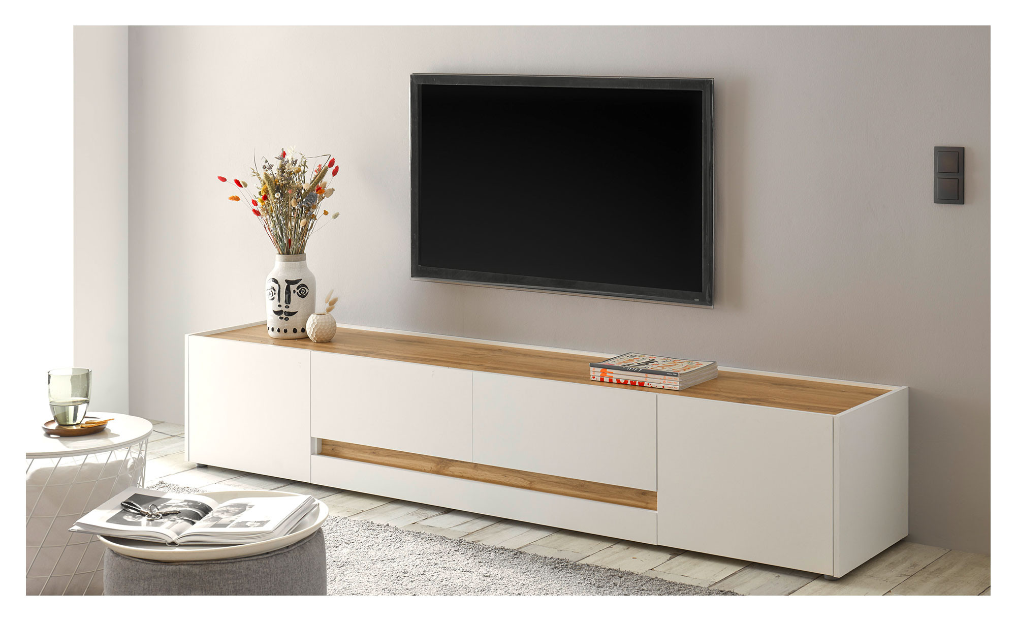 Das ca. 220 x 40 x 45 cm große Lowboard Cintia überzeugt durch seine hellen Farben und ein großes Platzangebot.