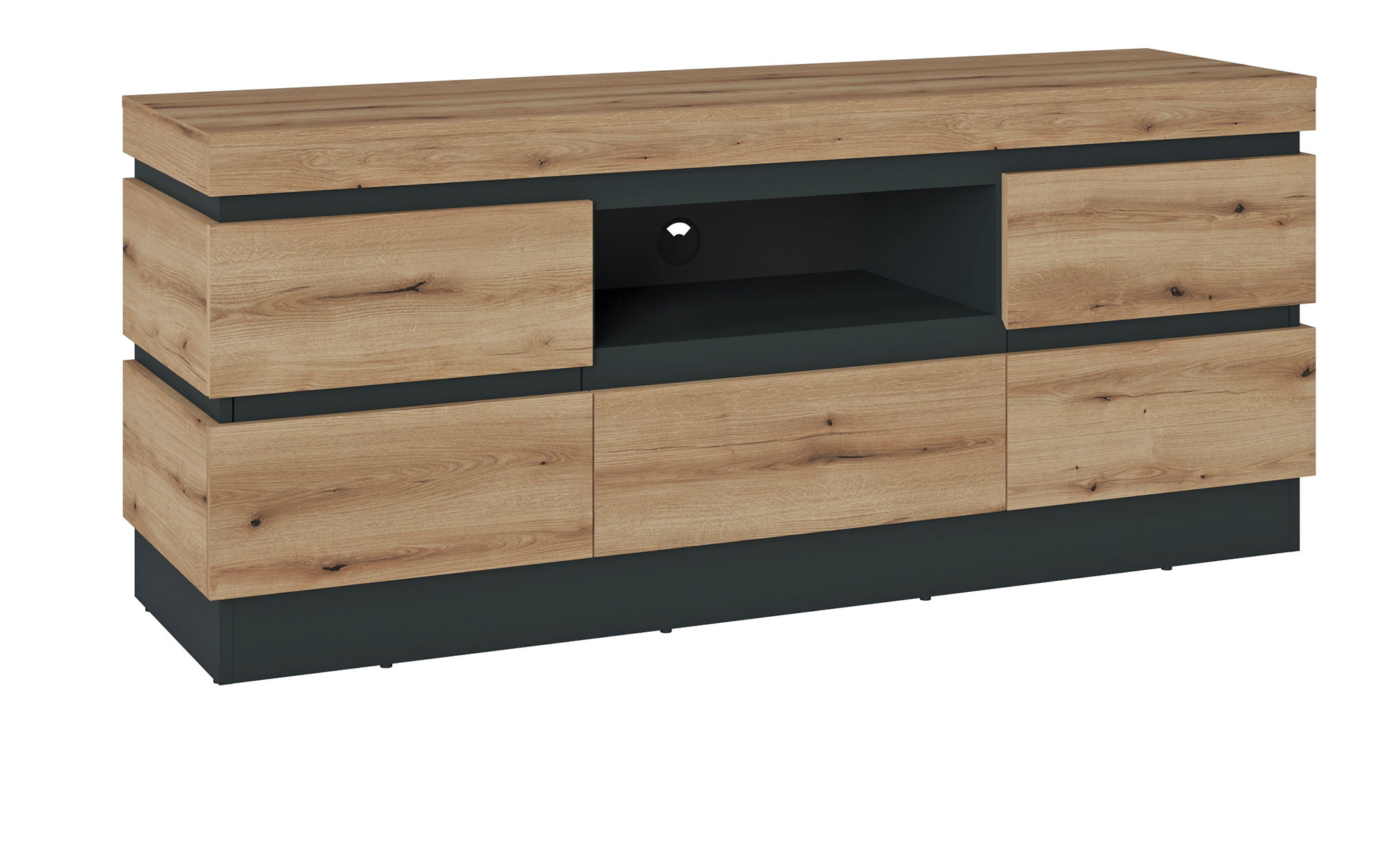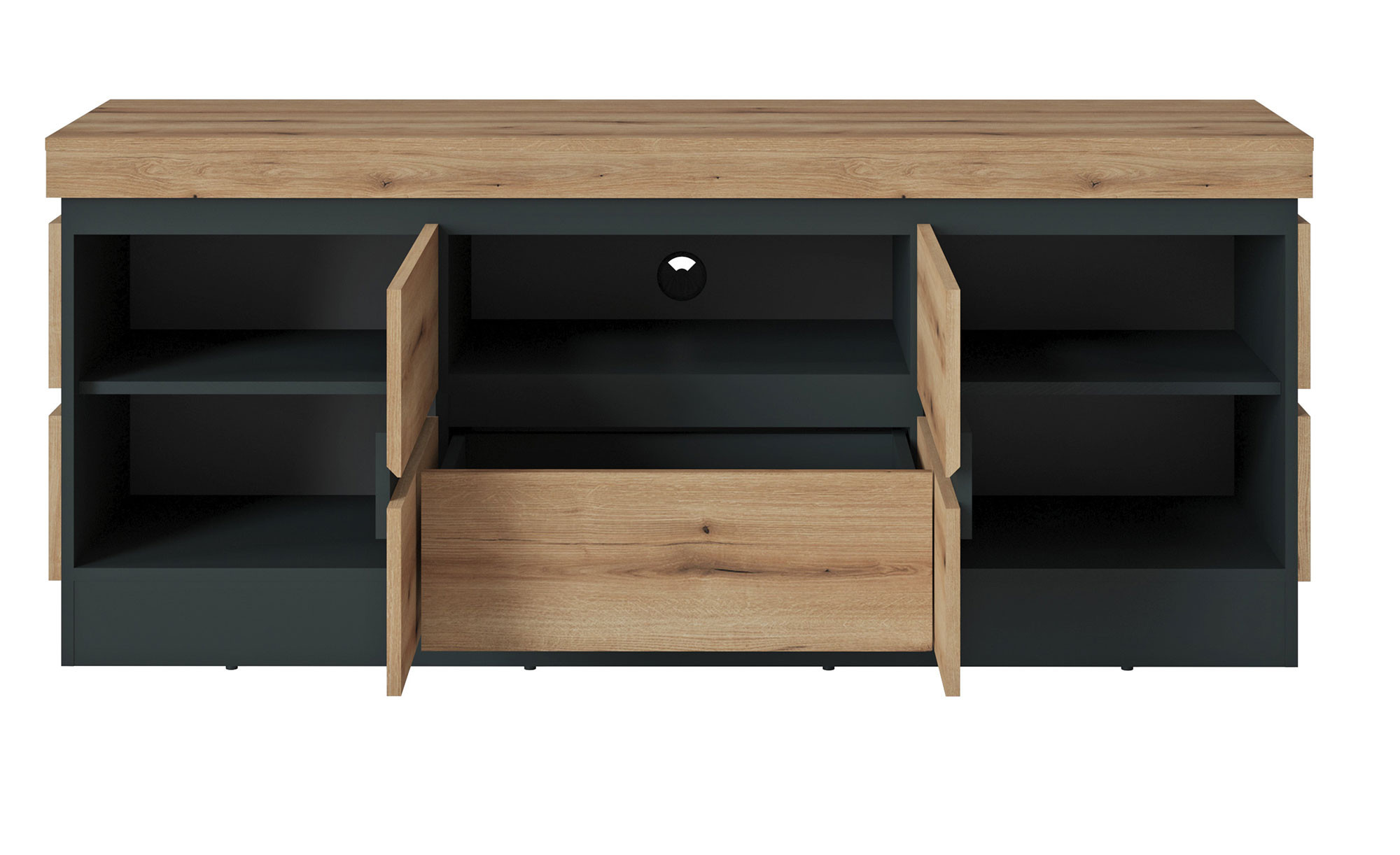 Hinter zwei Türen mit Dämpfung verfügt das ca. 161 x 68 x 45 cm große Board über zwei Böden und vier Fächer. Zusätzlich gibt es ein offenes Fach und eine Soft-Close-Schublade.