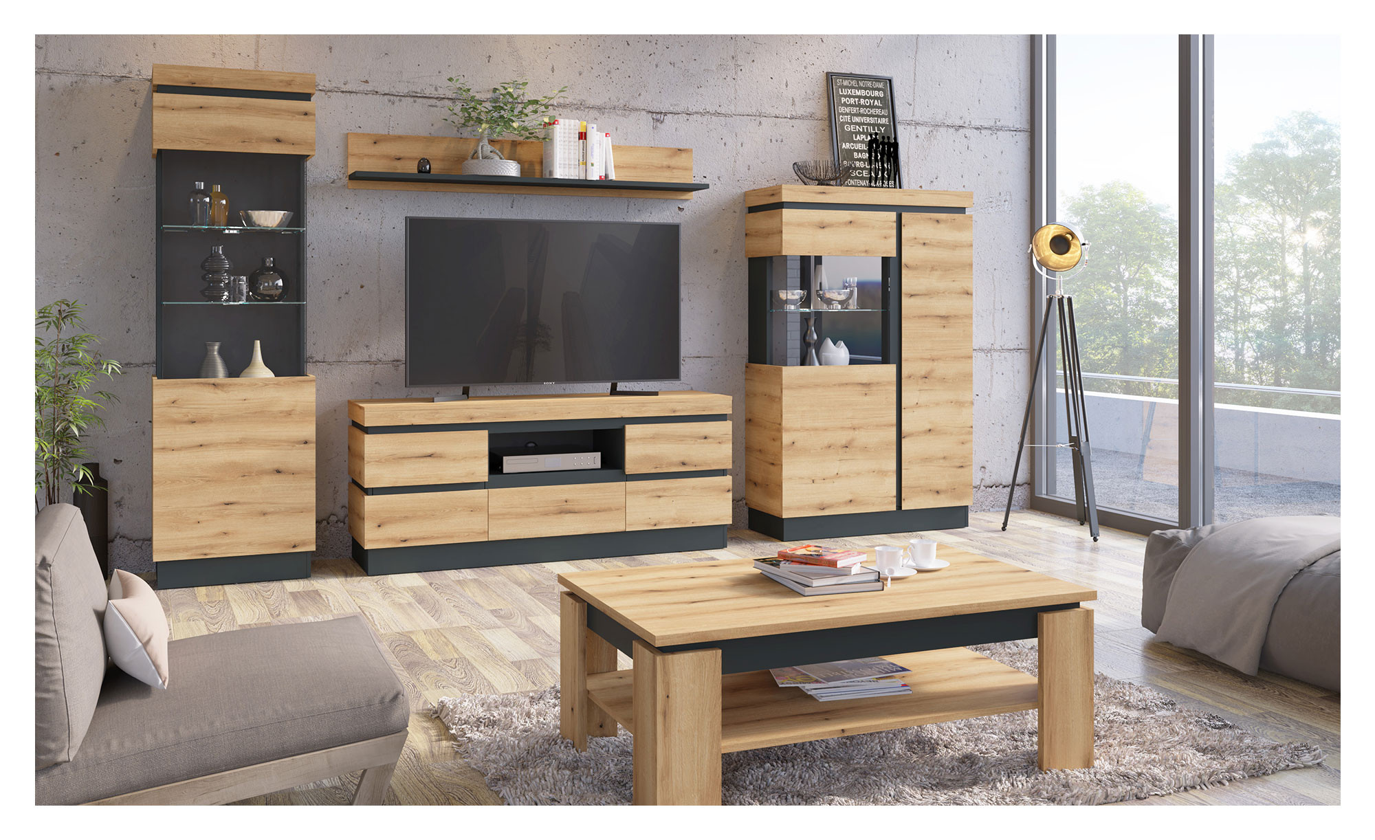 Am Korpus und den Fronten erwartet Sie das naturnahe Dekor Coast Evoke Eiche. Die pflegeleichte Melaminharzbeschichtung auf den Oberflächen bietet einen effektiven Schutz. Eine Absetzung in Kosmos Grau und das schwarze Innendekor sowie die Rückwände und Kunststofffüße in der gleichen Farbe sorgen für einen gelungenen Kontrast.
