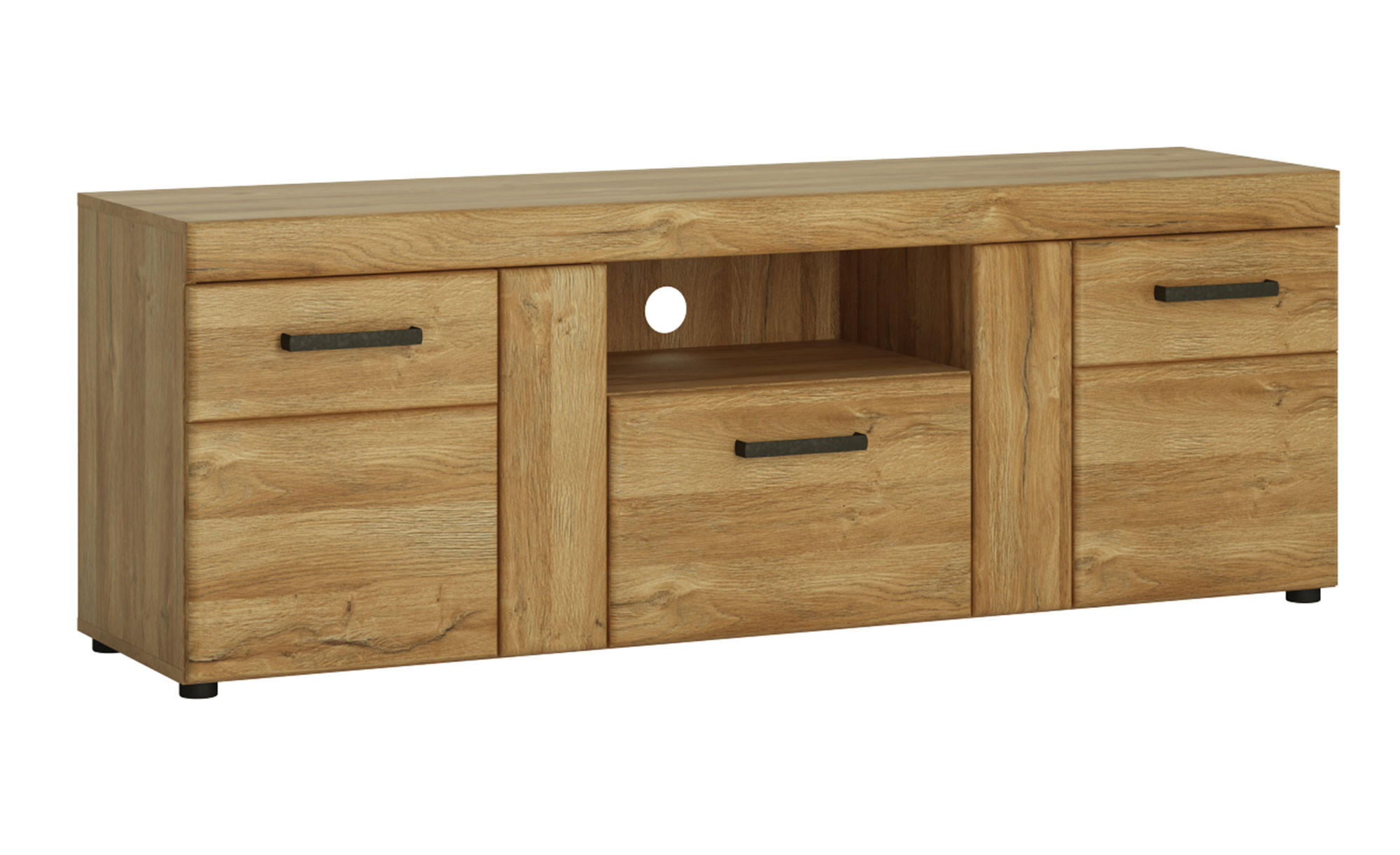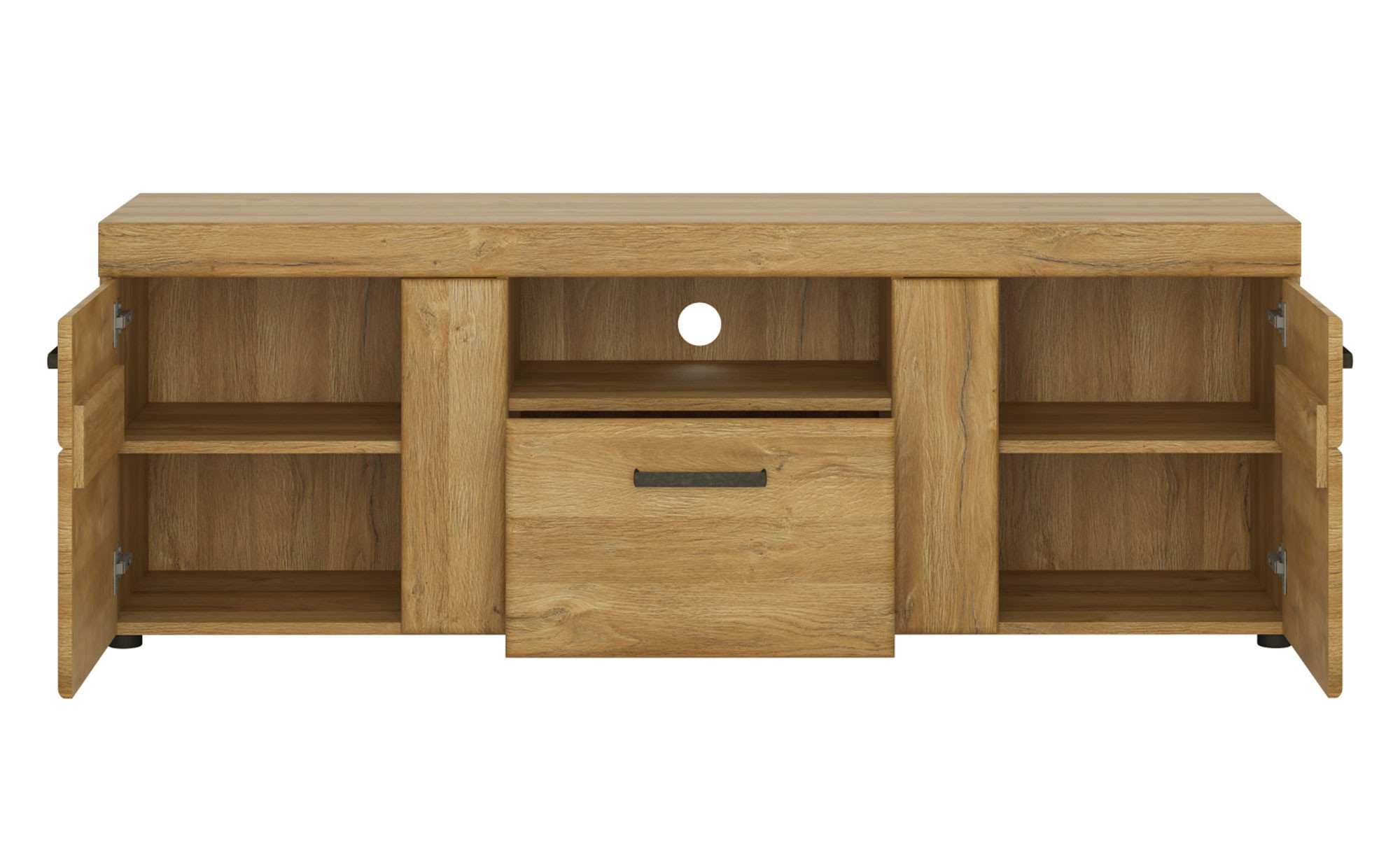 Selbstverständlich bietet das ca. 157 x 56 x 41 cm große TV-Möbel darüber hinaus Platz zur Unterbringung diverser Gegenstände. Dafür verfügt es über zwei gedämpfte Türen, zwei Böden, drei Fächer und eine Schublade.