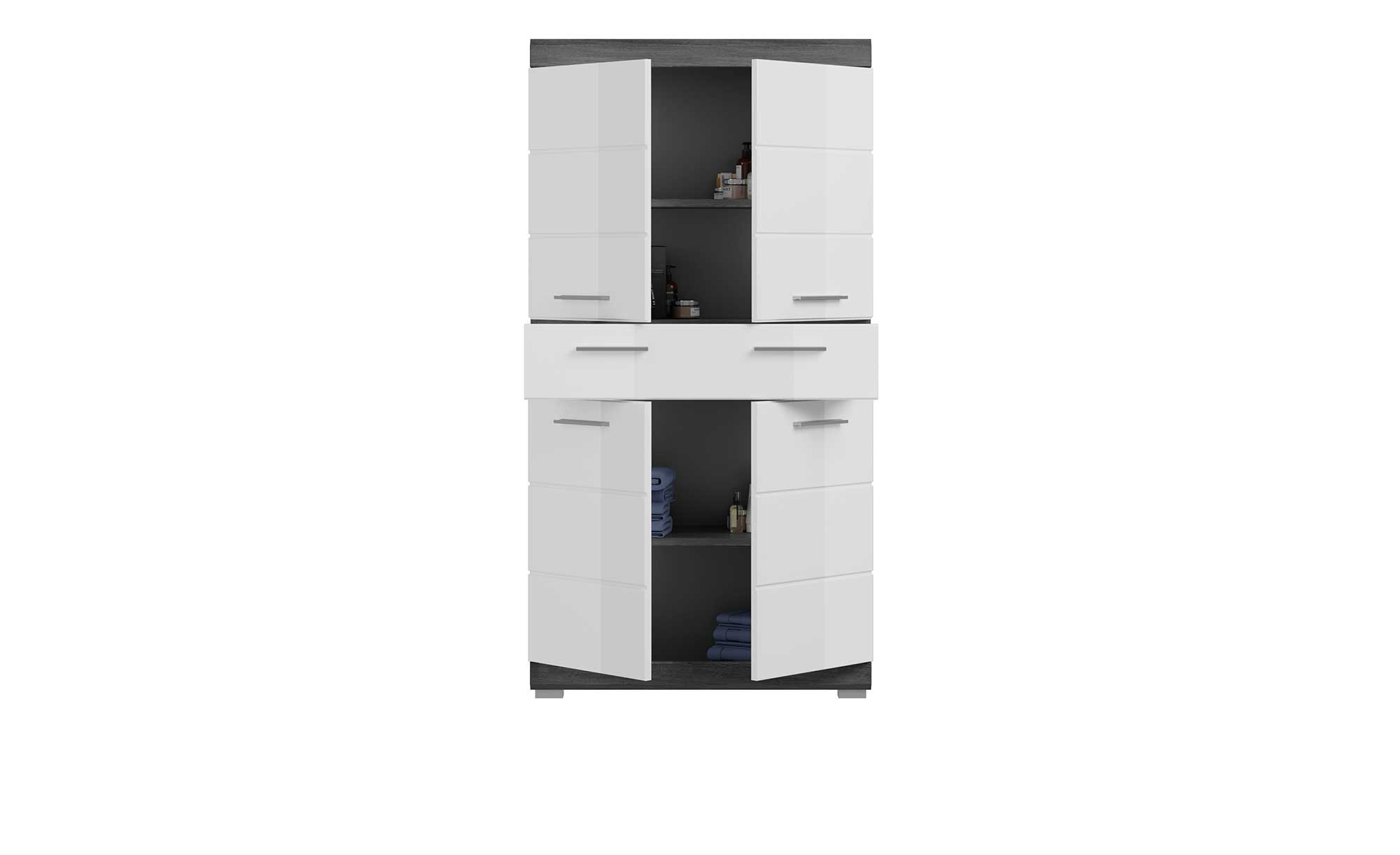 Der Schrank ist ca. 74 x 141 x 34 cm groß und dank seiner glatten Oberflächen sehr pflegeleicht. Während der Korpus aus Holzwerkstoff besteht und in der Farbe Rauchsilber gestaltet wurde, sind die wertigen MDF-Fronten hochglänzend Weiß. Zusätzlich wurden chromfarbige Kunststoffgriffe integriert.