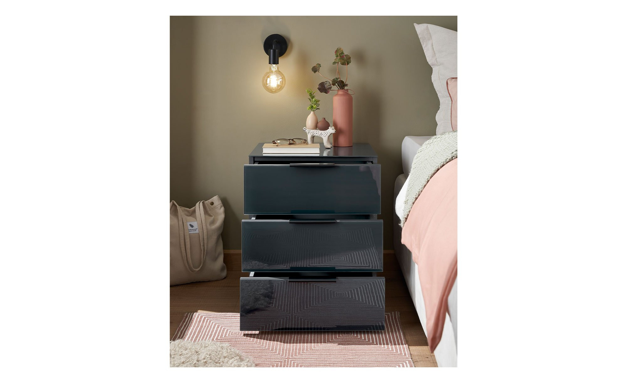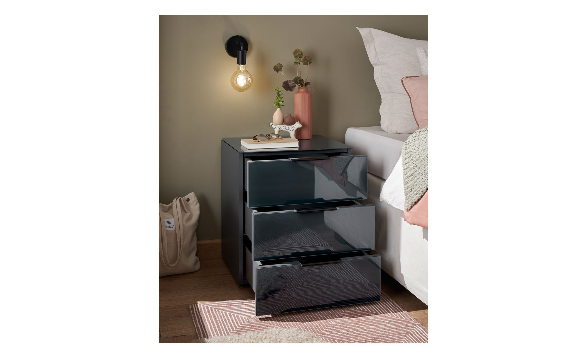 Drei Schubkästen bieten praktischen Stauraum und lassen sich dank der schwarzen Kunststoffgriffe bequem bedienen – ein dezenter Kontrast, der auch dem Erscheinungsbild das gewisse Etwas verleiht.