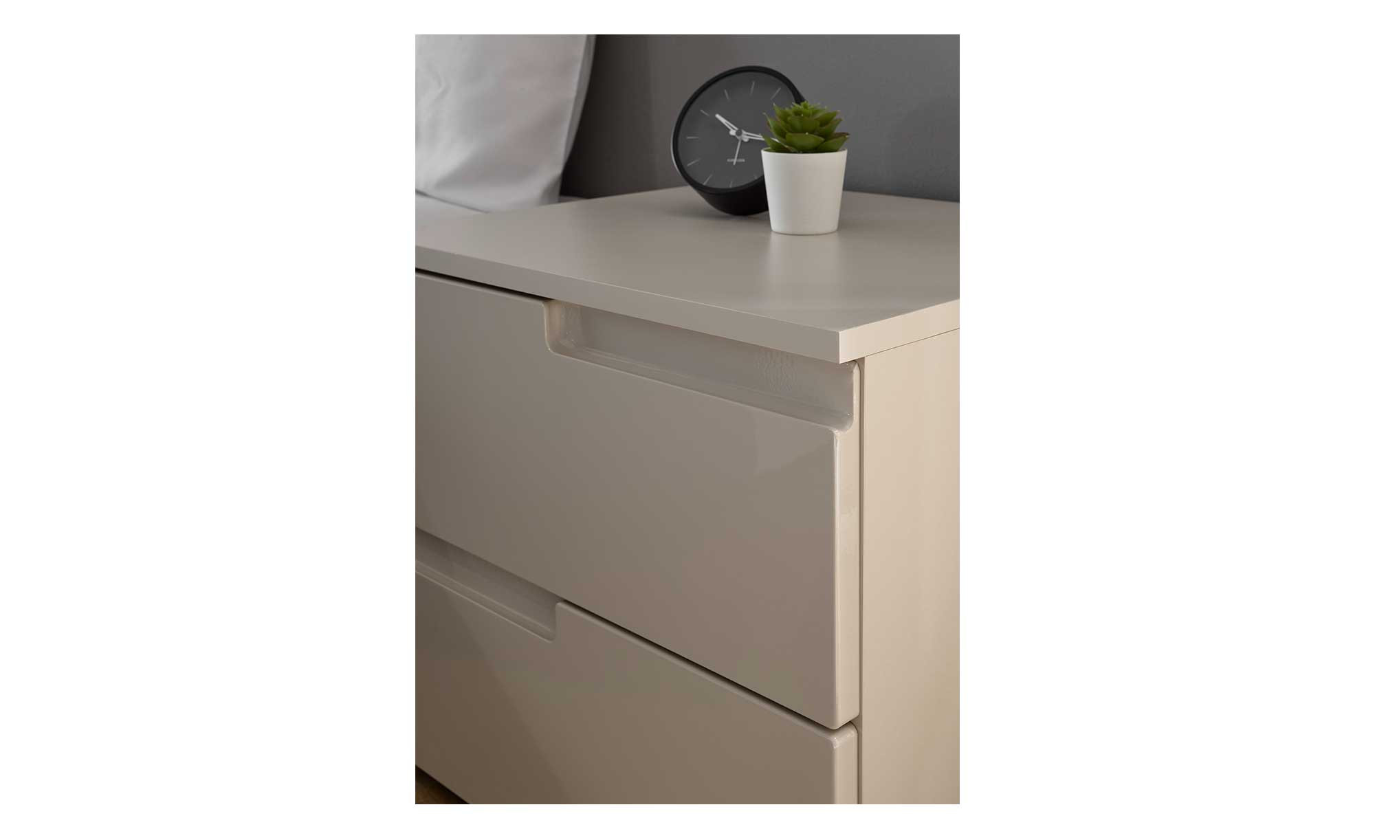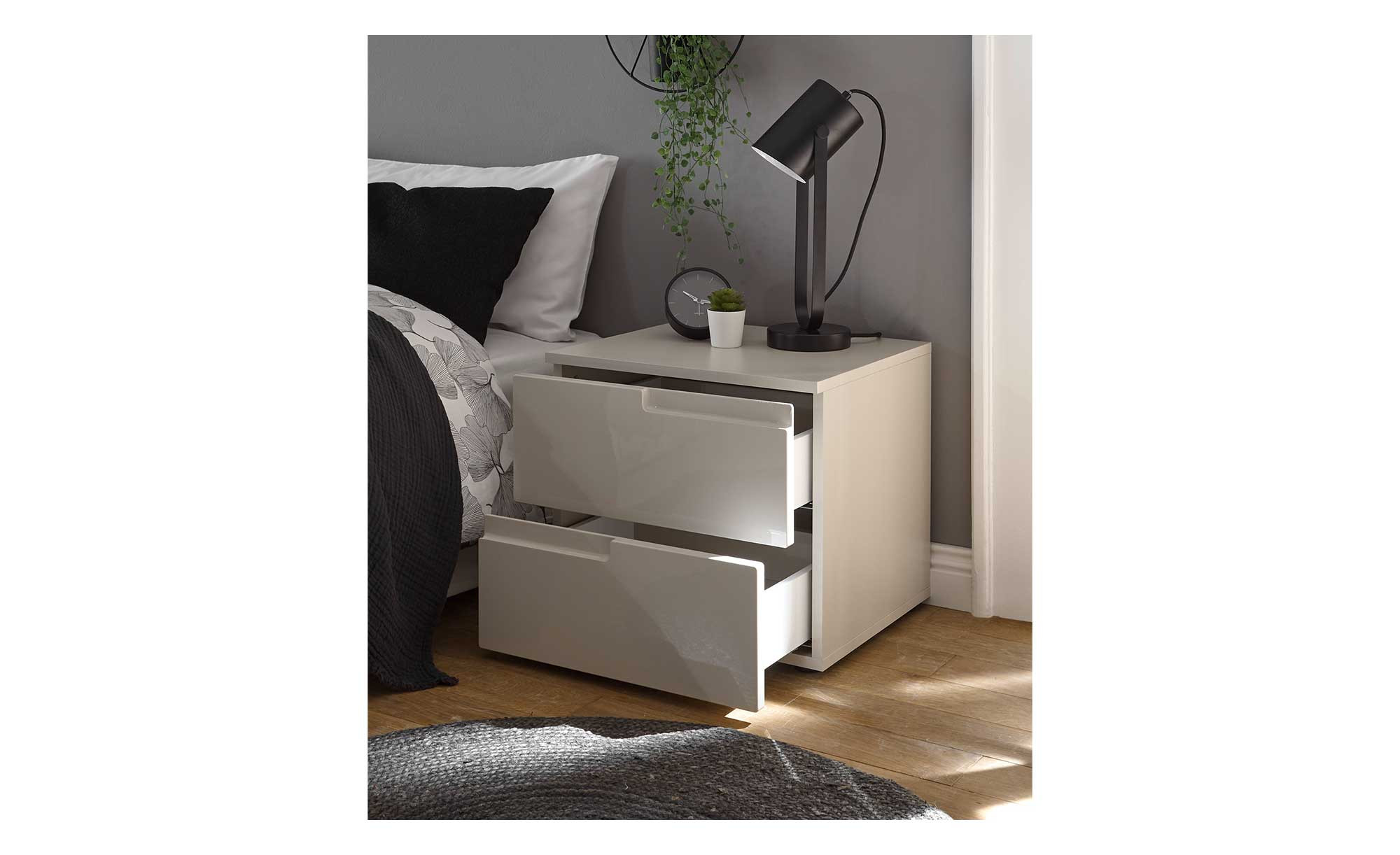 An den beiden Schubkästen gibt es hochglänzende Fronten im gleichen Farbton. Mit ihrem grifflosen Look befinden sie sich absolut am Puls der Zeit. Freuen Sie sich auf eine großzügige Ablagefläche und Stauraum in einem!