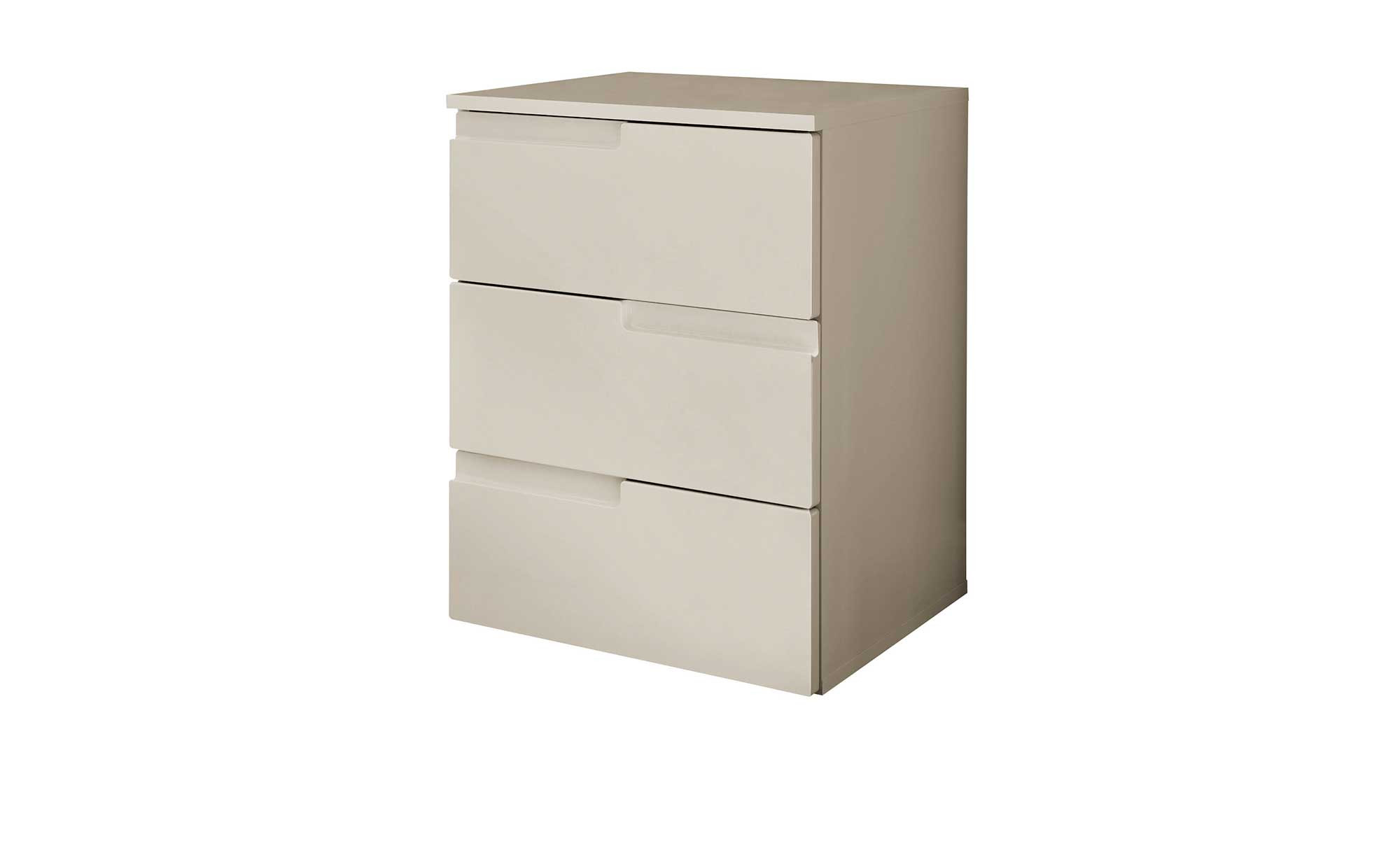 Sowohl der Korpus als auch die hochglänzenden Fronten des ca. 46 x 62 x 40 cm großen Schranks tragen dank einer Dekorfolie die Farbe Champagner. Die Oberflächen am aus Holzwerkstoff bestehenden Korpus sind zusätzlich mit Melamin beschichtet und präsentieren sich hierdurch absolut robust.