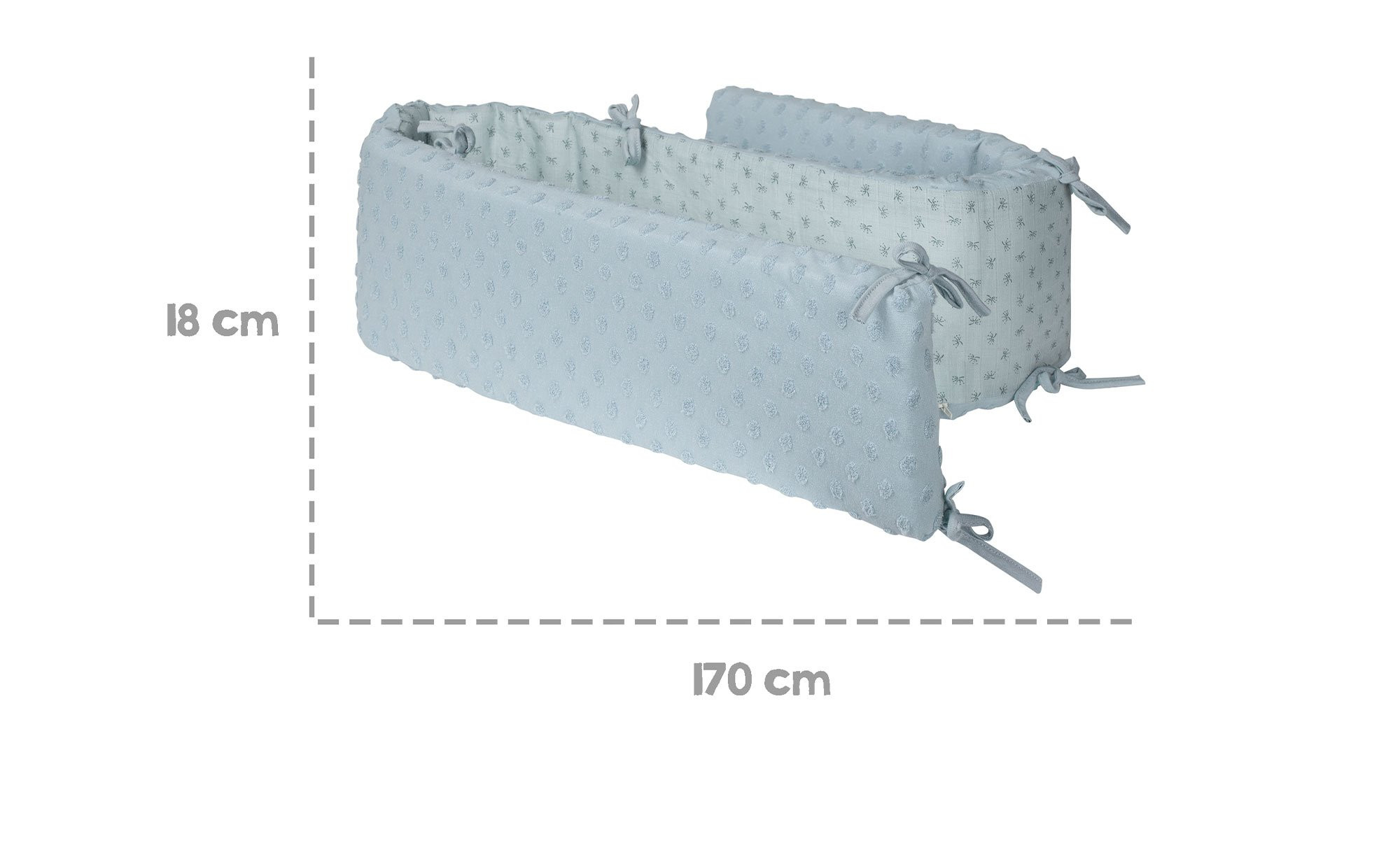 Durch seine Größe von ca. 170 x 4 x 16 cm eignet sich das Nestchen ideal für Babybetten mit Maßen von ca. 60 x 120 cm oder ca. 70 x 140 cm. Dank angenähter Stoffbänder lässt es sich schnell und sicher befestigen. Sanfte Farbtöne in Hellblau / Sky bringen Behaglichkeit und Ruhe ins Kinderzimmer.