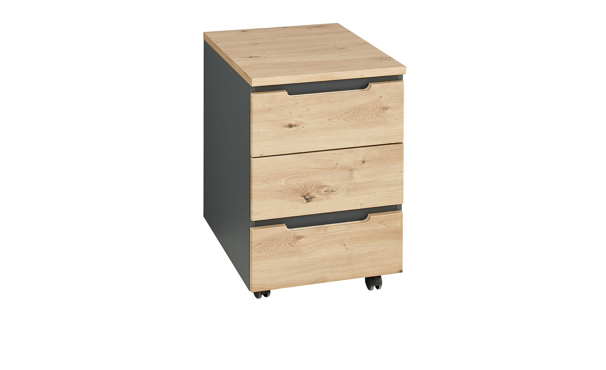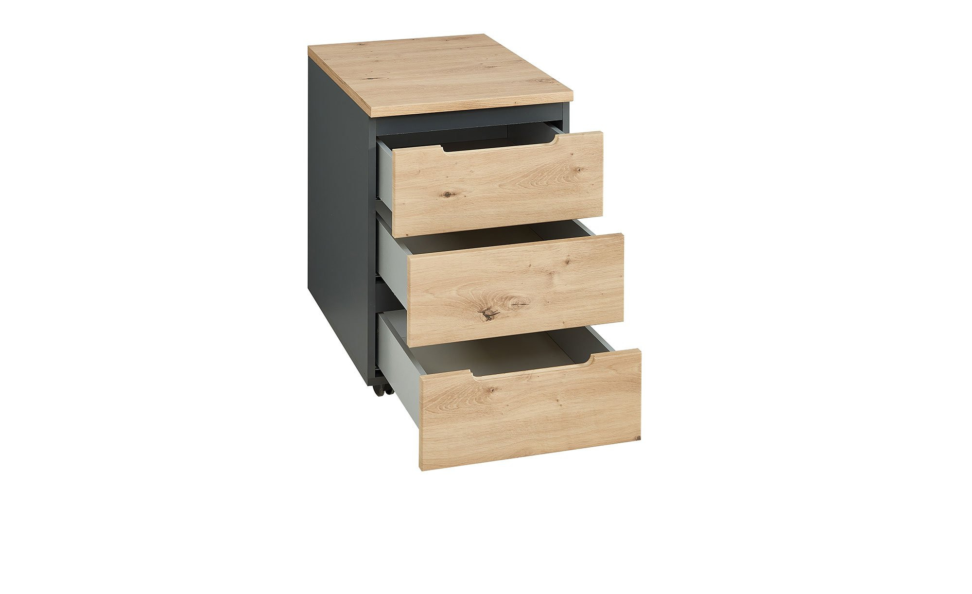 Der Korpus des ca. 45 x 66 x 55 cm großen Möbelstücks besteht aus Holzwerkstoff im stilvollen Ton Graphit. Seine Front und den Oberboden hingegen ziert eine natürliche Artisan Eiche Nachbildung, sodass ein kontrastreiches Gesamtbild entsteht. Neben modernen Griff-Ausfräsungen erwarten Sie auch vier Rollen, zwei davon mit Bremse.