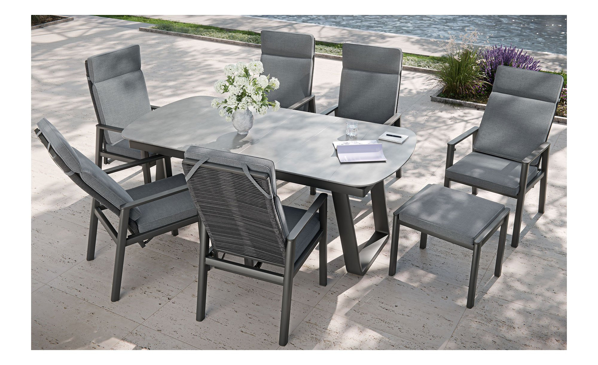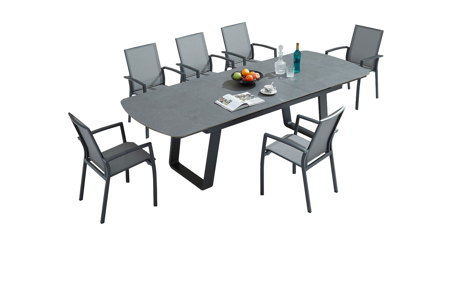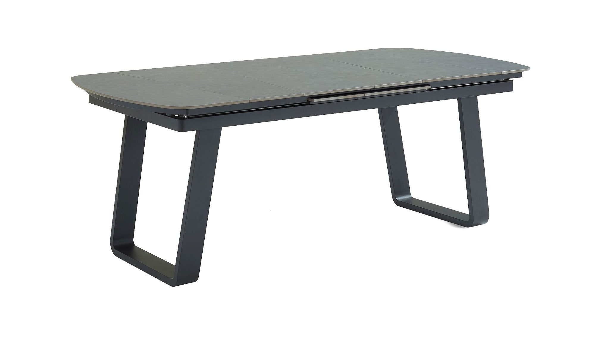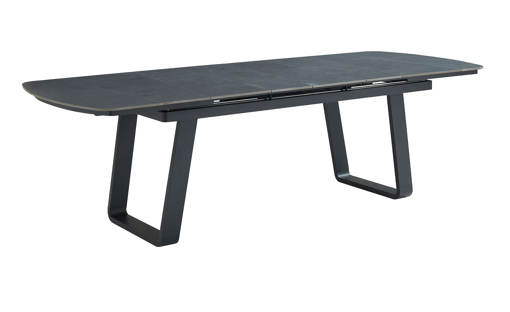 Die ovale Platte des Tischs besteht aus gesintertem Stein in Dunkelgrau und springt unmittelbar ins Auge. Sie ist ca. 9 mm stark und wird von einem pulverbeschichteten Aluminiumgestell mit Kufen getragen.