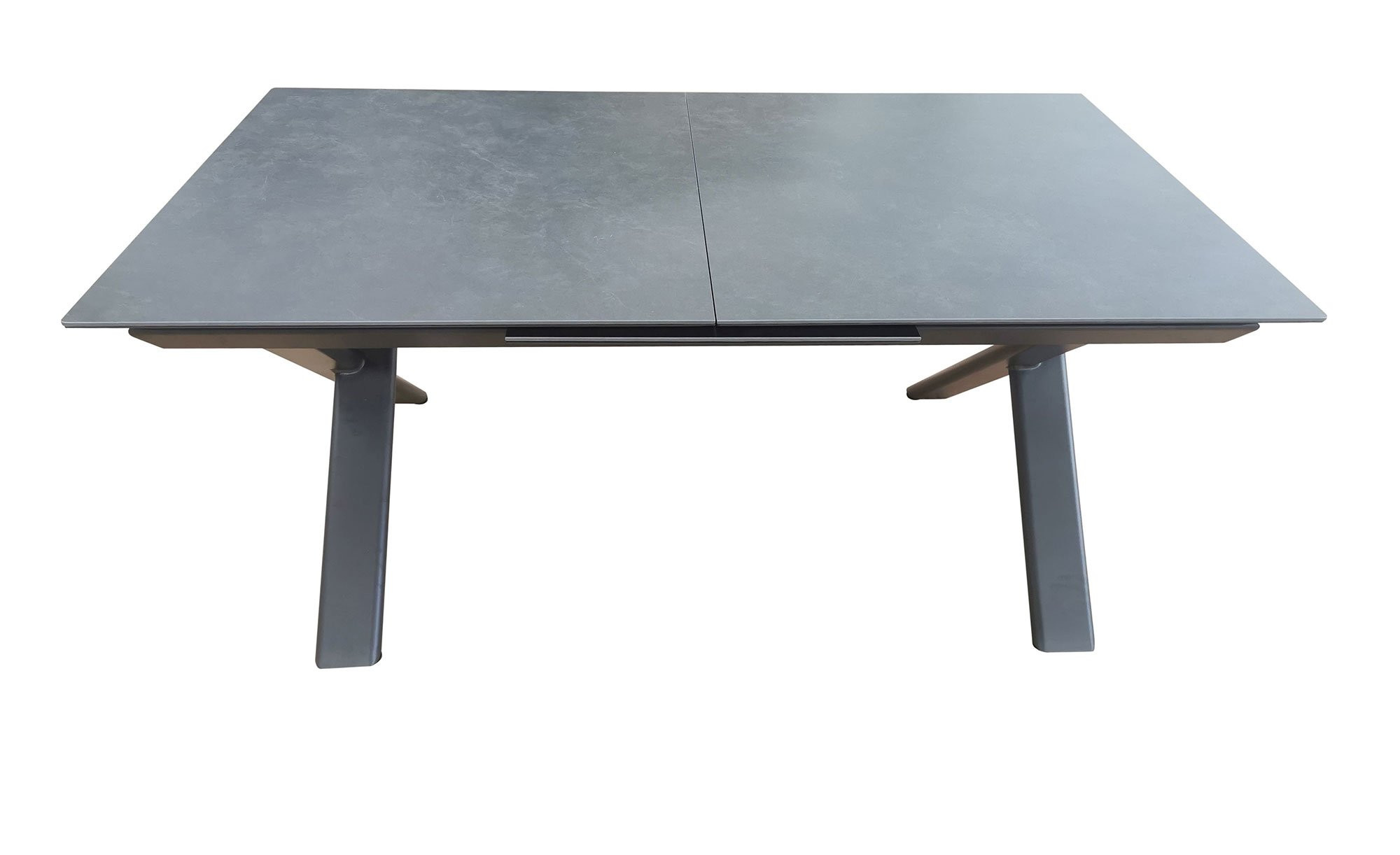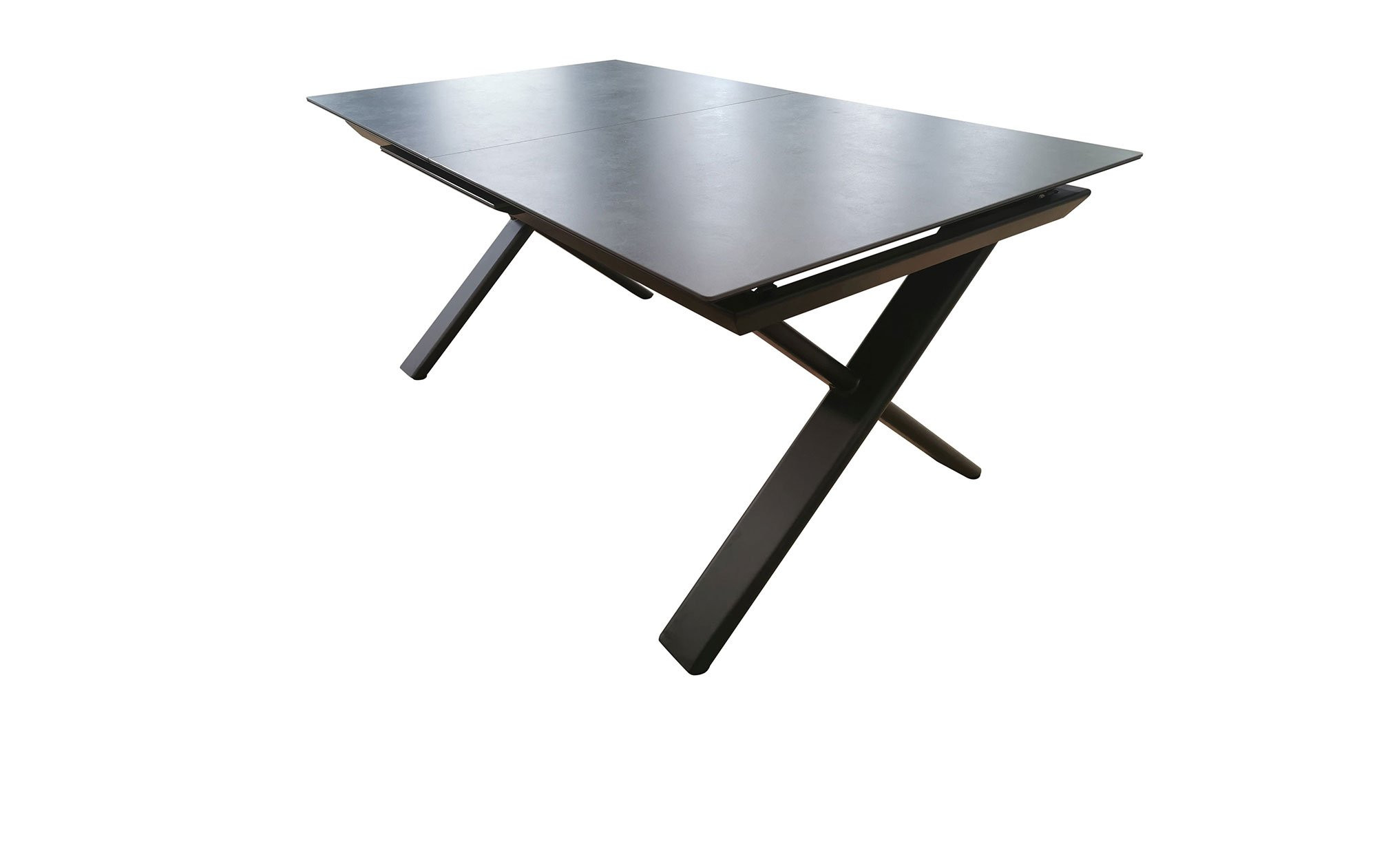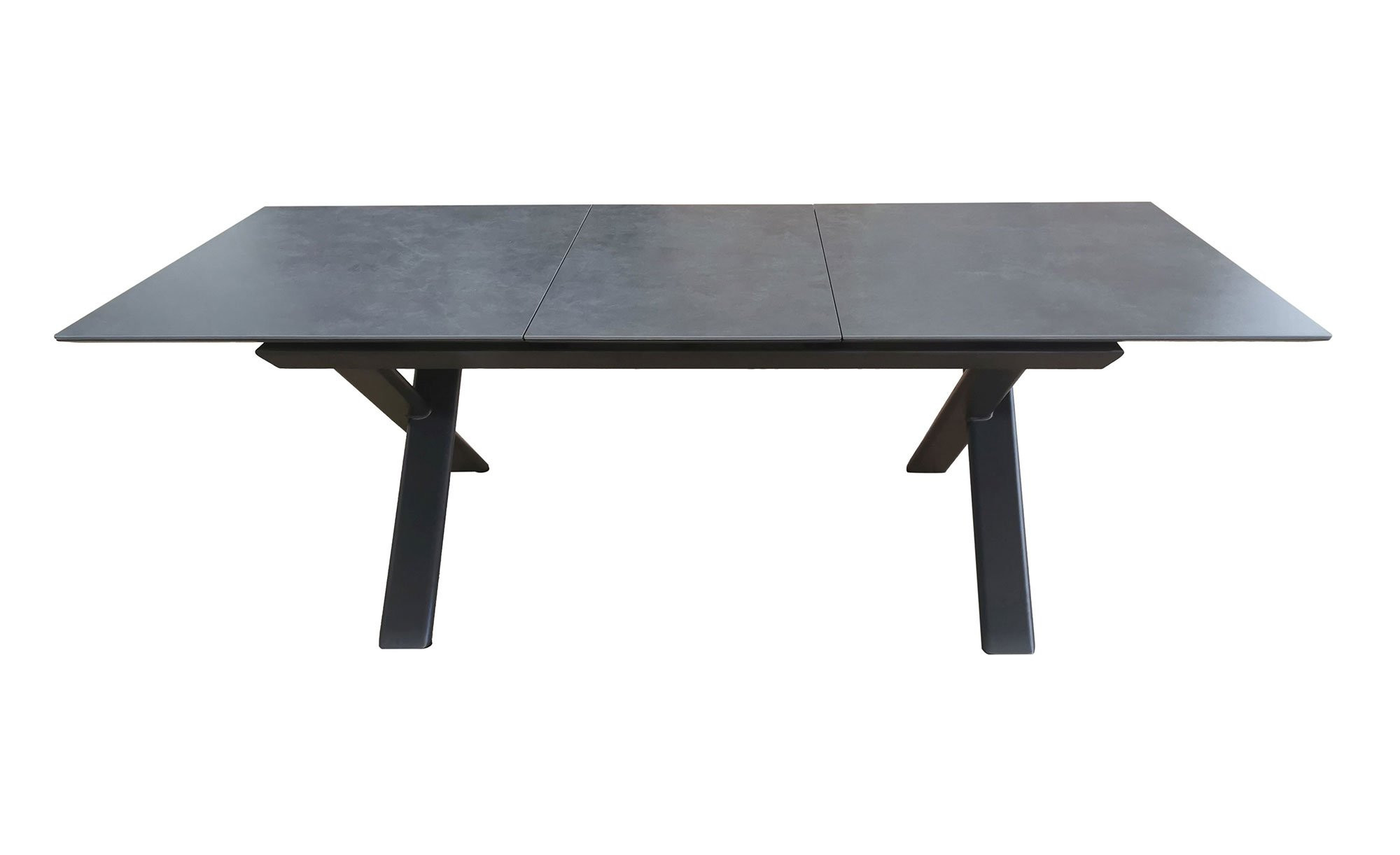 Für einen sicheren Stand sorgt beim outdoor Ausziehtisch Vancouver ein markantes X-Gestell aus anthrazitfarbigem, pulverbeschichtetem Aluminium. Die ca. 120 x 40 mm starken Rohr-Tischbeine tragen eine rechteckige Platte aus dunkelgrauem Sinterstein, die durch ihre robuste Oberfläche überzeugt.