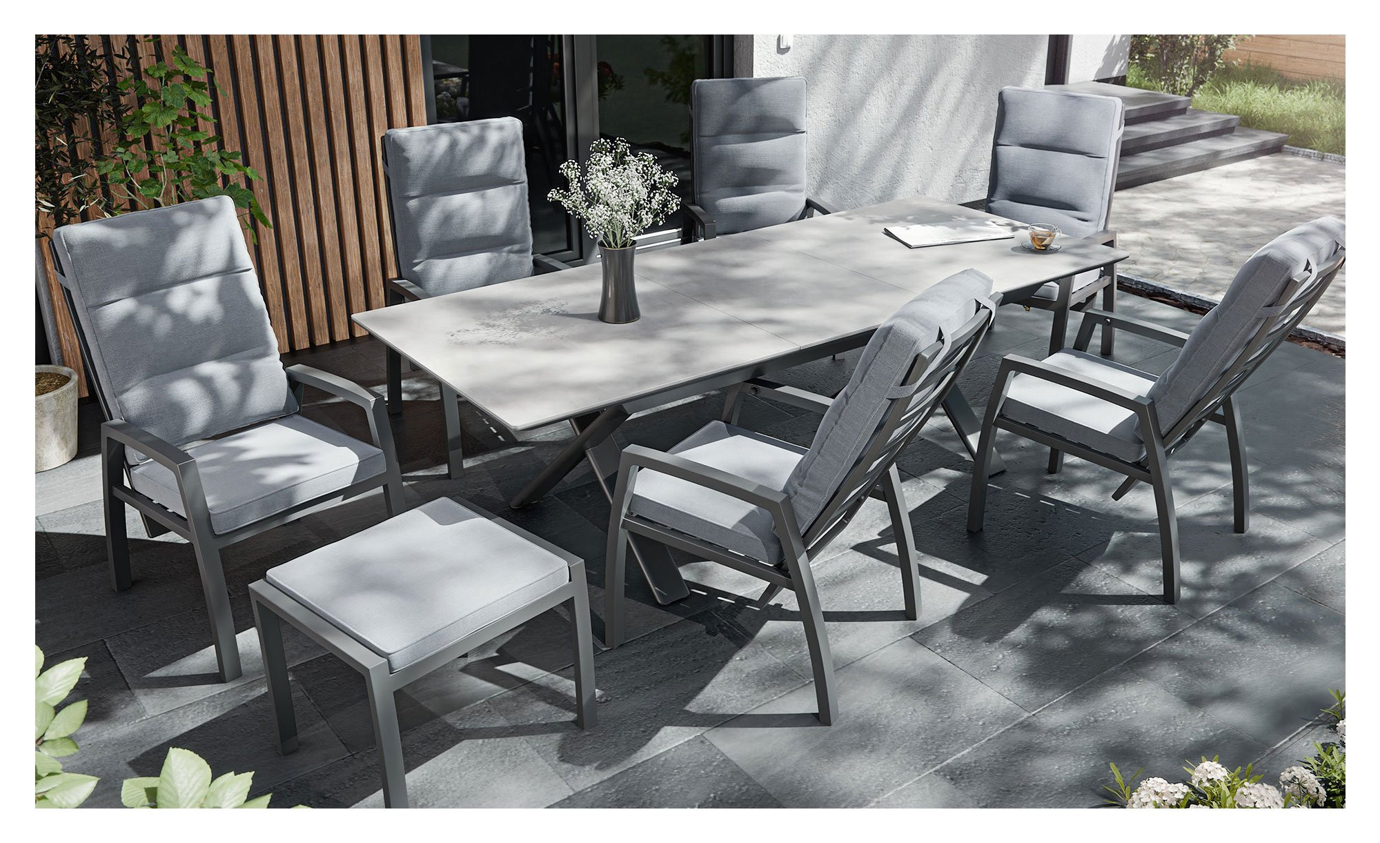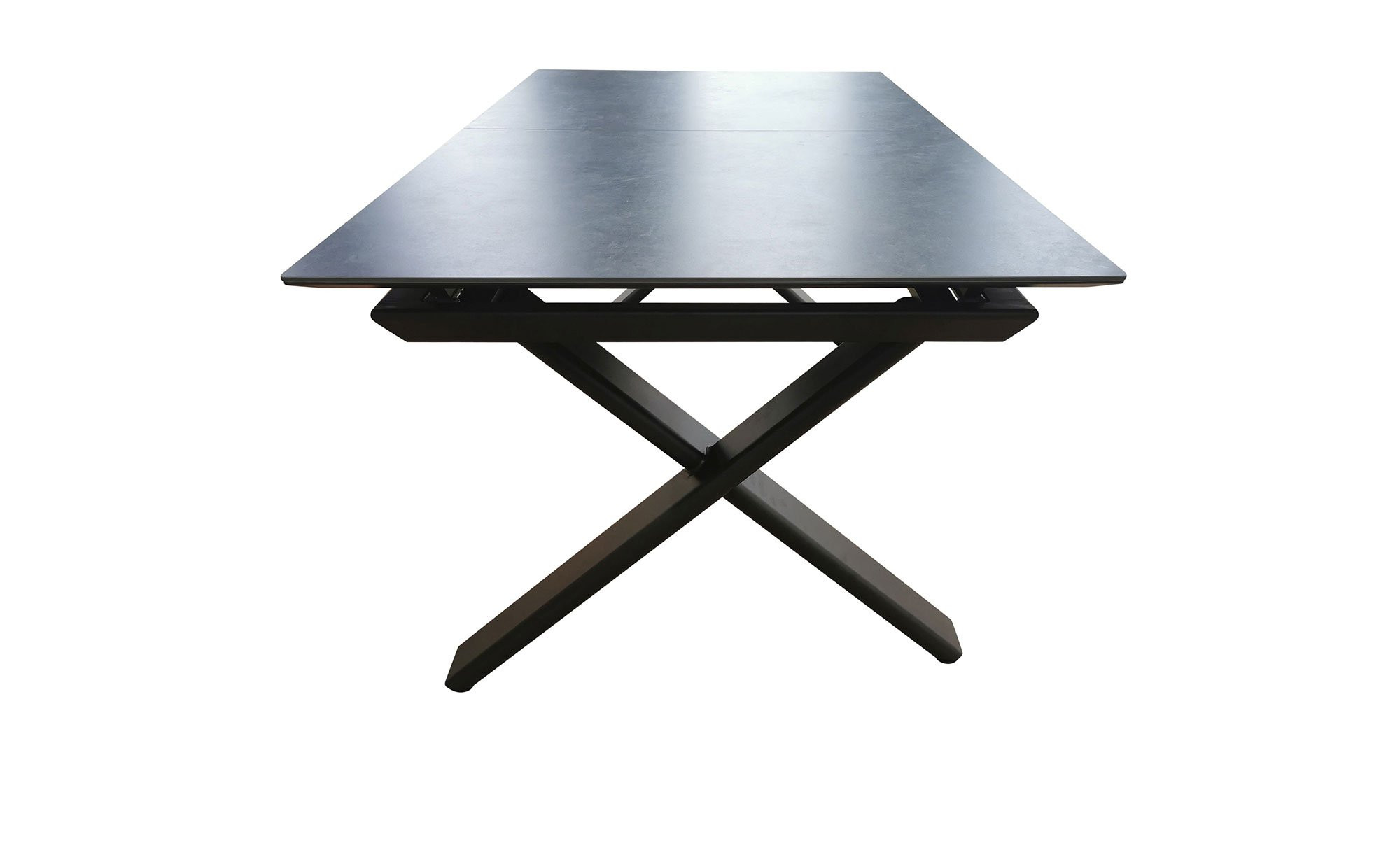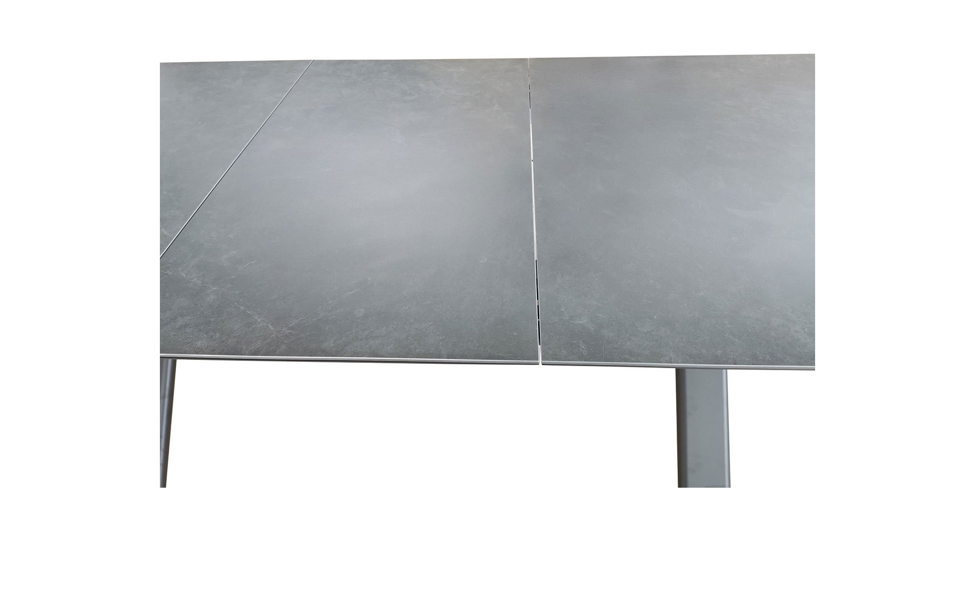 Für einen sicheren Stand sorgt beim outdoor Ausziehtisch Vancouver ein markantes X-Gestell aus anthrazitfarbigem, pulverbeschichtetem Aluminium. Die ca. 120 x 40 mm starken Rohr-Tischbeine tragen eine rechteckige Platte aus dunkelgrauem Sinterstein, die durch ihre robuste Oberfläche überzeugt.