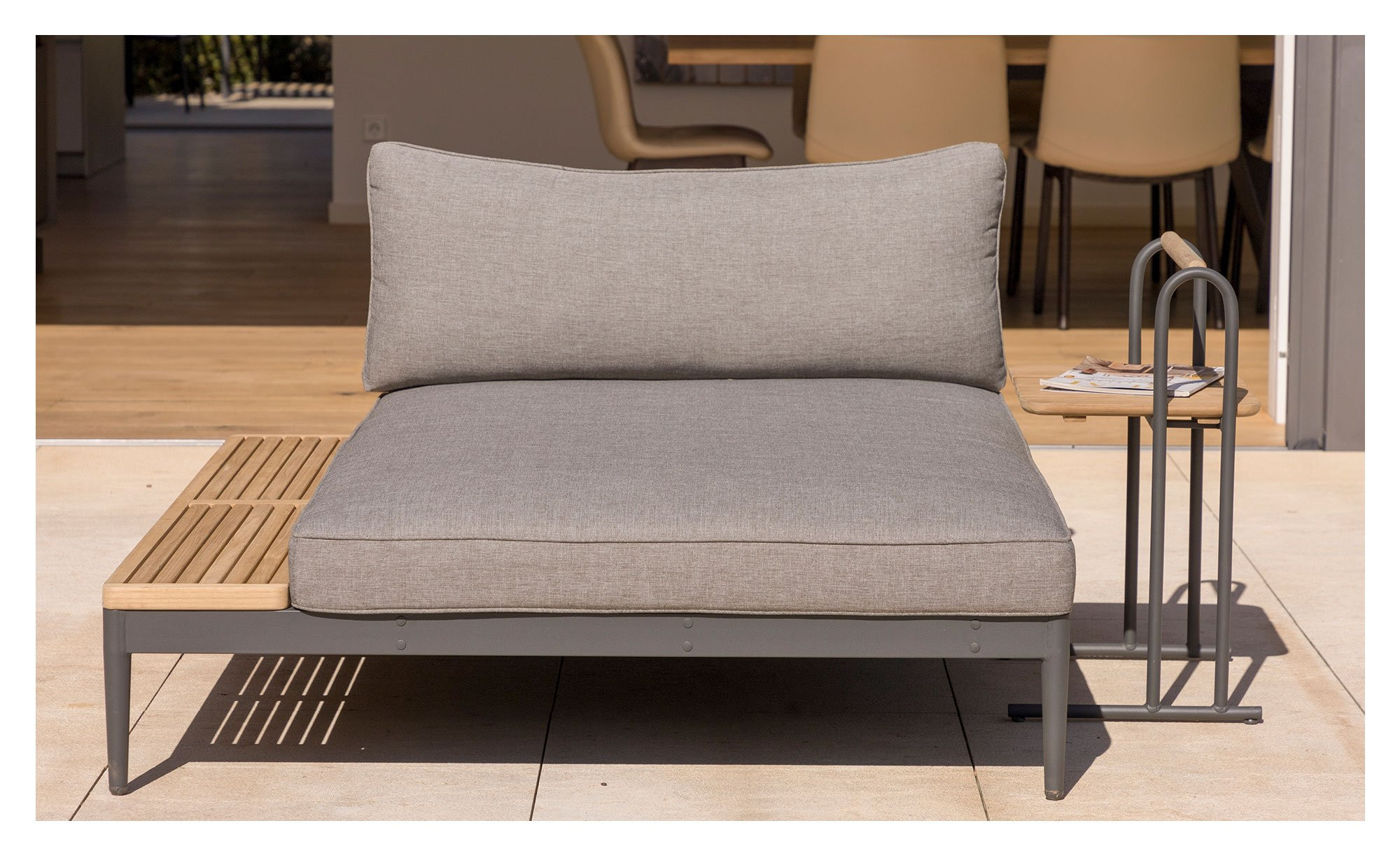 Im Lieferumfang enthalten sind Kissen für die Rückenlehne und die Liegefläche. Sie sind mit grauem Olefin aus 100 % Polypropylen bezogen, das sich bei Bedarf jederzeit abnehmen und waschen lässt.