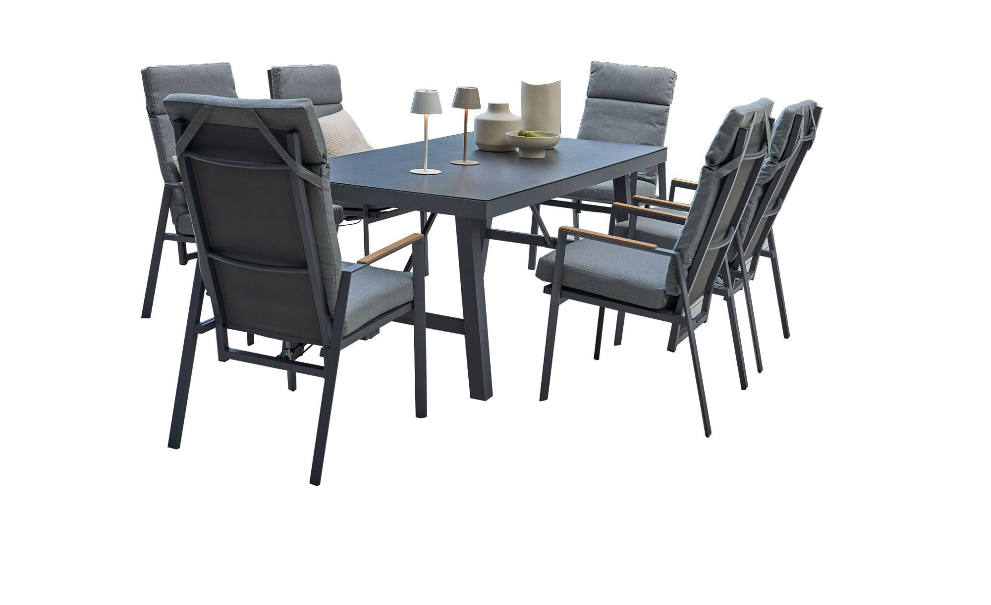 Zum Angebot gehören ein Tisch und sechs bequeme Liegestühle, die die Zeit wie im Fluge vergehen lassen werden. Da die Möbel für einen Einsatz im Garten, auf der Terrasse oder dem Balkon konzipiert wurden, sind sie natürlich vollkommen UV- und wetterbeständig!