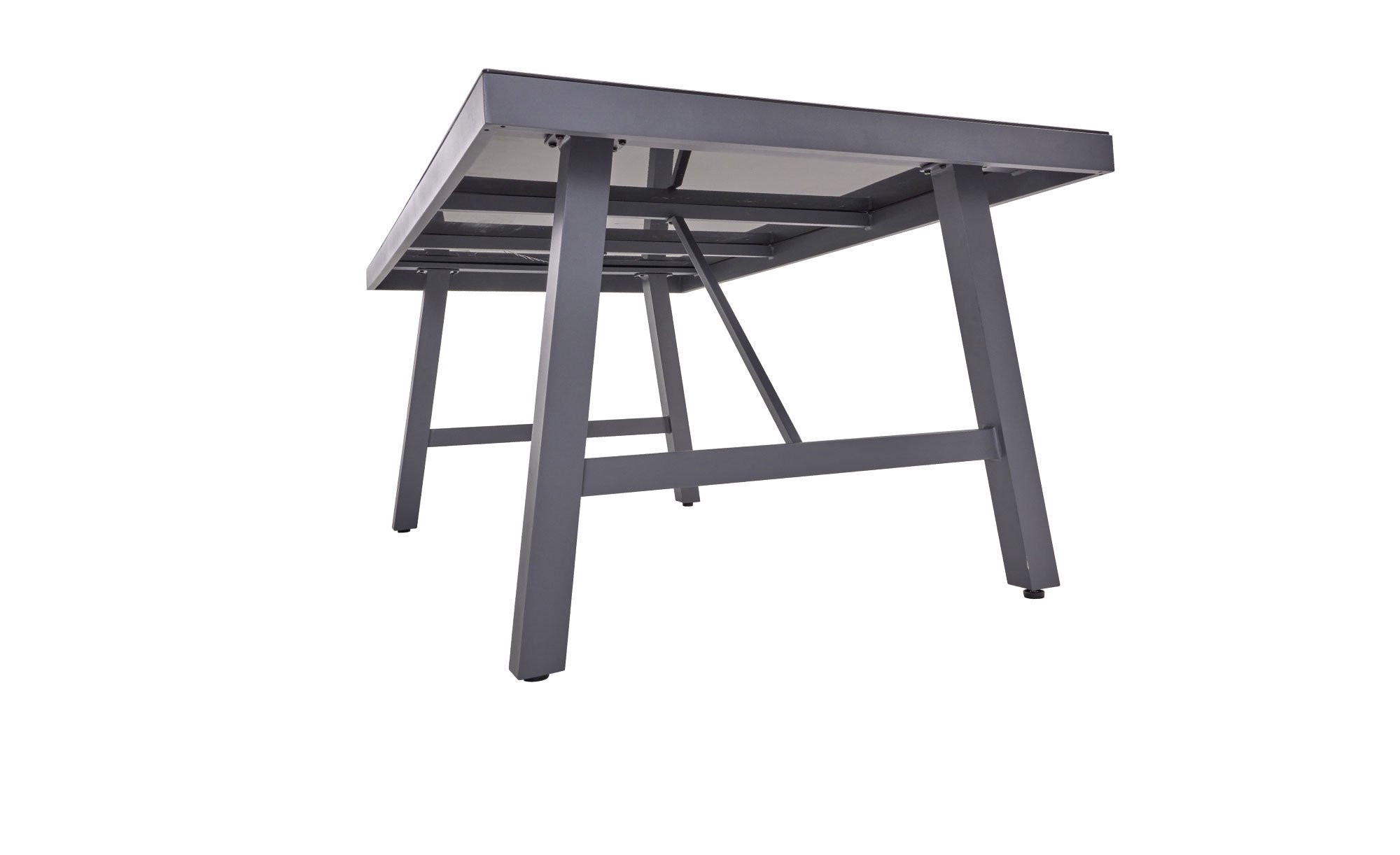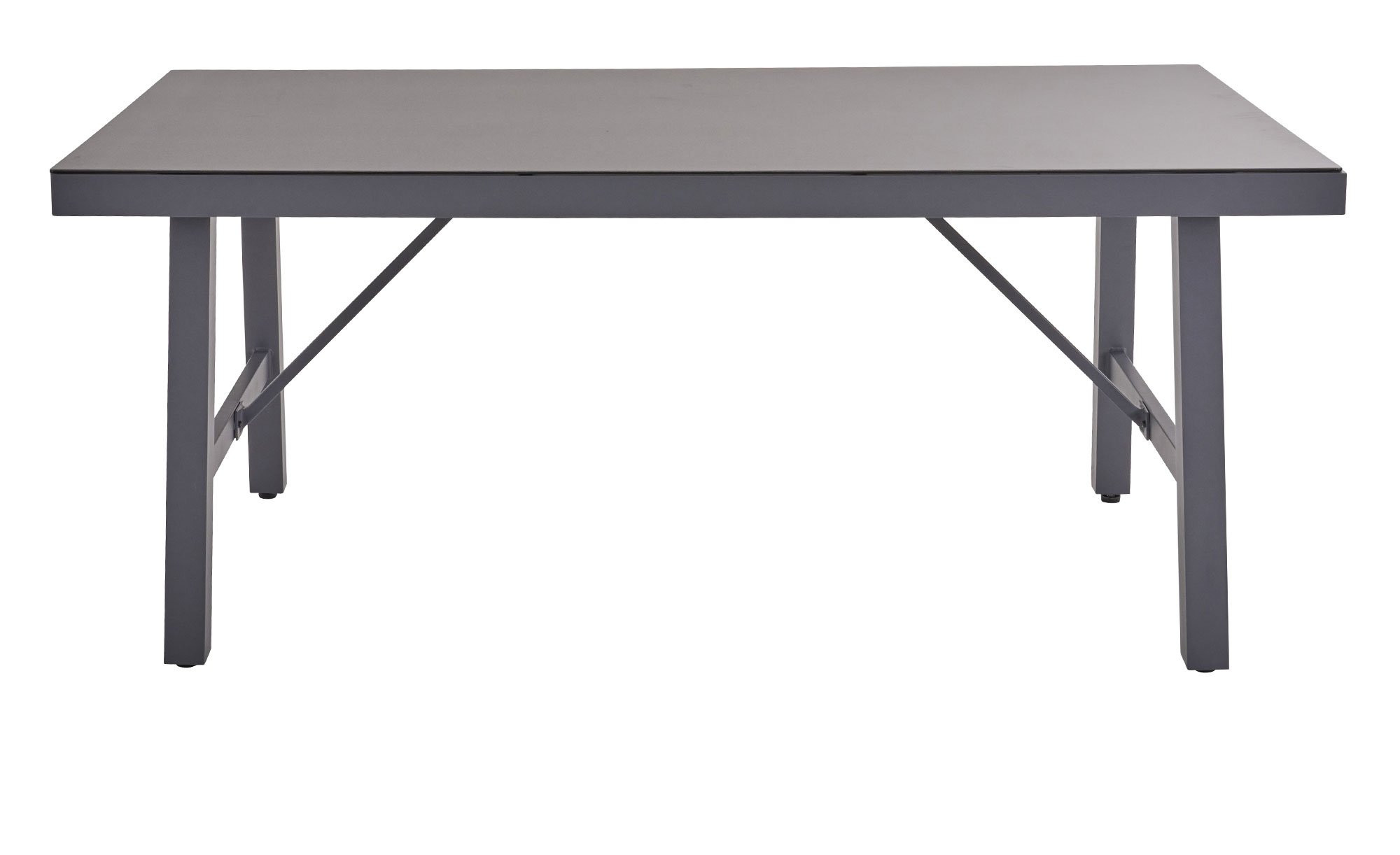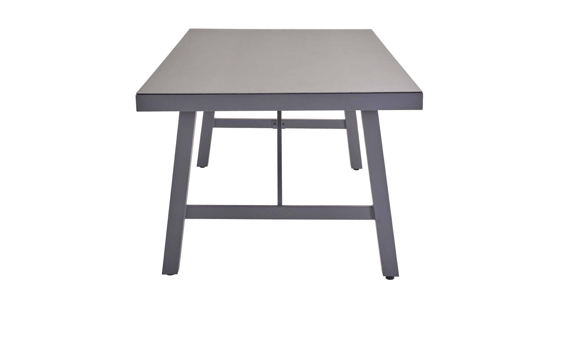 Alle Möbel des Dining-Sets Grado verfügen über ein Gestell aus grauem Aluminium mit vier Beinen. Beim ca. 180 x 74 x 100 cm großen Tisch kommt noch eine ebenfalls graue Platte aus 3D-Glas hinzu, die mit max. 100 kg belastet werden kann.
