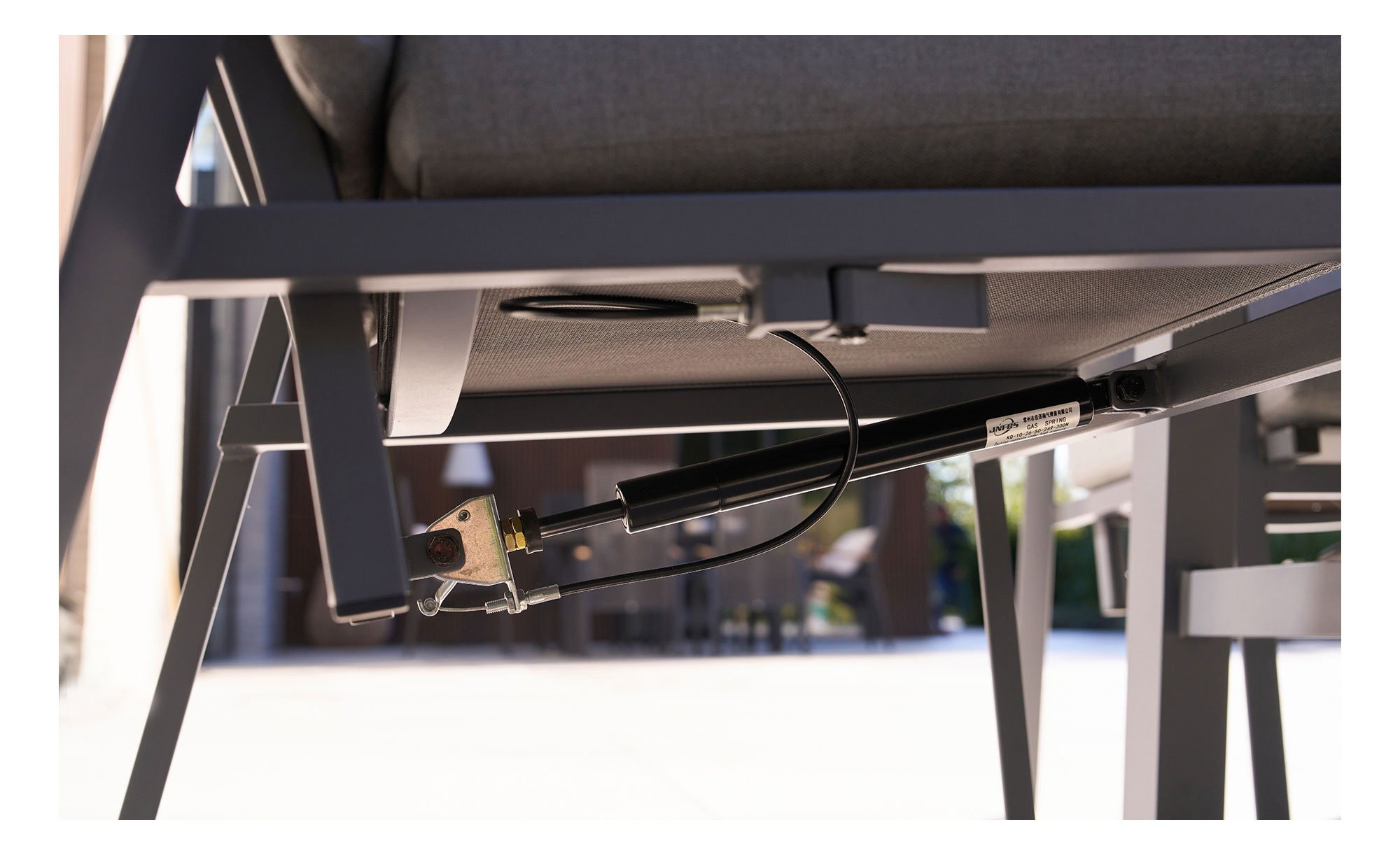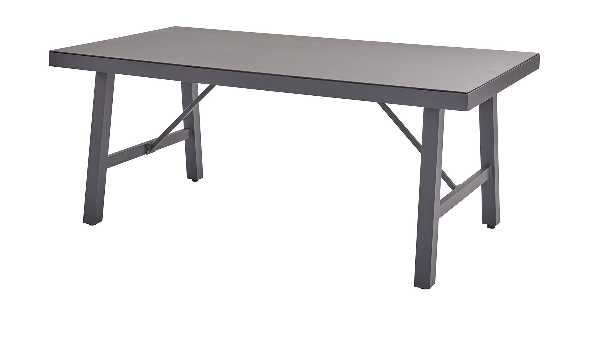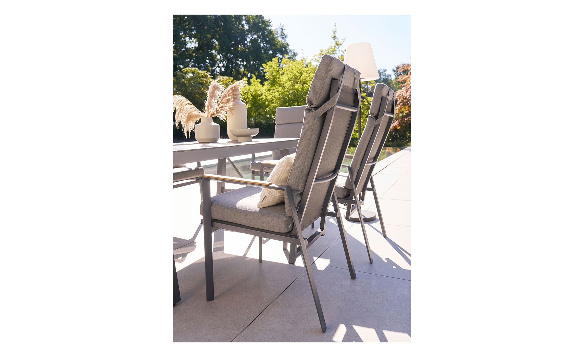 Alle Möbel des Dining-Sets Grado verfügen über ein Gestell aus grauem Aluminium mit vier Beinen. Beim ca. 180 x 74 x 100 cm großen Tisch kommt noch eine ebenfalls graue Platte aus 3D-Glas hinzu, die mit max. 100 kg belastet werden kann.