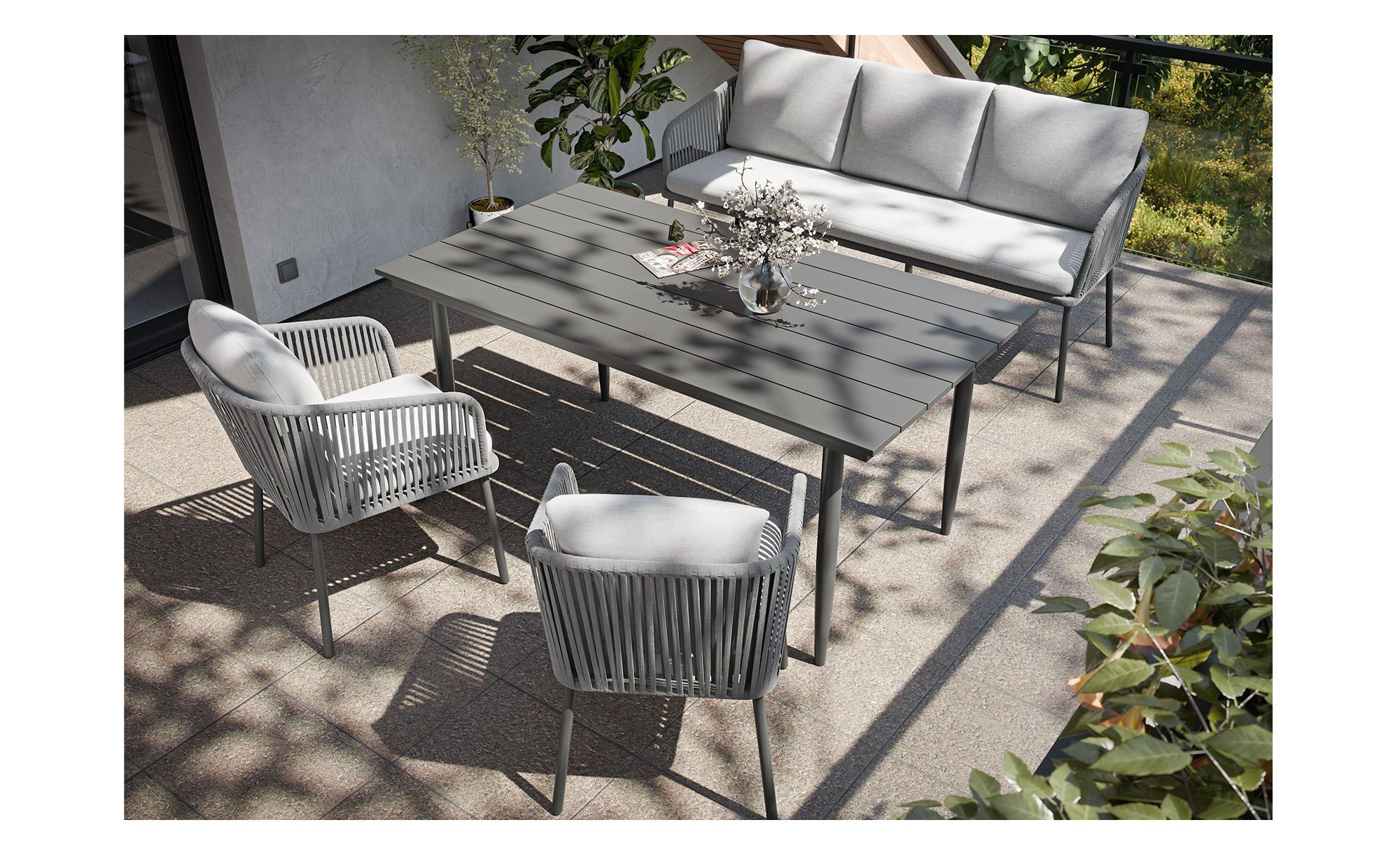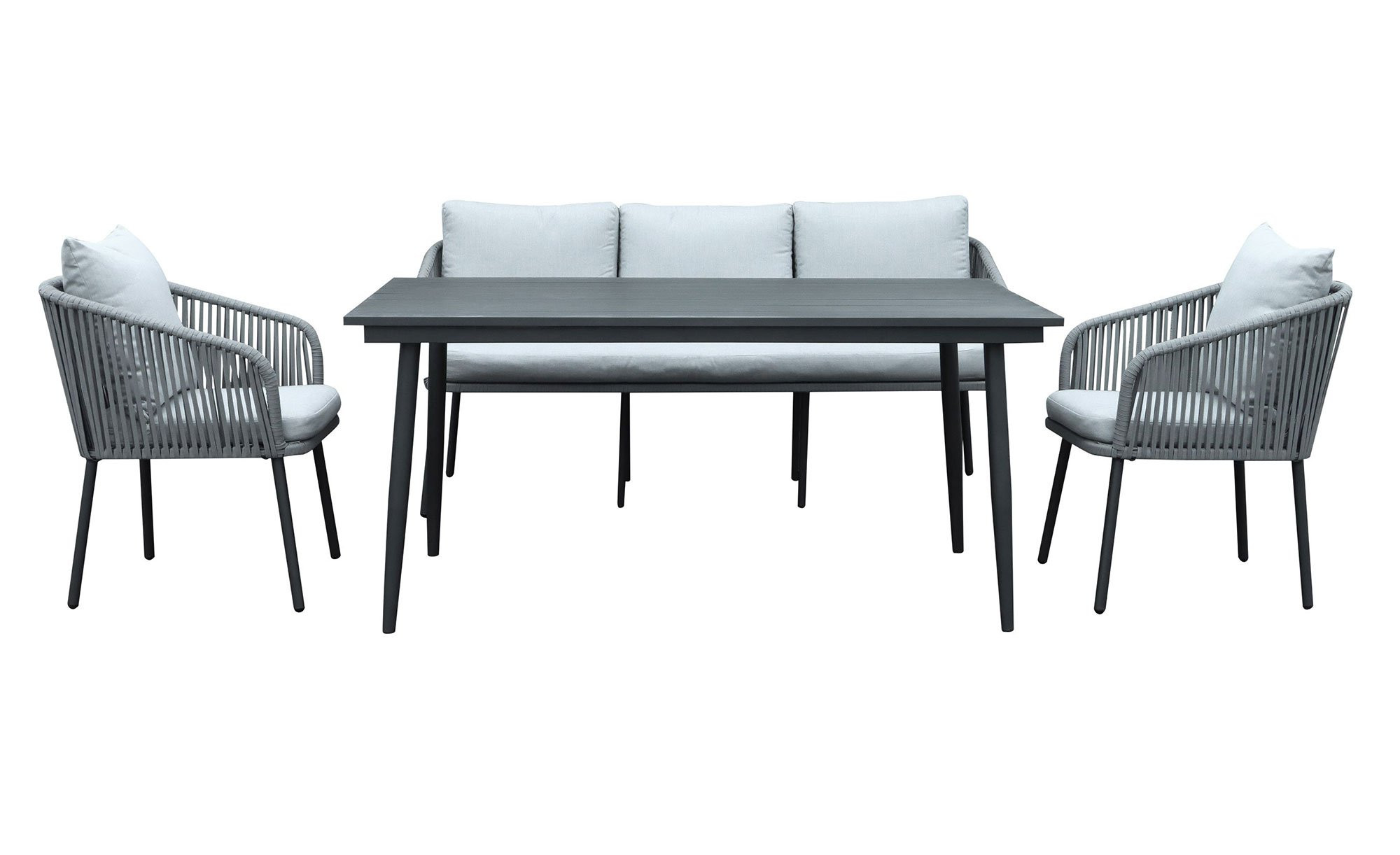 Stabile 4-Fuß-Gestelle aus Aluminium sorgen bei den Gartenmöbeln für die nötige Stabilität. Beim ca. 160 x 87 x 73,5 x cm großen Tisch befindet sich darauf zusätzlich eine schwarze Platte aus Stahl. Die Sitzmöbel hingegen verfügen über ein graues Seilgeflecht aus Textilene. Somit gewährleisten sowohl die ca. 179 x 64,5 x 50 cm umfassende Bank als auch die Sessel mit Maßen von jeweils ca. 56,5 x 63 x 45 cm ein komfortables Sitzgefühl.