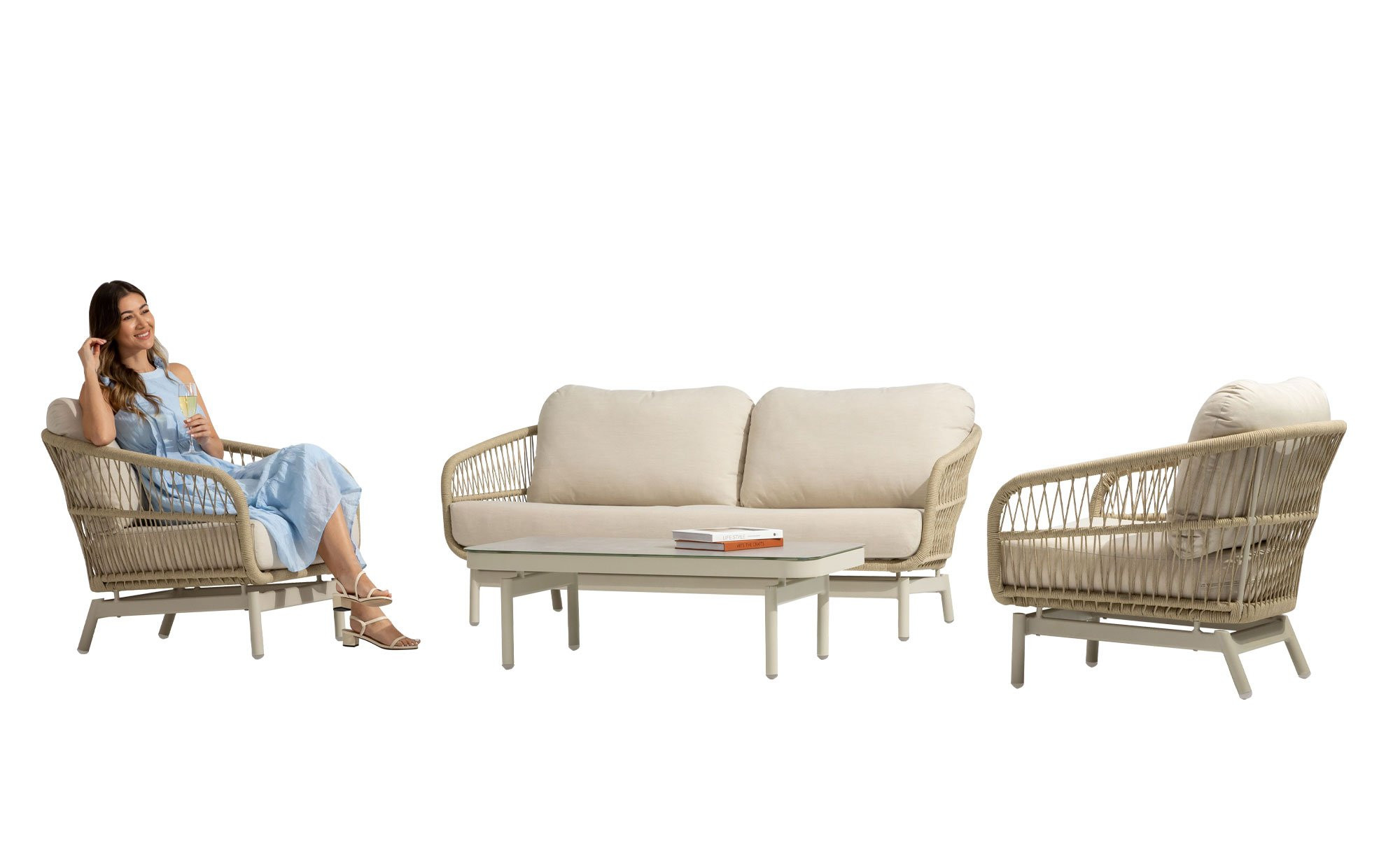 An den Rückenlehnen der Sitzmöbel findet sich ein hellbraunes Seilgeflecht mit einem Durchmesser von ca. 6 mm. Ergänzt wird der Sitzkomfort durch weiche Schaumstoffpolster mit beigen Bezügen aus Olefin. Auch dieser Stoff ist wetterbeständig und pflegeleicht. Die maximale Belastbarkeit der Sitzplätze beträgt jeweils ca. 120 kg.