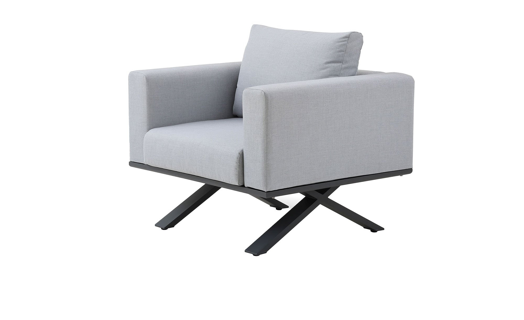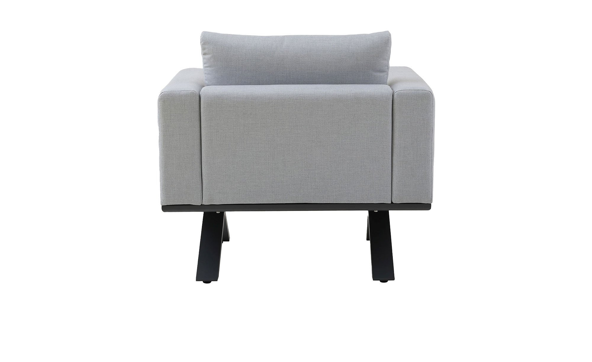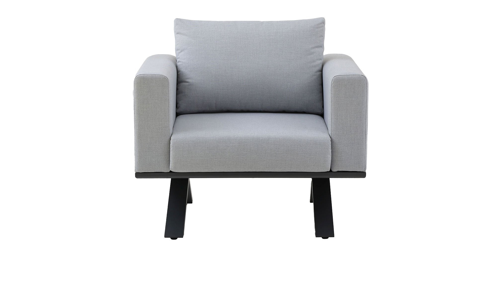 Ein pulverbeschichtetes Aluminium-Gestell in Anthrazit bildet die stabile Basis des ca. 91 x 67 x 80 cm großen Gartenmöbels von outdoor. Es verfügt links und rechts des besonders tiefen Sitzbereichs über Armlehnen mit schnell trocknendem Schaum. Rundum wurde hier zudem ein grauer Bezug aus Spinnpolyester verarbeitet.