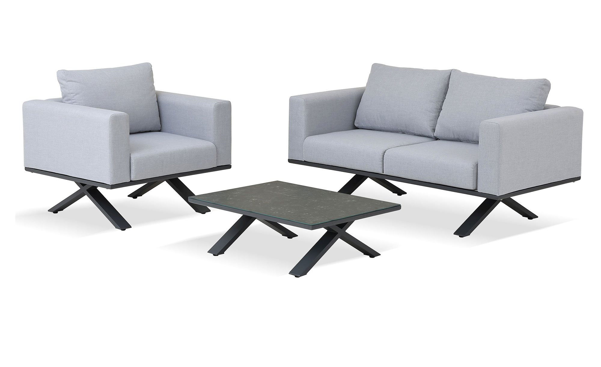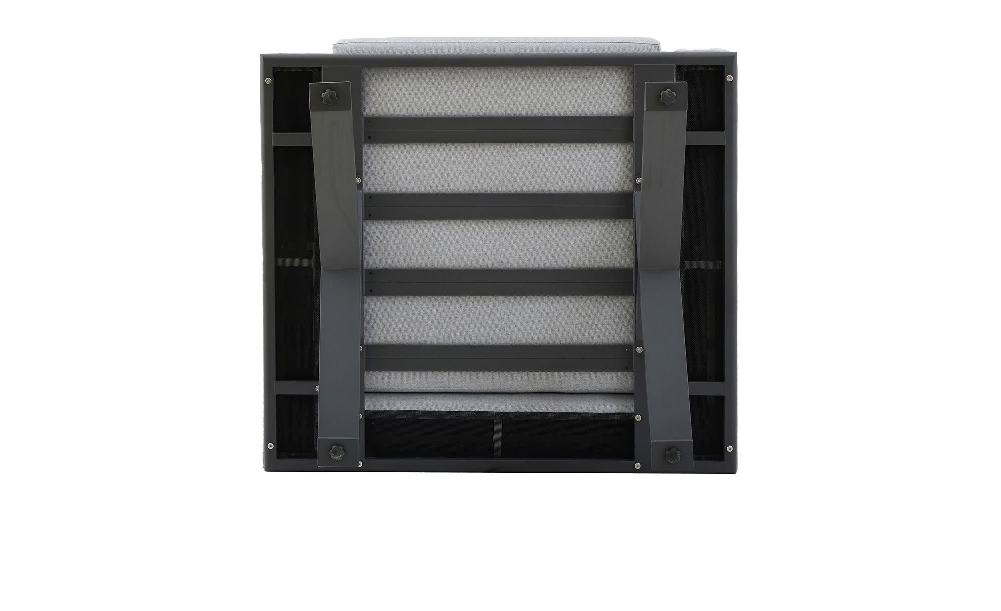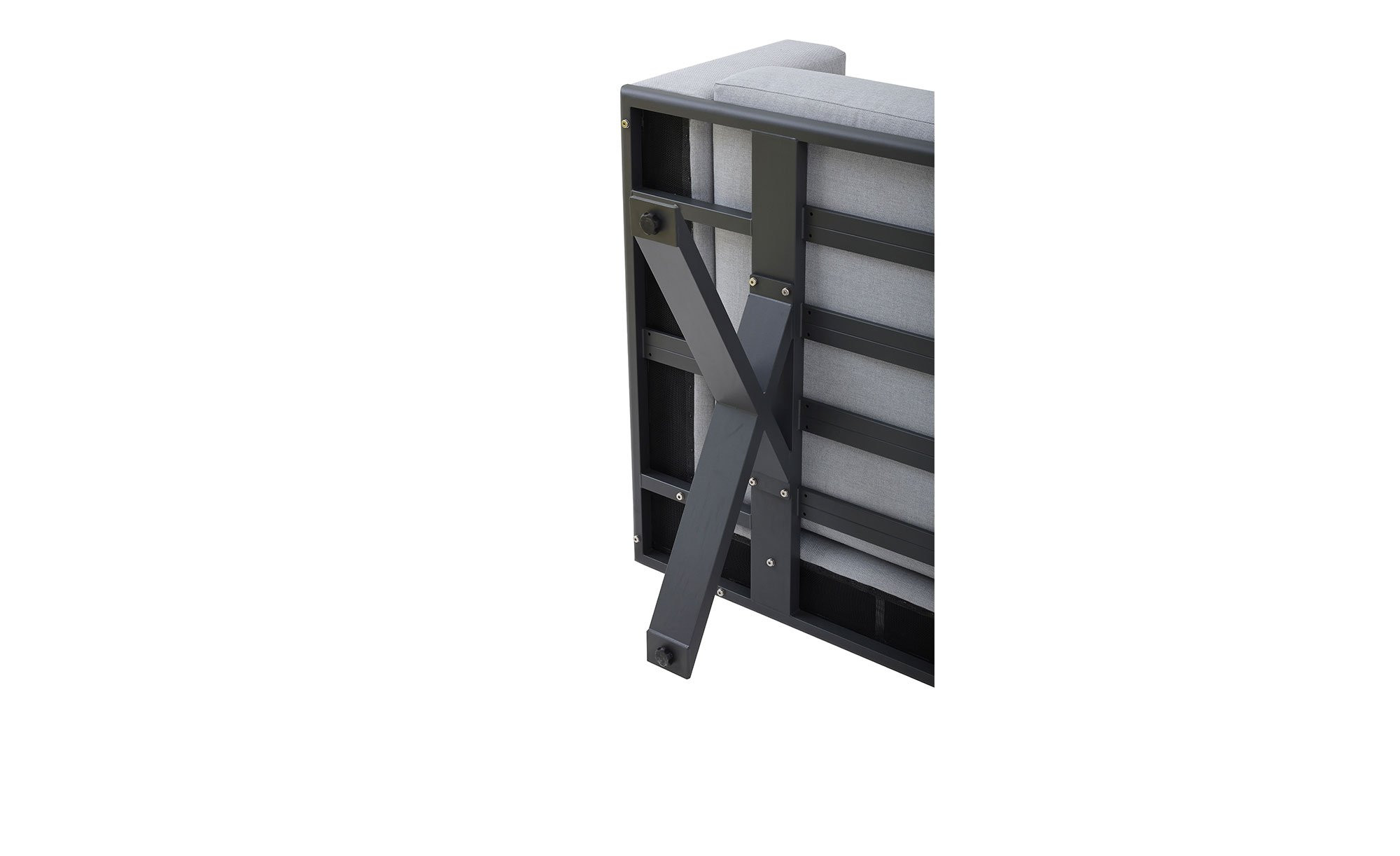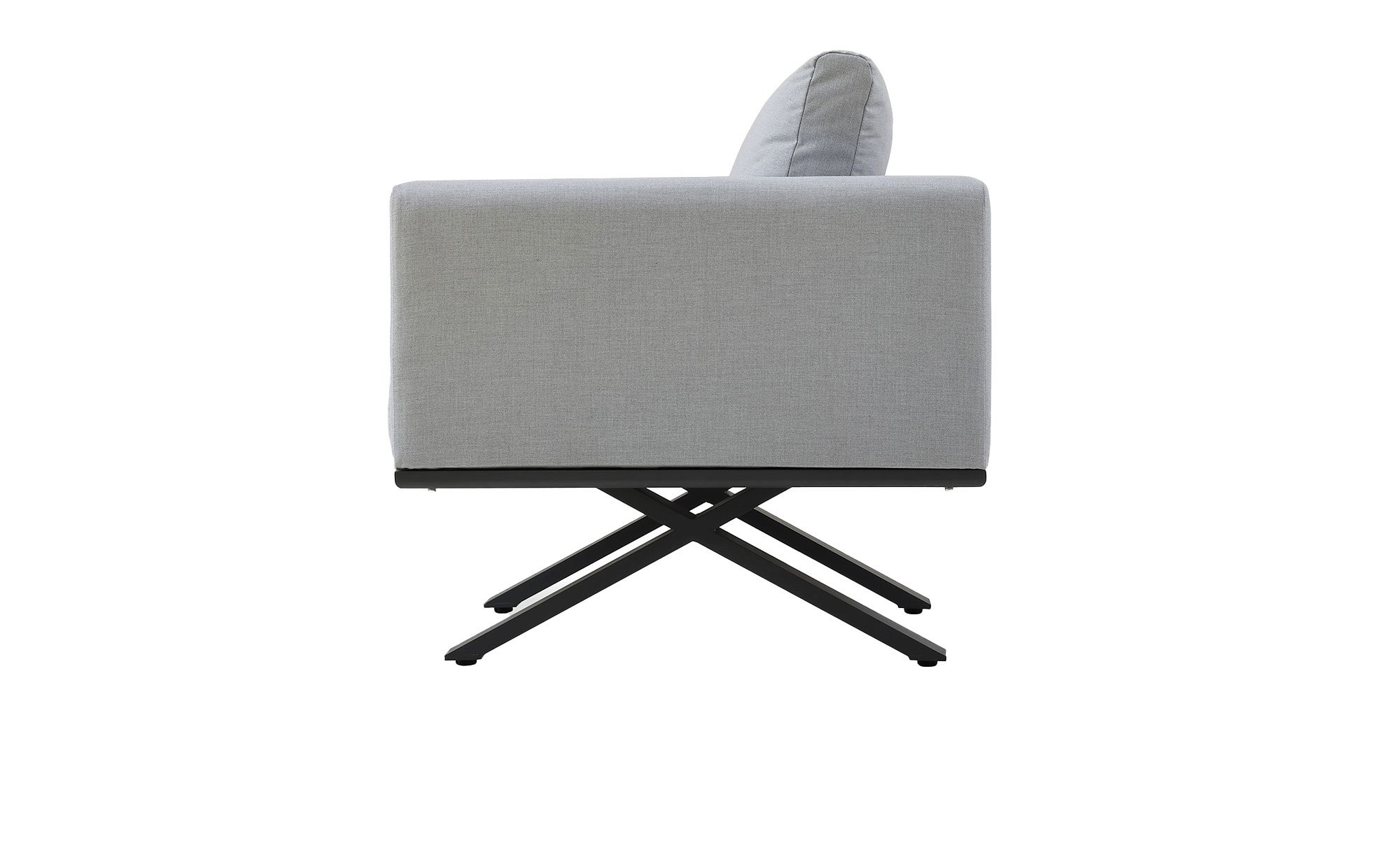 Ein pulverbeschichtetes Aluminium-Gestell in Anthrazit bildet die stabile Basis des ca. 91 x 67 x 80 cm großen Gartenmöbels von outdoor. Es verfügt links und rechts des besonders tiefen Sitzbereichs über Armlehnen mit schnell trocknendem Schaum. Rundum wurde hier zudem ein grauer Bezug aus Spinnpolyester verarbeitet.